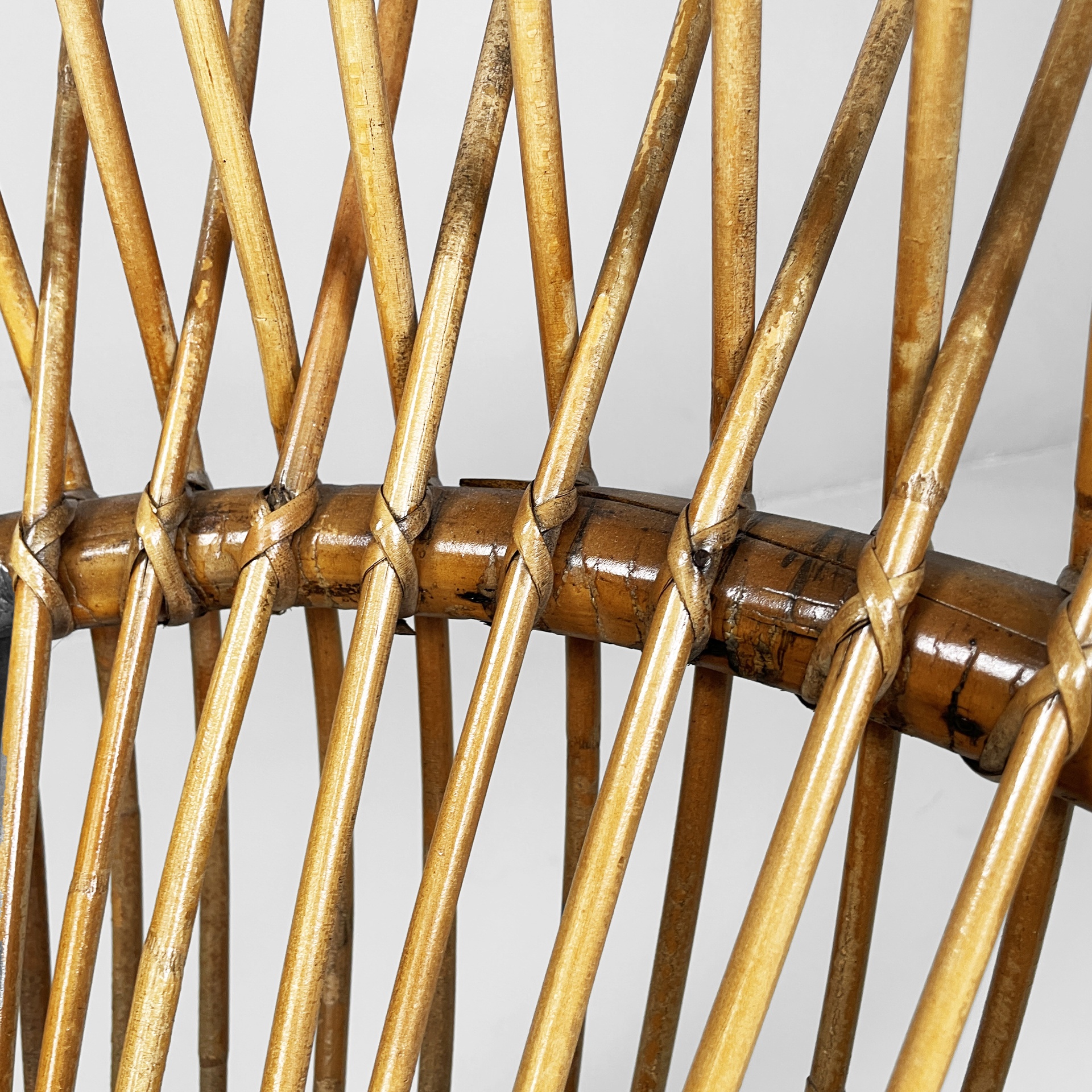 Buone condizioni. Leggeri segni del tempo sparsi. Il cuscino è rifatto a nuovo. Un listello di rattan presenta una rottura.
