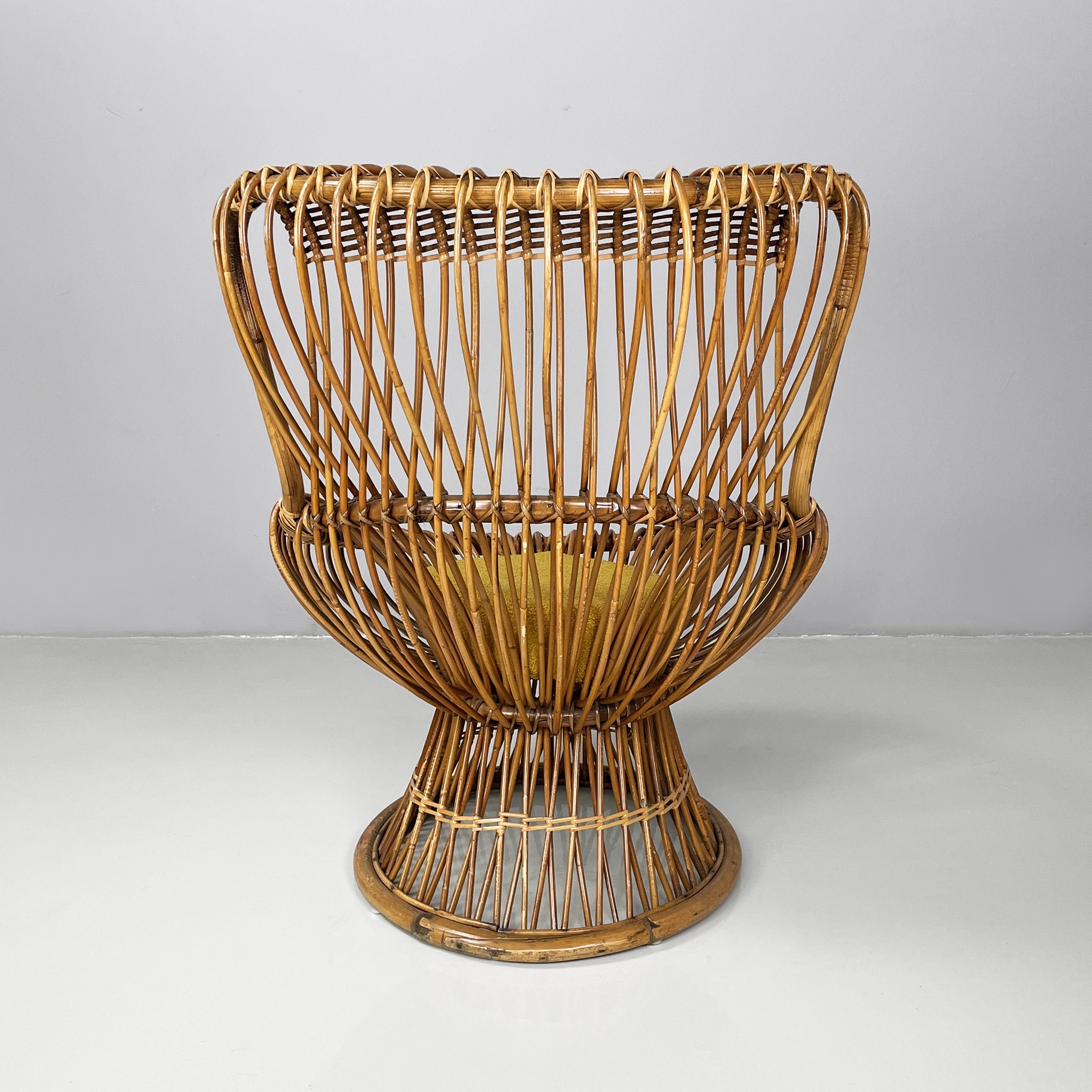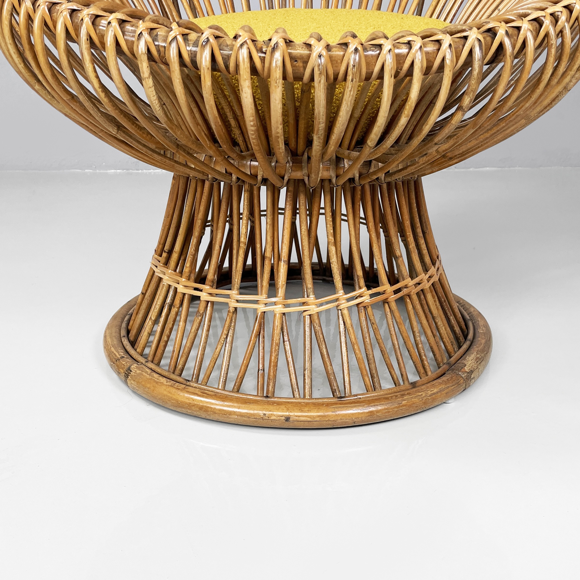 Poltrona modello Margherita con schienale e seduta composti da rattan curvato e intrecciato. Al centro della seduta è presente un cuscino tondo in tessuto giallo brillante. La base tonda è anche essa in rattan curvato e intrecciato.