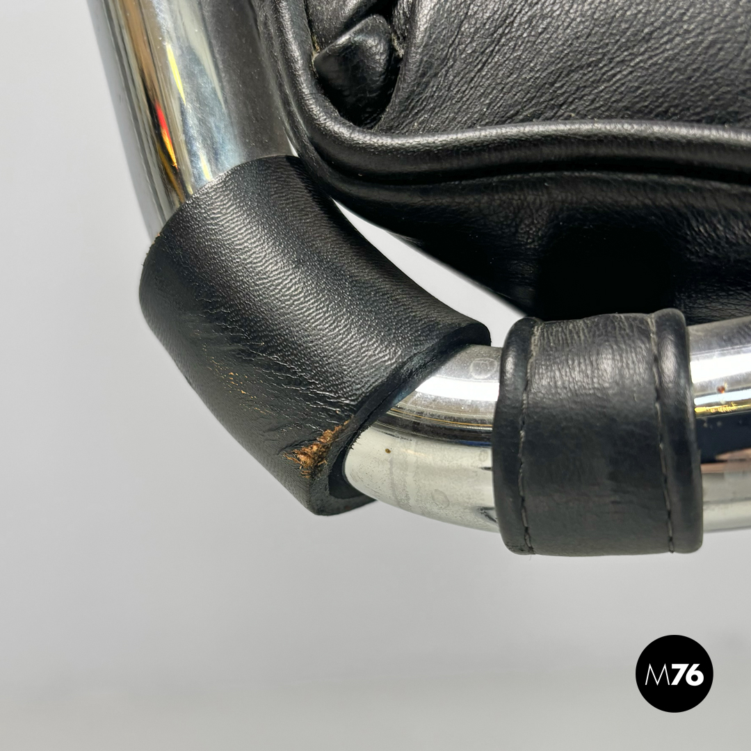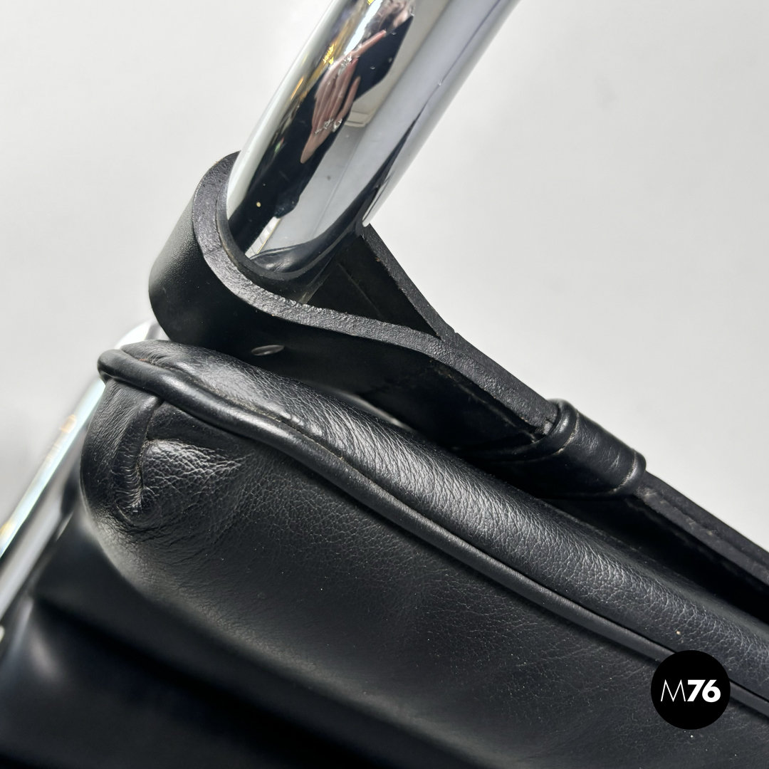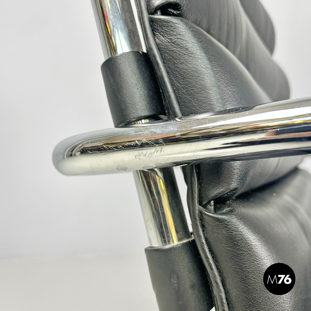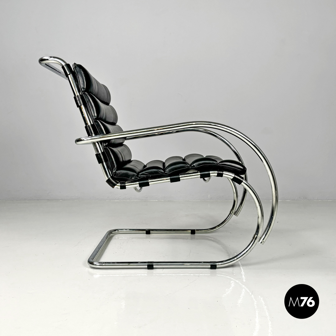 Poltrona modello MR40 in pelle nera. La seduta e lo schienale sono composti da un’unico cuscino con cuciture orizzontali. La struttura è in tubolare di metallo cromato e segue linee curve e tondeggianti, formando una maniglia dietro lo schienale, i due braccioli e le gambe.