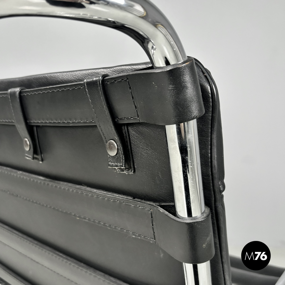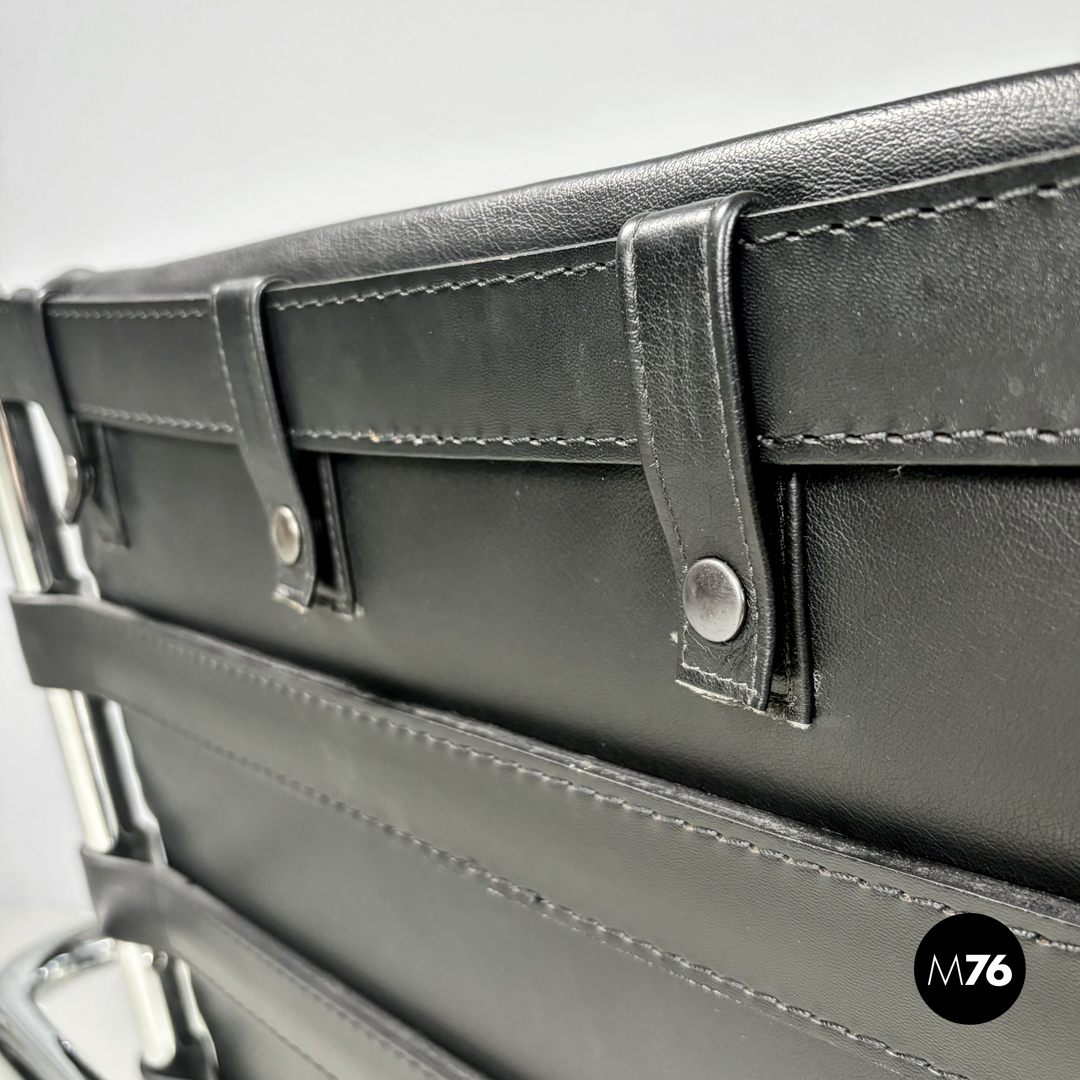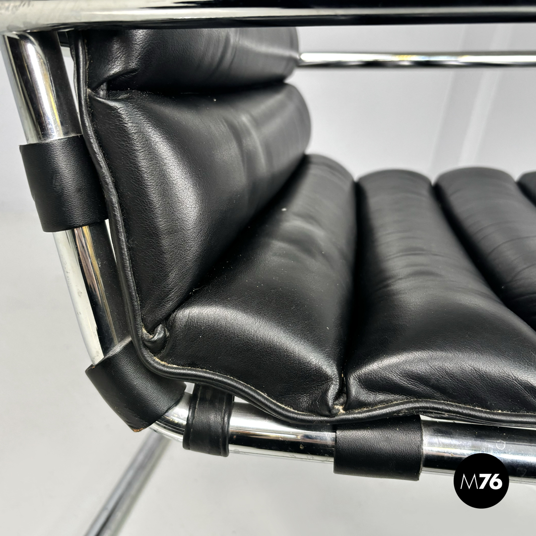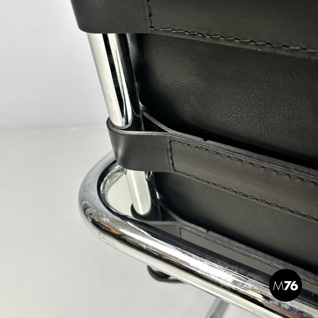 Poltrona modello MR40 in pelle nera. La seduta e lo schienale sono composti da un’unico cuscino con cuciture orizzontali. La struttura è in tubolare di metallo cromato e segue linee curve e tondeggianti, formando una maniglia dietro lo schienale, i due braccioli e le gambe.