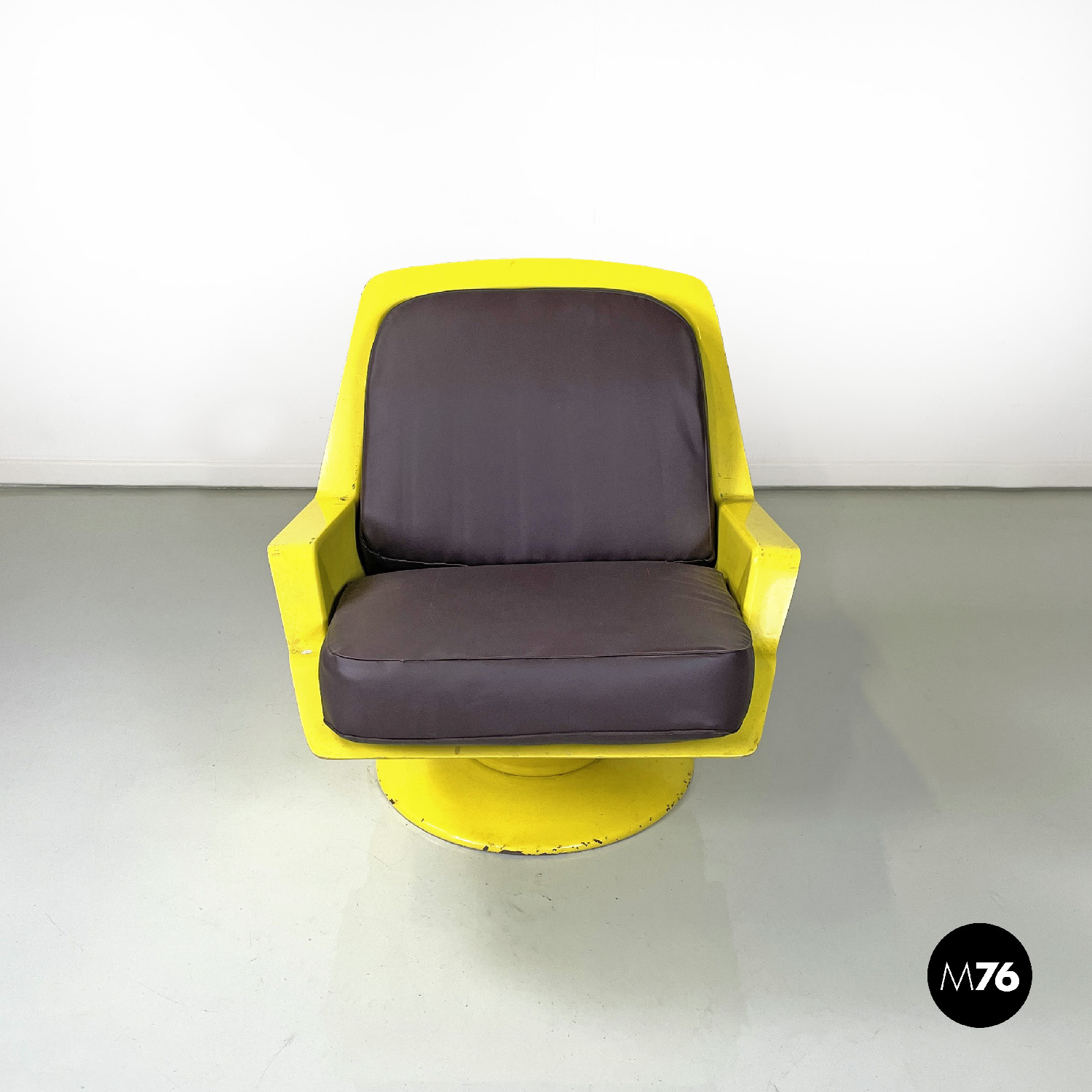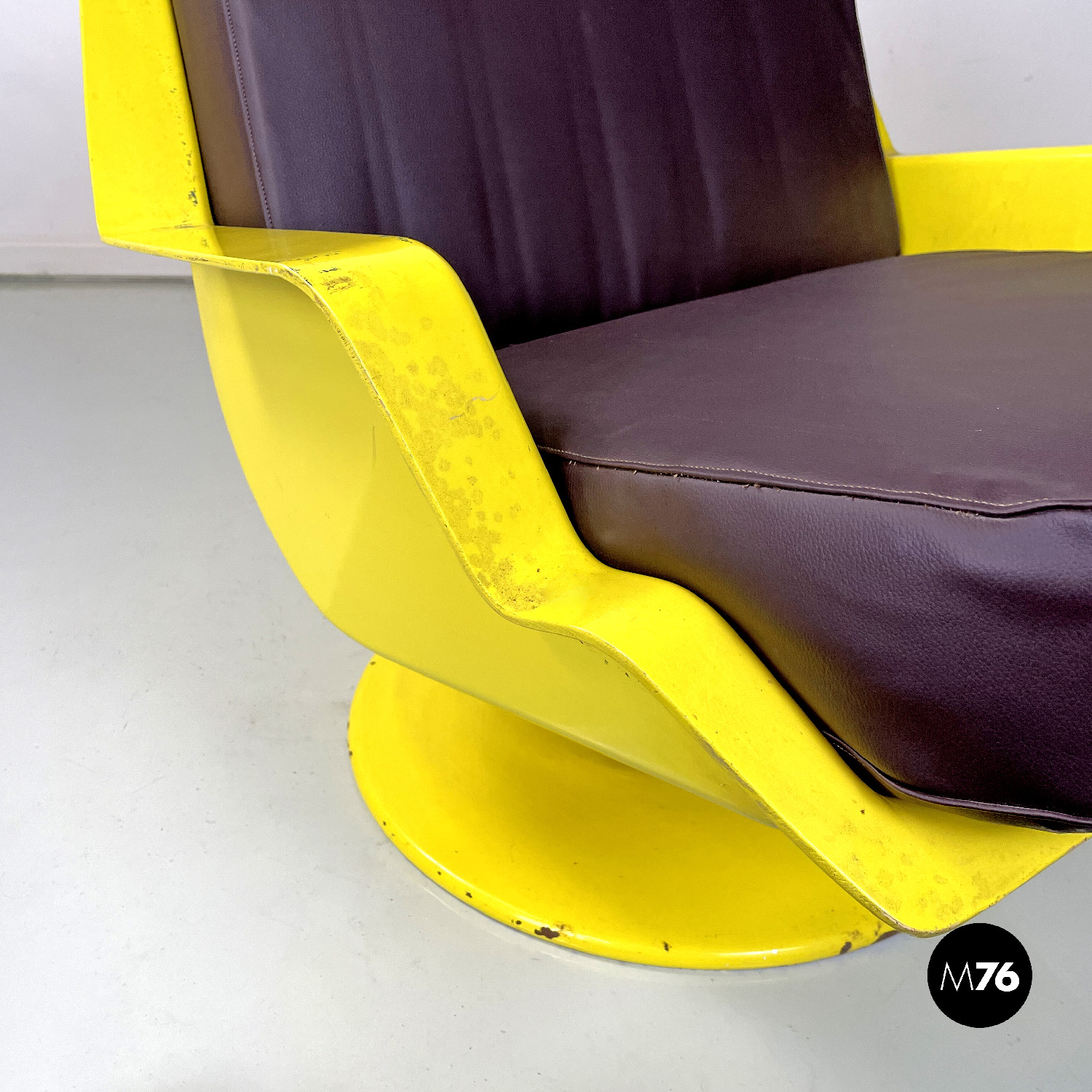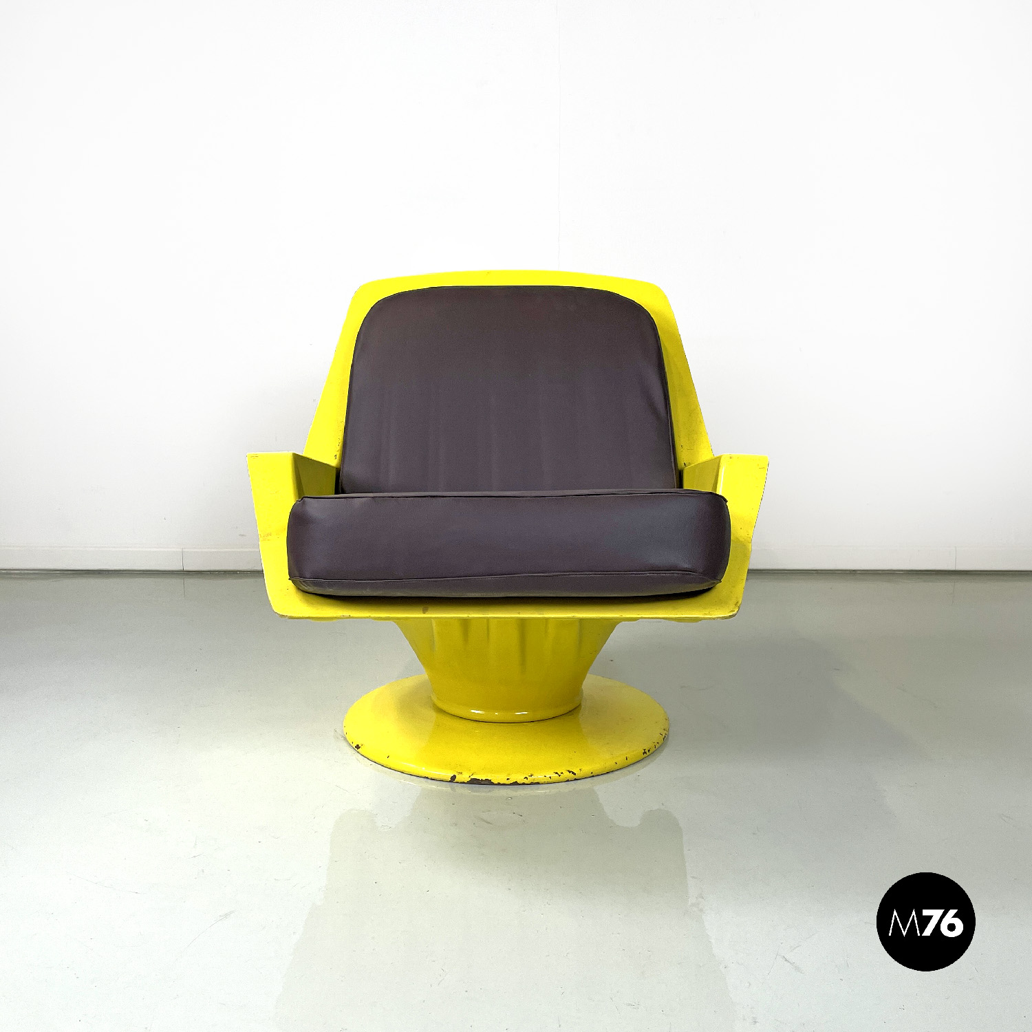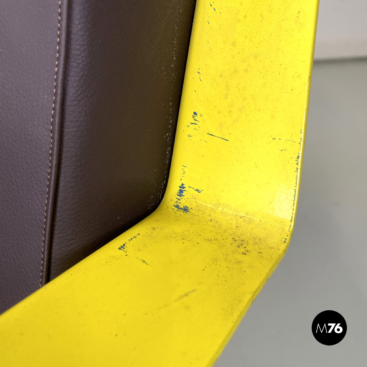 Poltrona modello Nike con struttura esterna in metallo verniciato giallo. La struttura poggia su una base tonda e forma i braccioli, la seduta e lo schienale. Presenta due cuscini imbottiti e rivestiti di similpelle marrone.