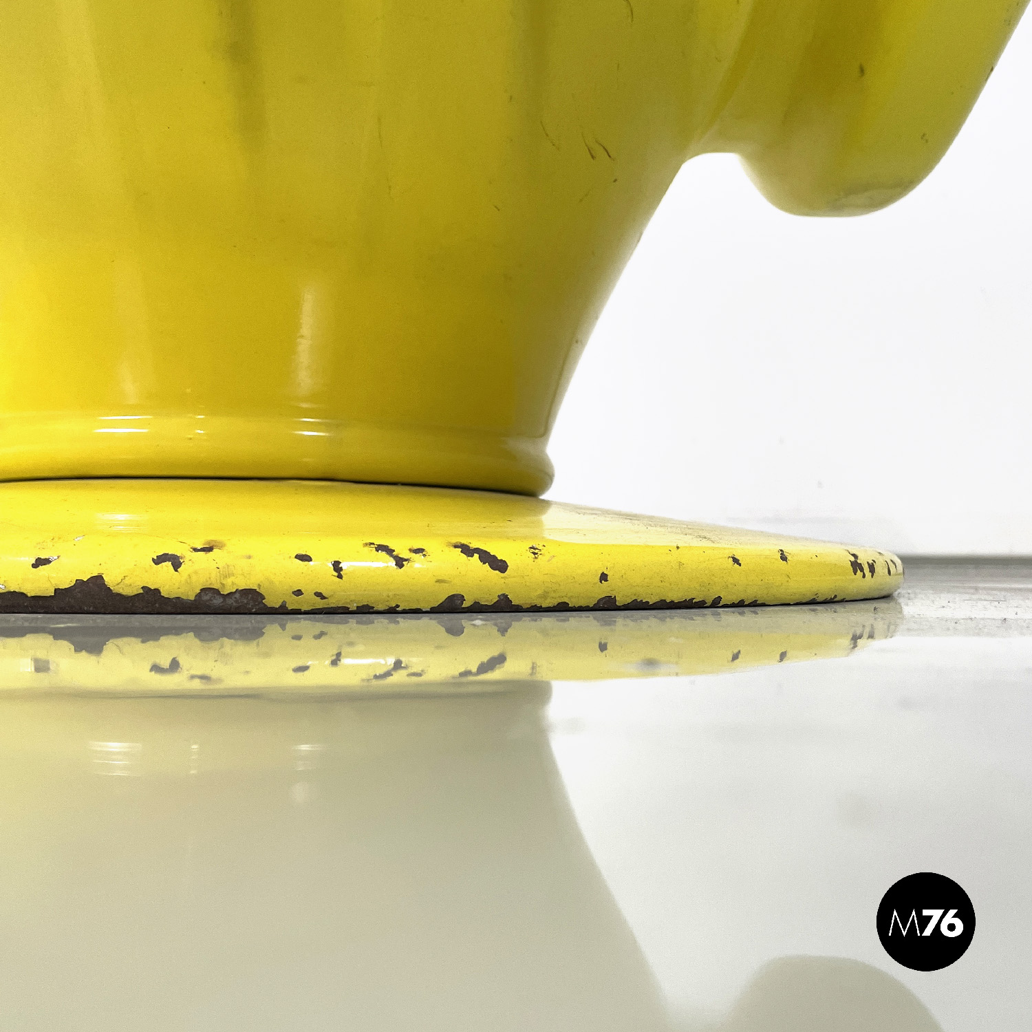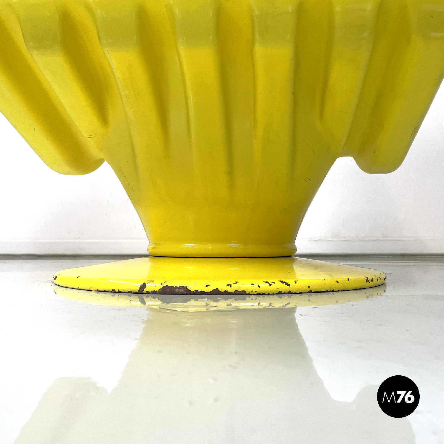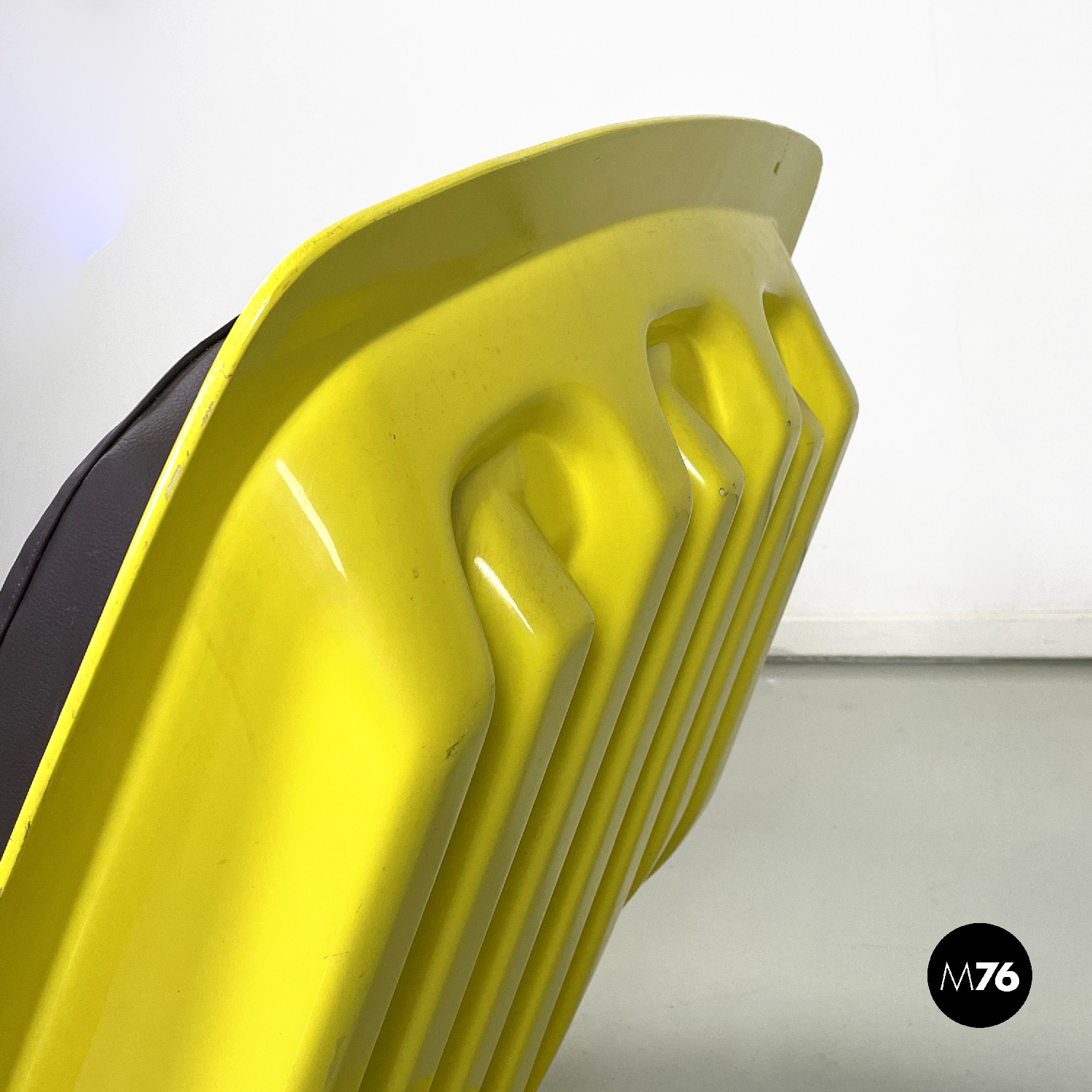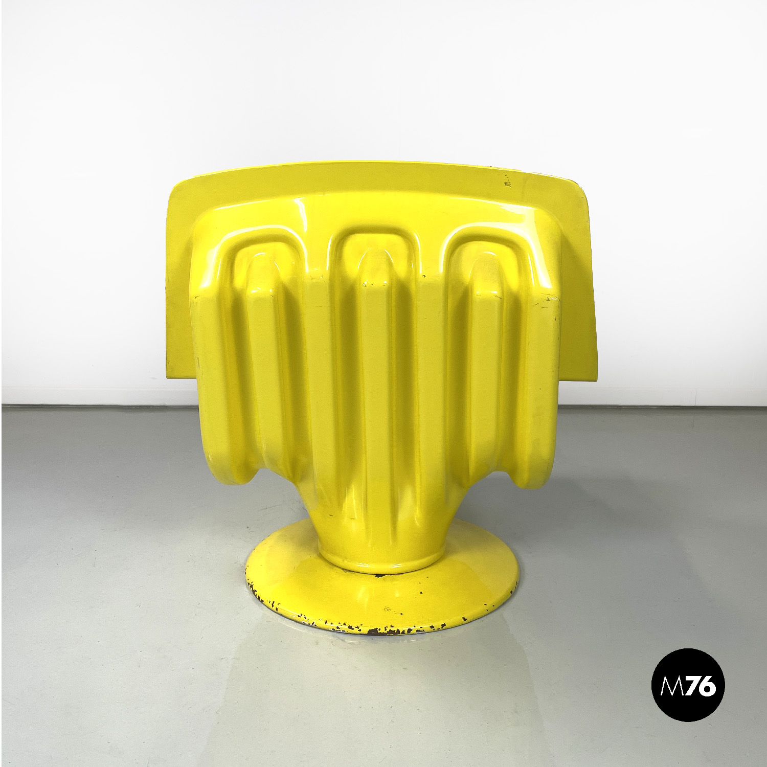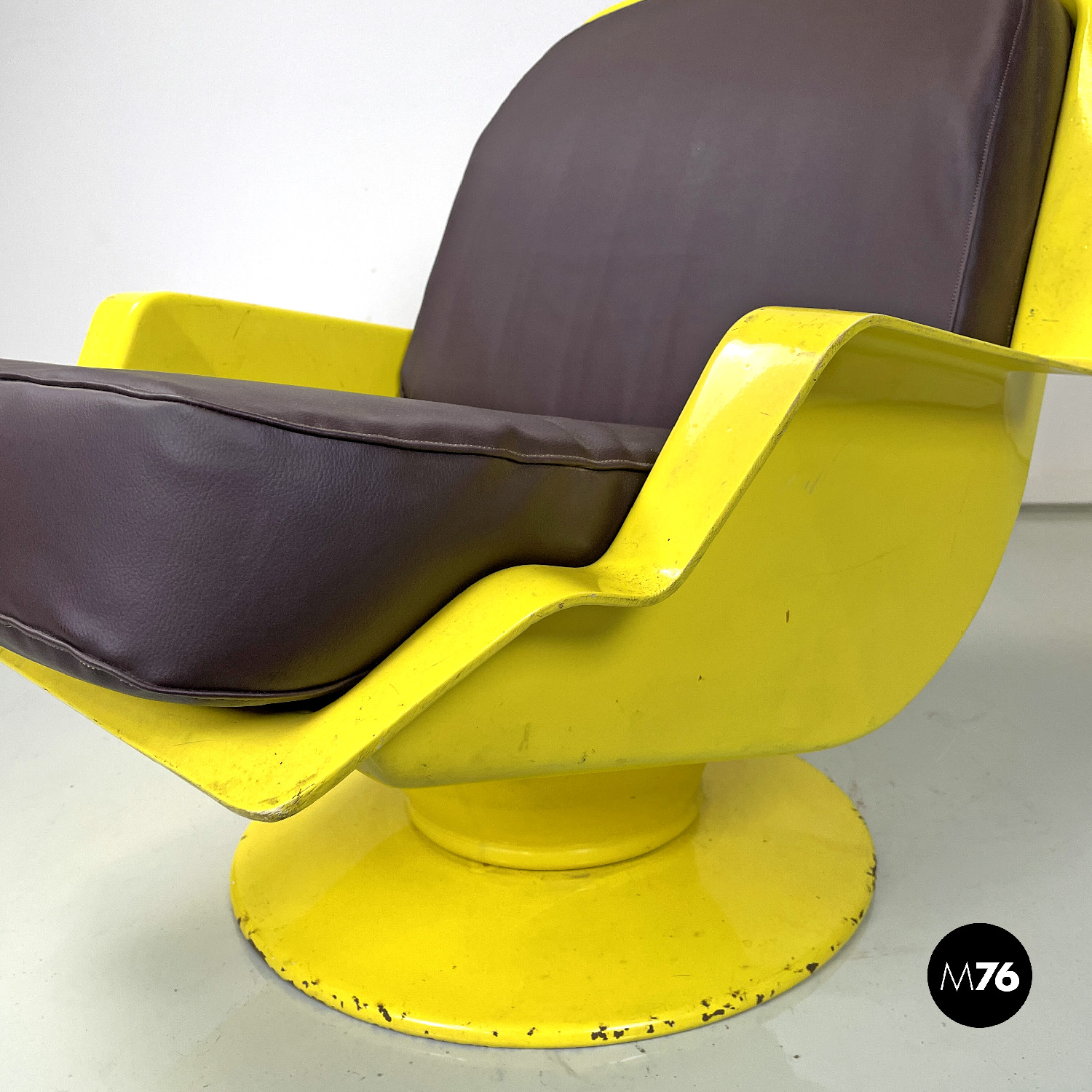 Poltrona modello Nike con struttura esterna in metallo verniciato giallo. La struttura poggia su una base tonda e forma i braccioli, la seduta e lo schienale. Presenta due cuscini imbottiti e rivestiti di similpelle marrone.