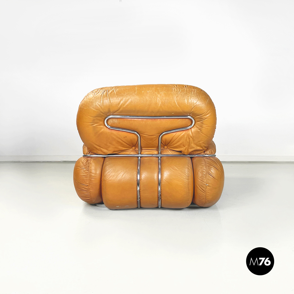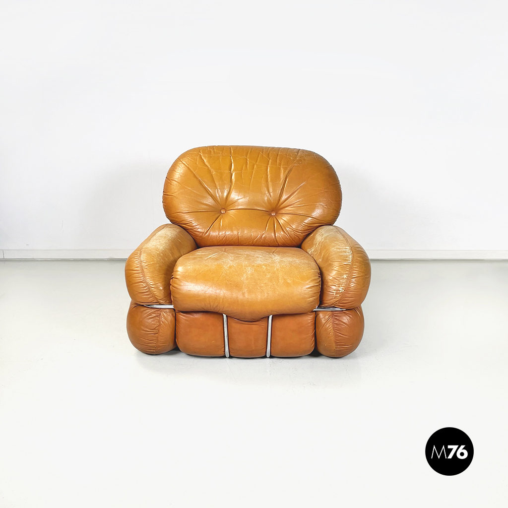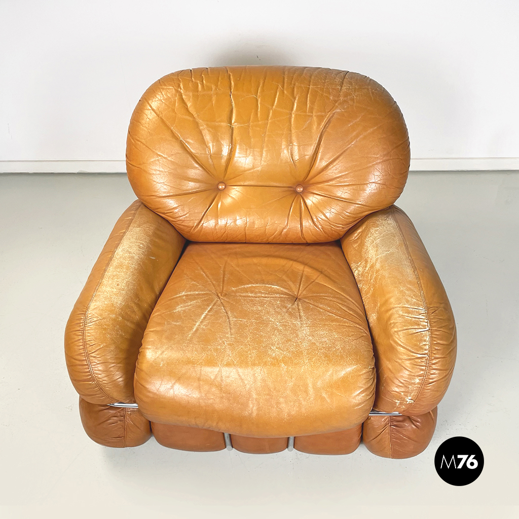 Poltrona modello Okay con imbottitura contenuta da elementi in tondino di acciaio cromato e rivestimento in pelle marrone. Bottoni presenti sulla seduta e sullo schienale.