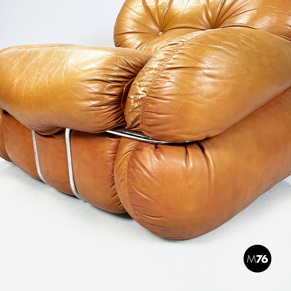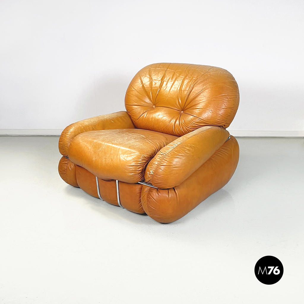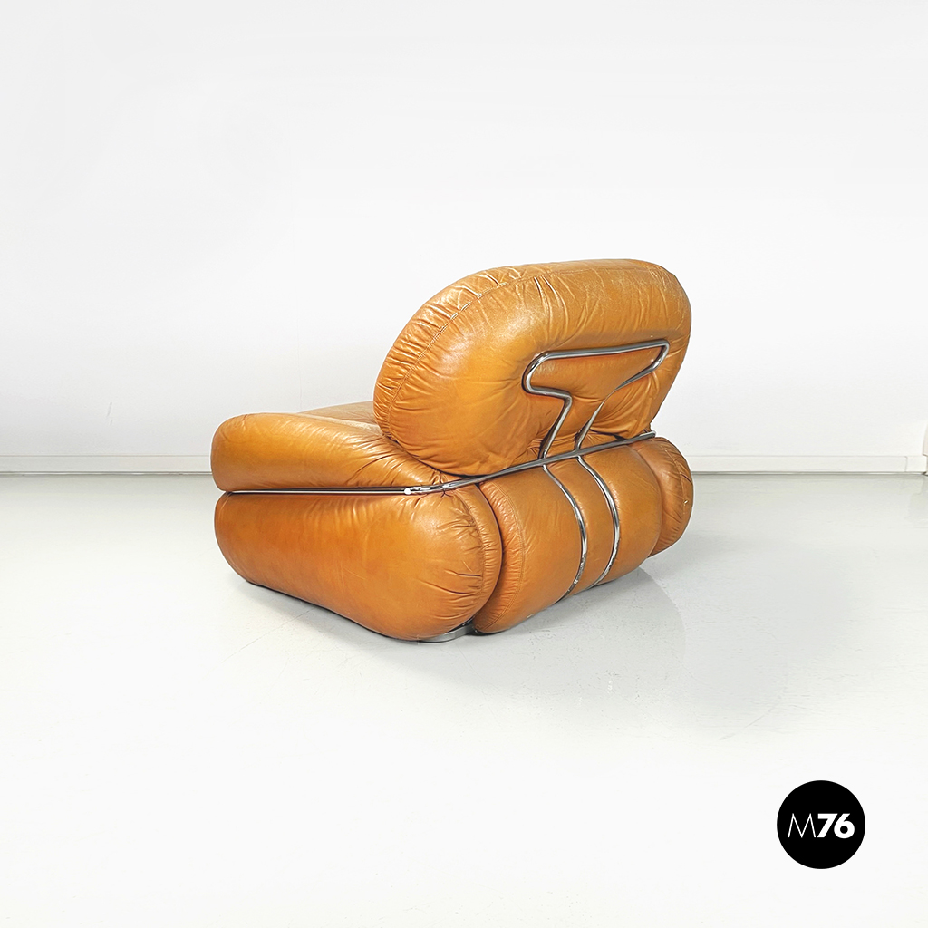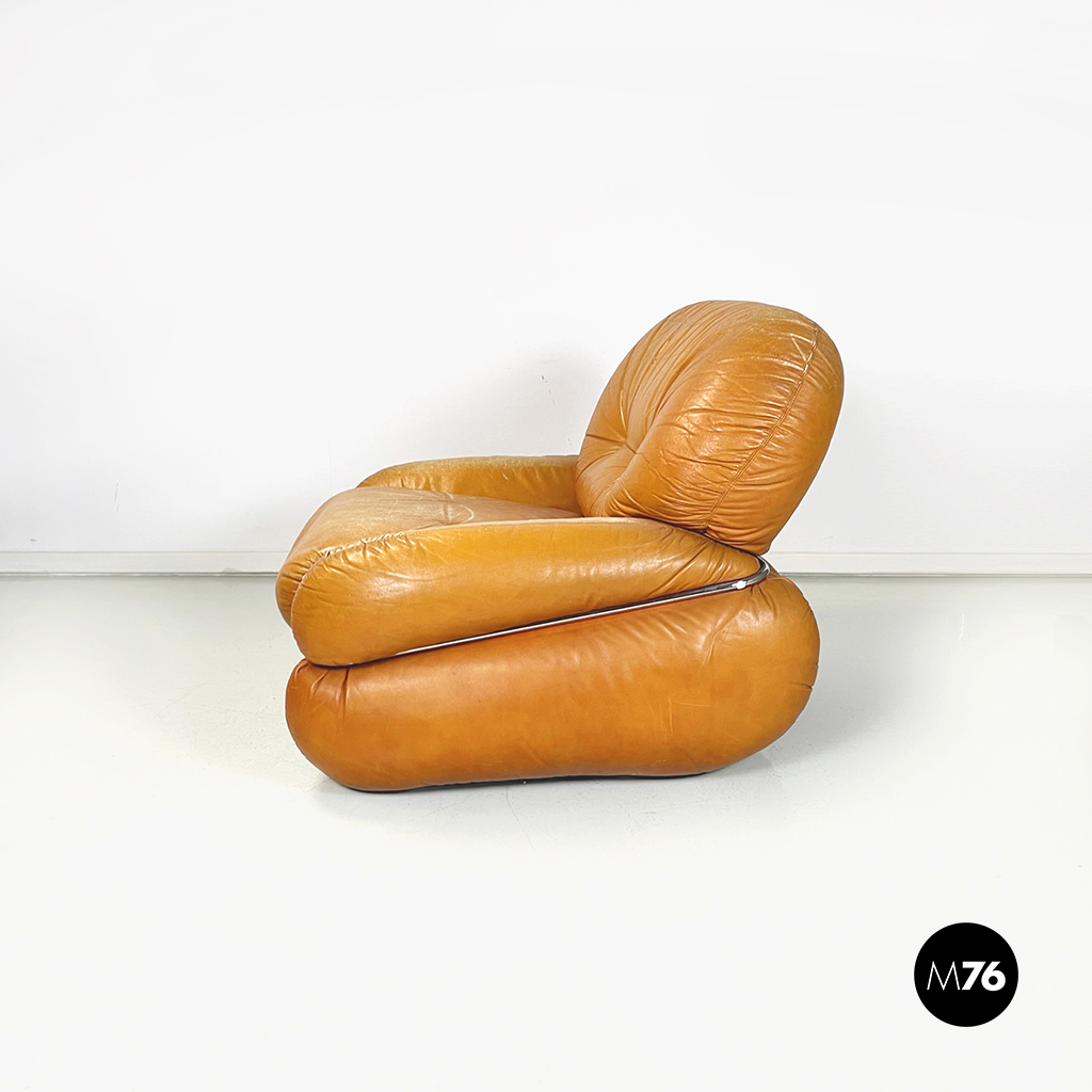 Poltrona modello Okay con imbottitura contenuta da elementi in tondino di acciaio cromato e rivestimento in pelle marrone. Bottoni presenti sulla seduta e sullo schienale.