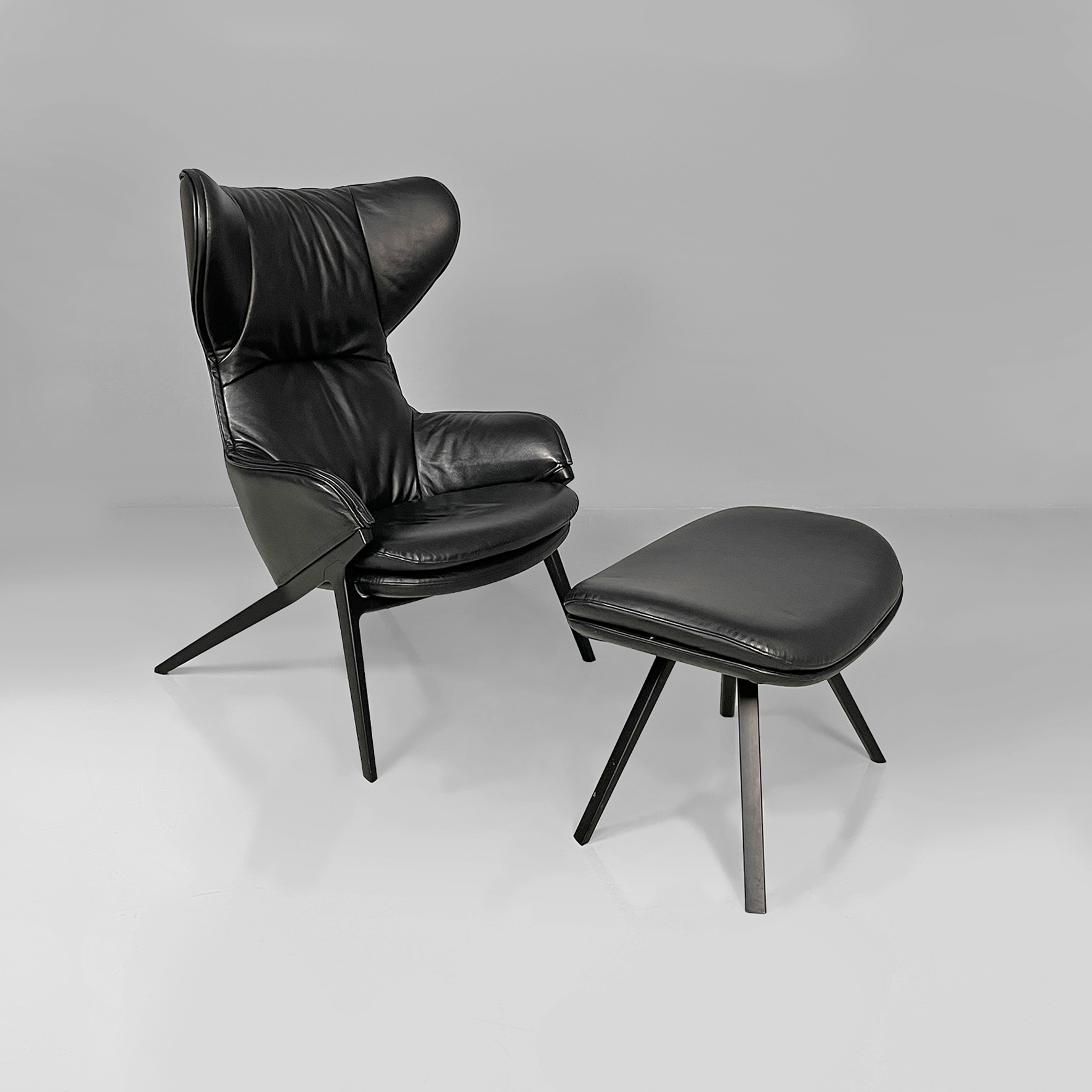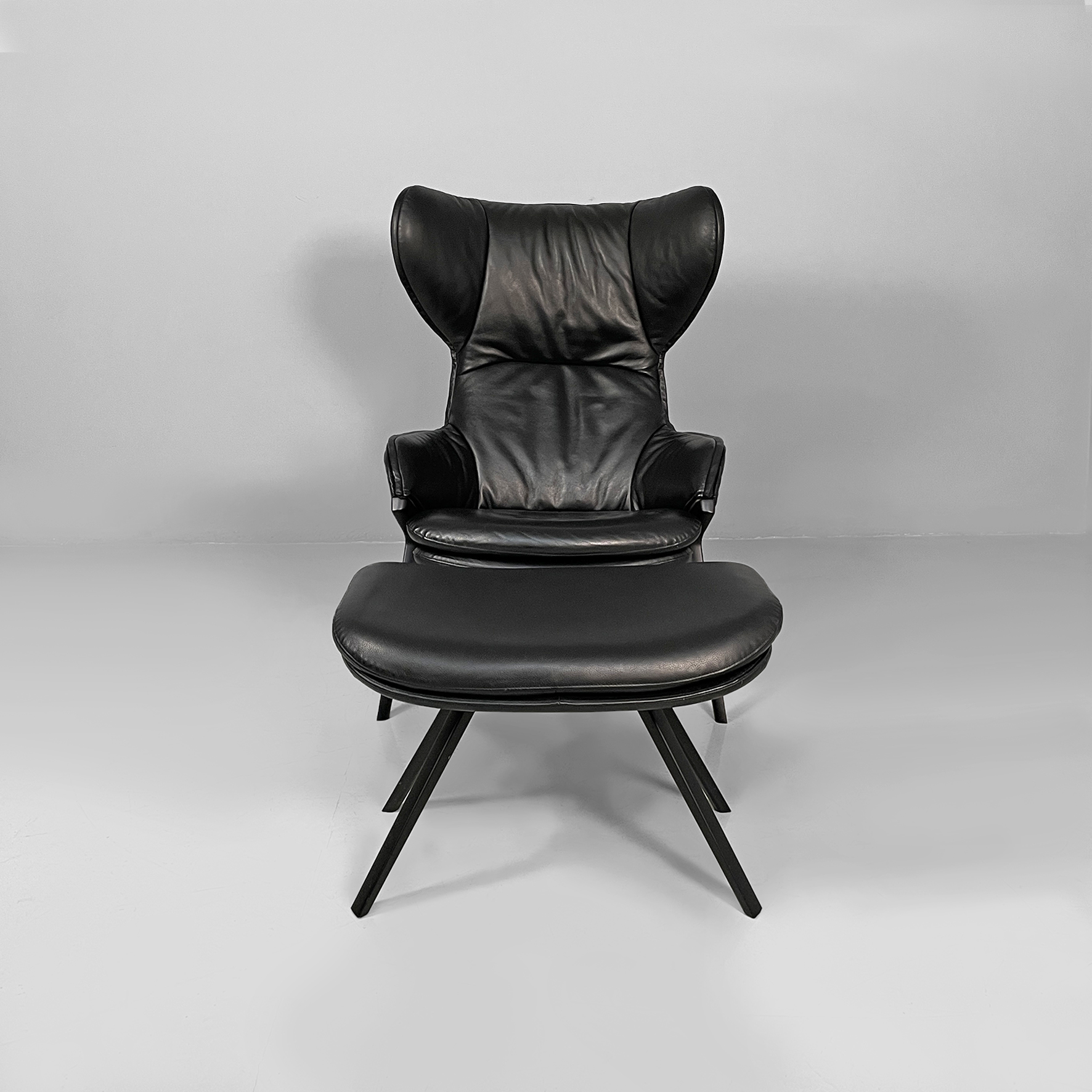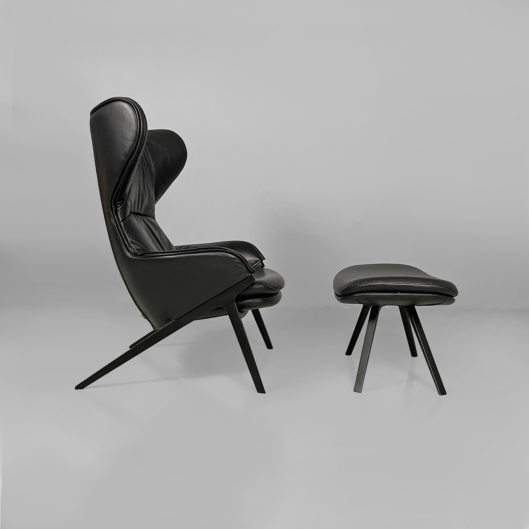 Poltrona modello P22 con poggiapiedi coordinato. La poltrona è imbottita e rivestita in pelle nera liscia. Lo schienale alto ha un forma con alette laterali che avvolgono, stile wing chair. La seduta è ampia e i braccioli sono integrati nella struttura, con un profilo morbido. Presenta quattro gambe sottili e inclinate in metallo scuro. Il pouf coordinato con la poltrona, è rivestito nello stesso materiale e imbottito. La forma è rettangolare smussata. Le gambe sono inclinate come quelle della poltrona, in stile coerente.