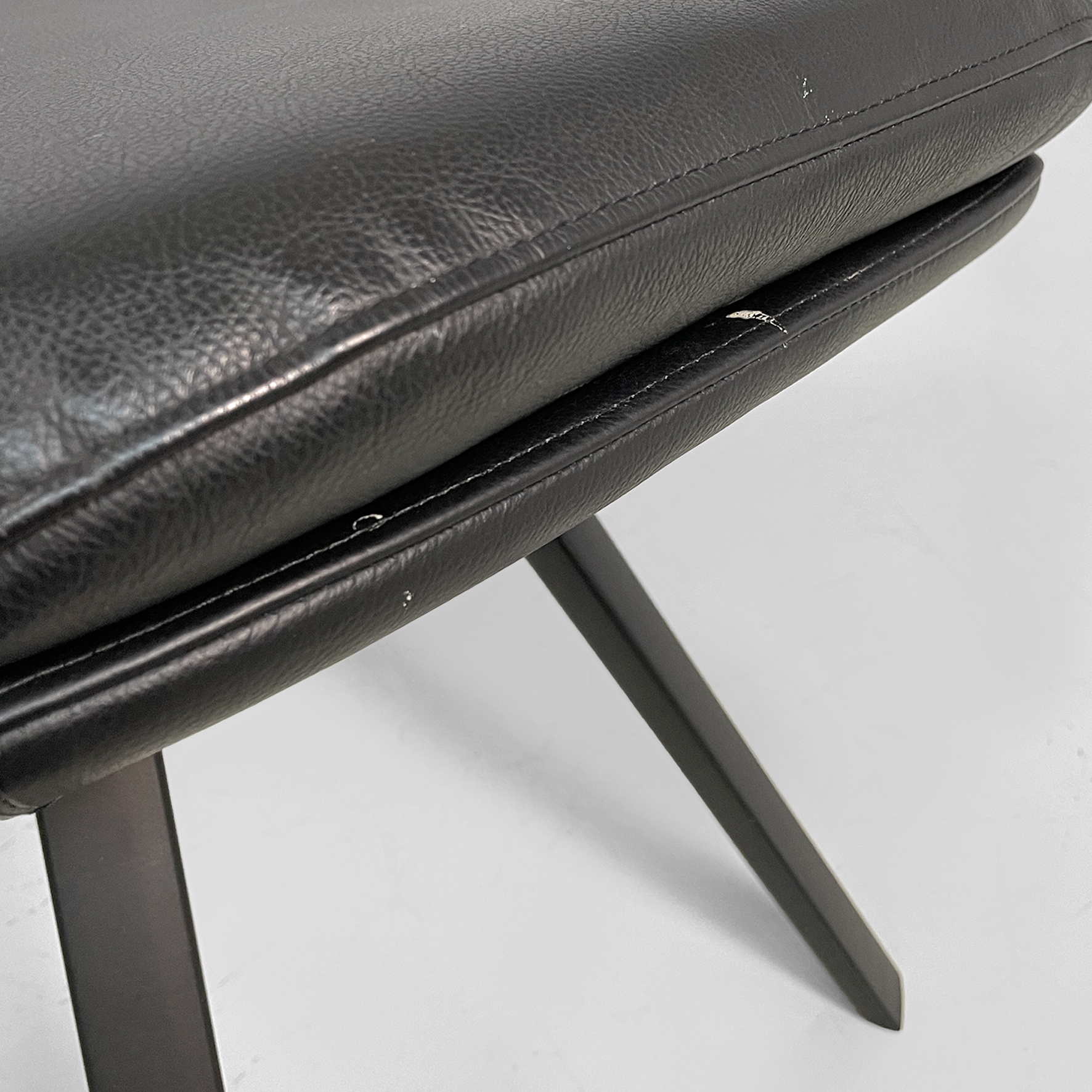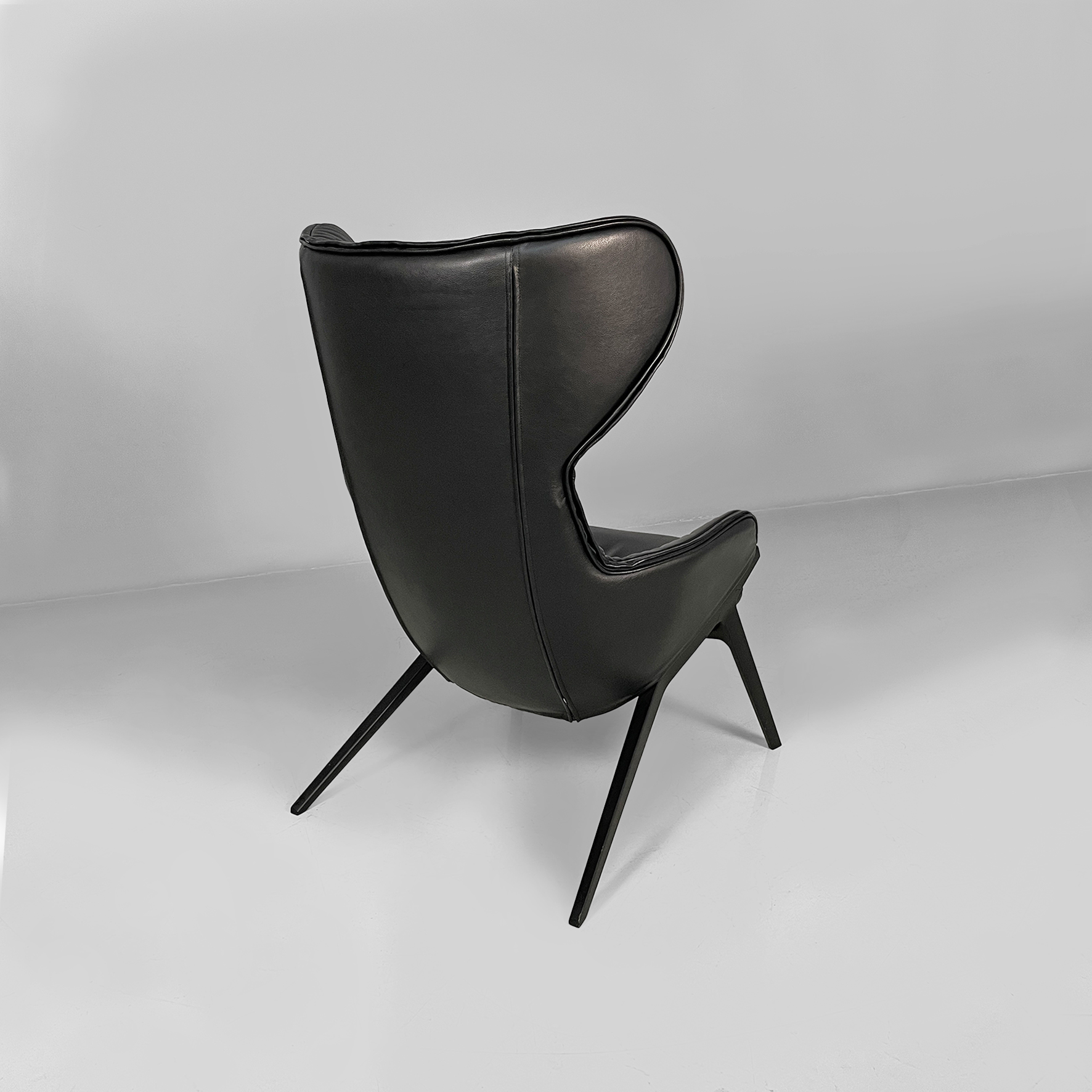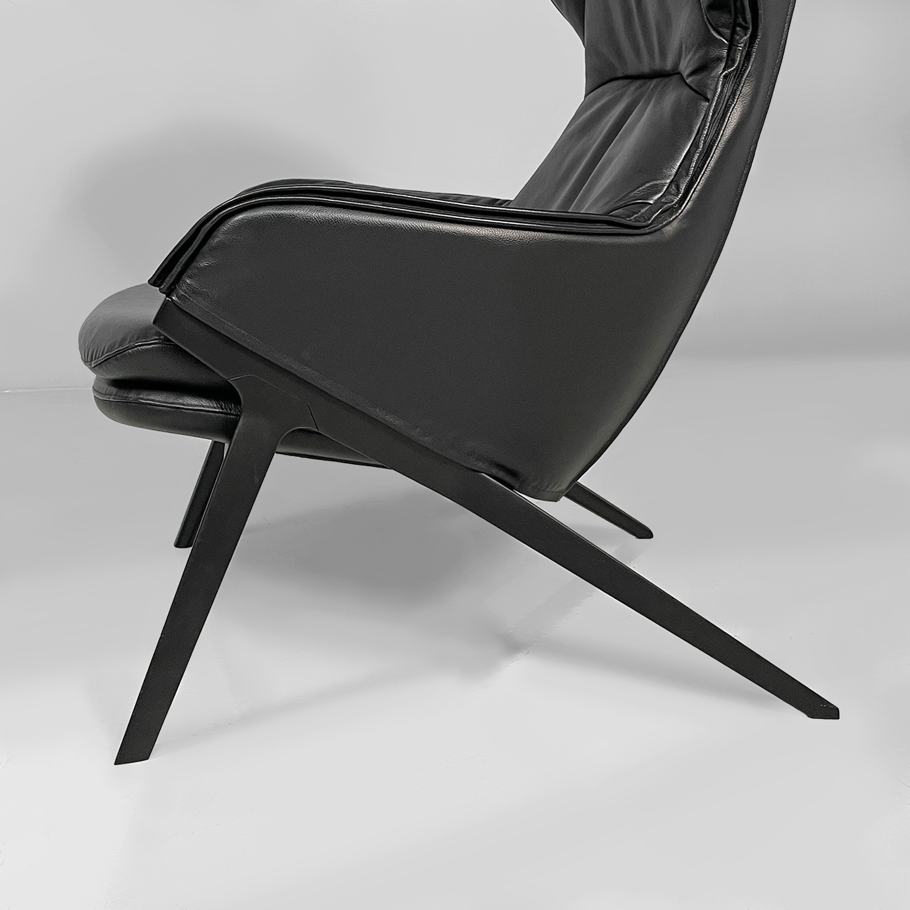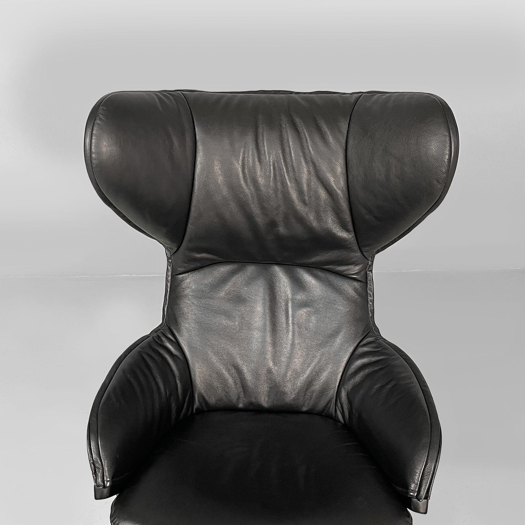 Poltrona modello P22 con poggiapiedi coordinato. La poltrona è imbottita e rivestita in pelle nera liscia. Lo schienale alto ha un forma con alette laterali che avvolgono, stile wing chair. La seduta è ampia e i braccioli sono integrati nella struttura, con un profilo morbido. Presenta quattro gambe sottili e inclinate in metallo scuro. Il pouf coordinato con la poltrona, è rivestito nello stesso materiale e imbottito. La forma è rettangolare smussata. Le gambe sono inclinate come quelle della poltrona, in stile coerente.