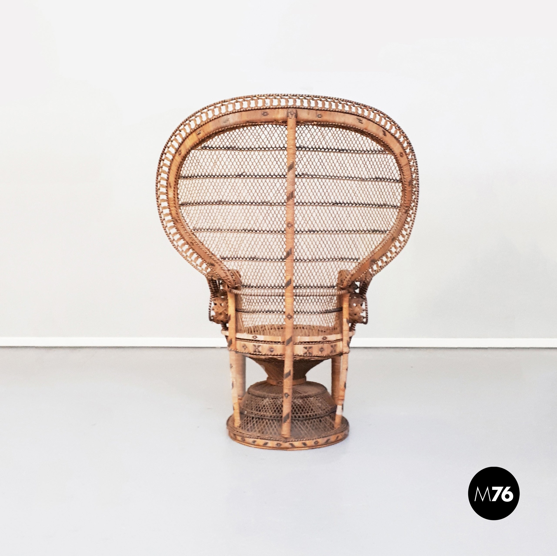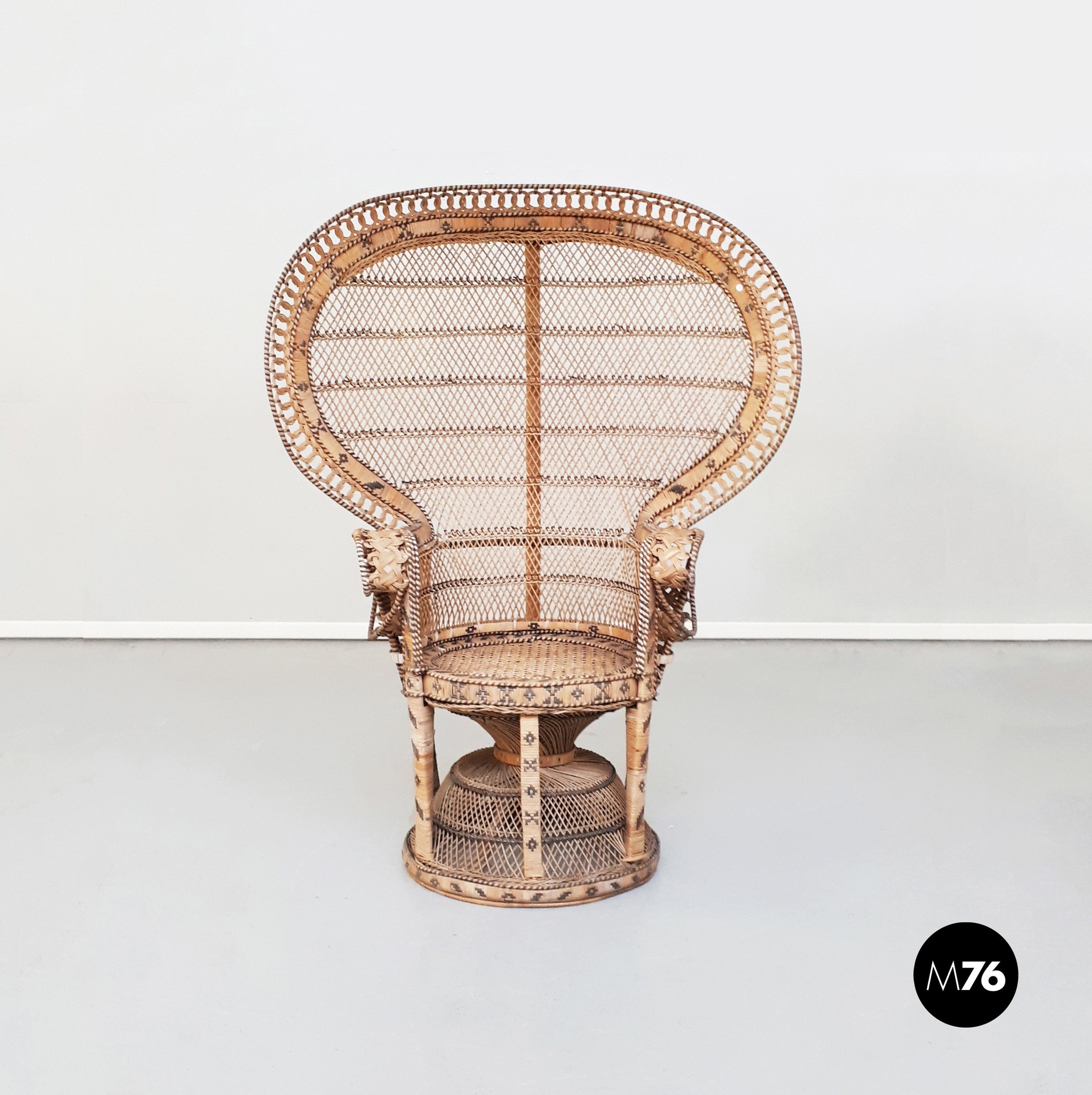 Poltrona modello Pavone in rattan e vimini finemente intrecciato.
