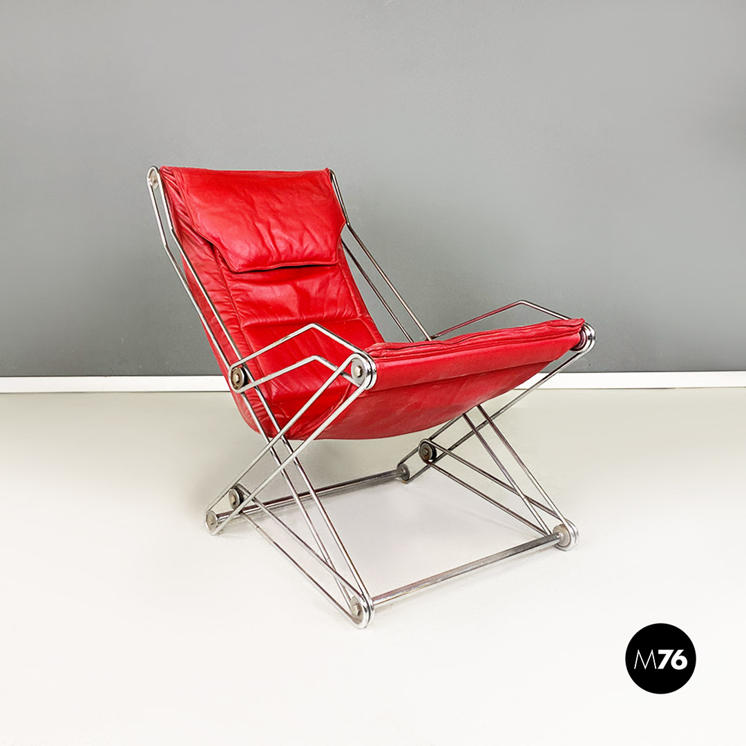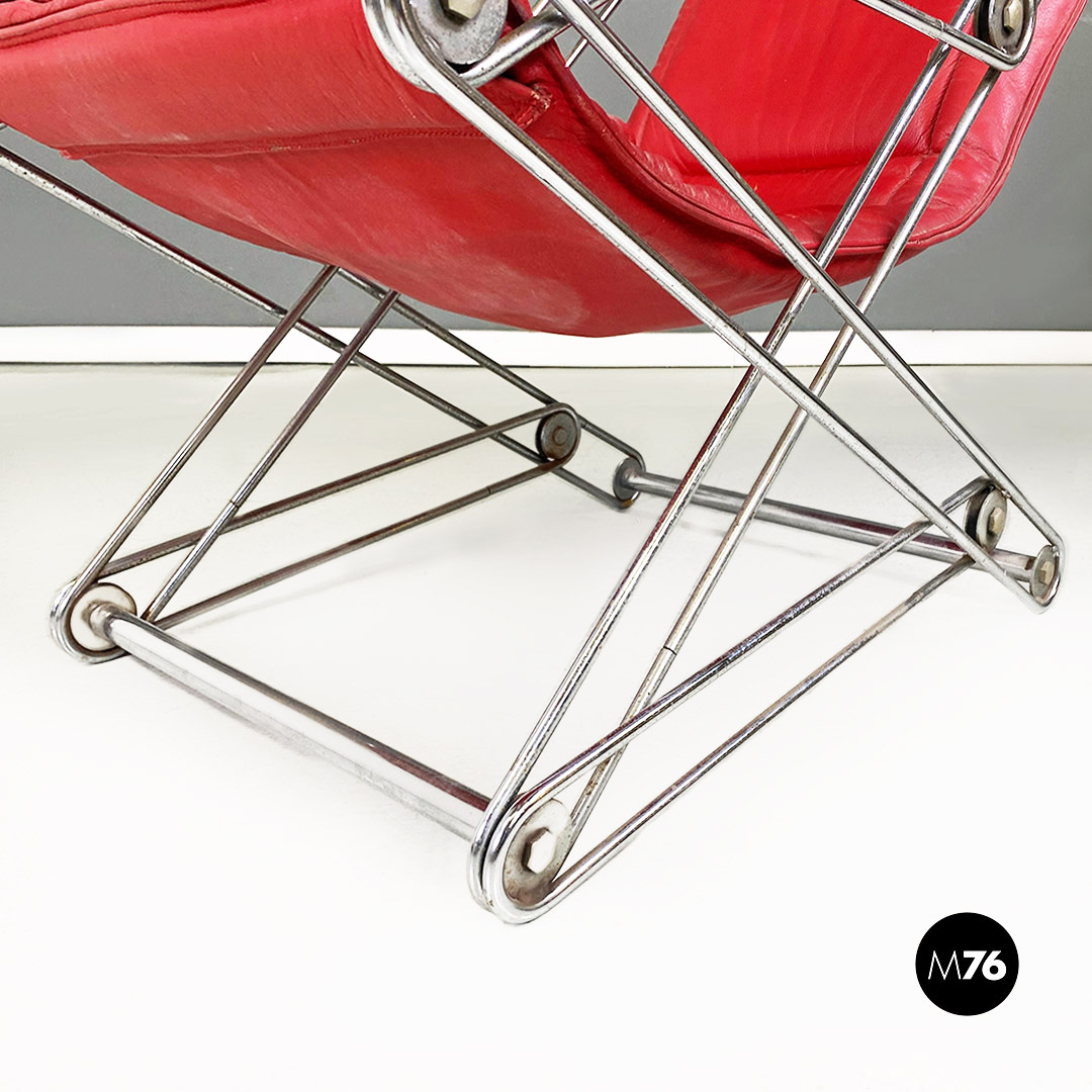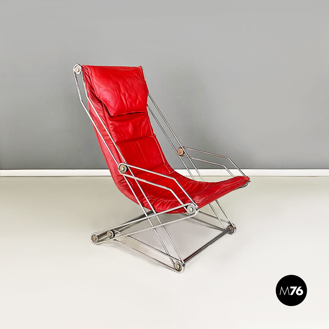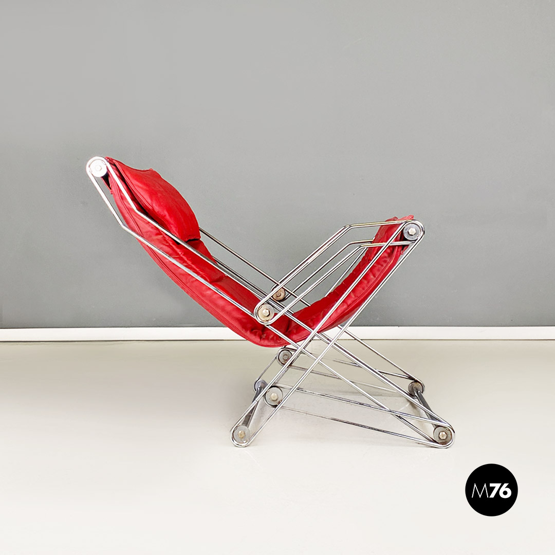 Poltrona pieghevole con struttura in tondino di acciaio cromato con distensione regolabile e con cuscino originale in sky rosso, con poggiatesta.