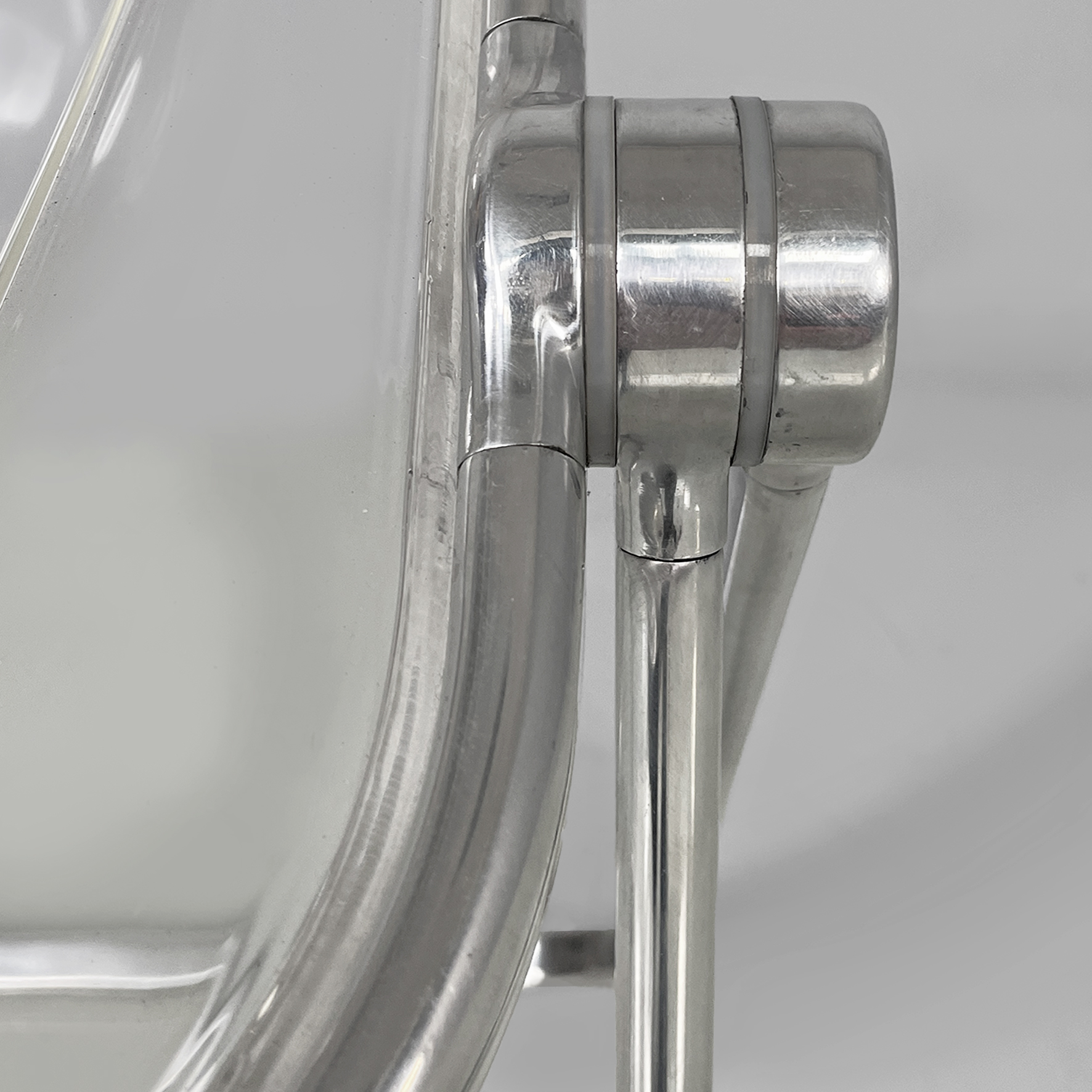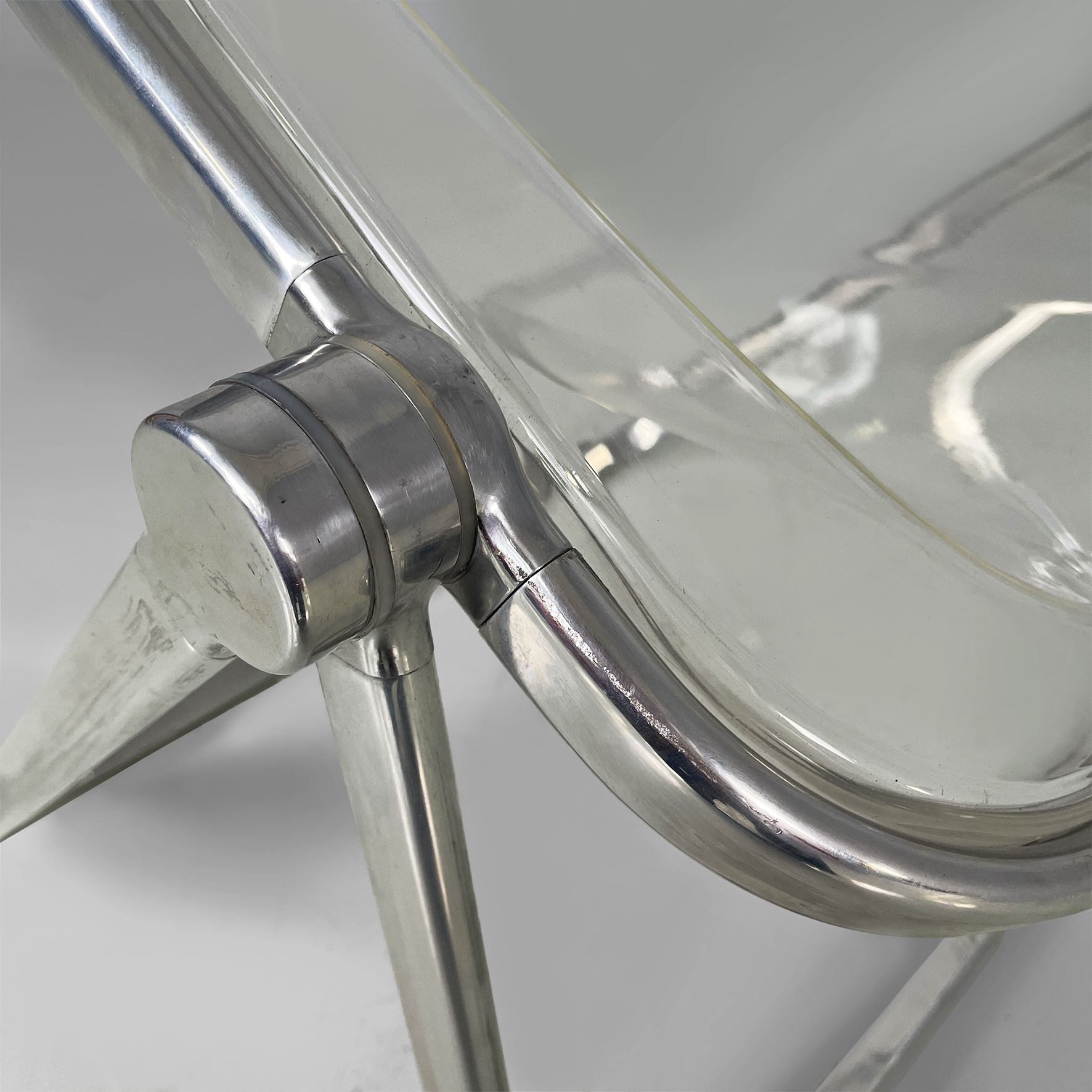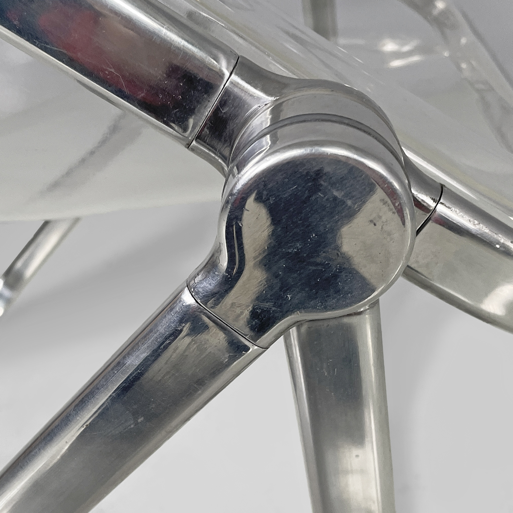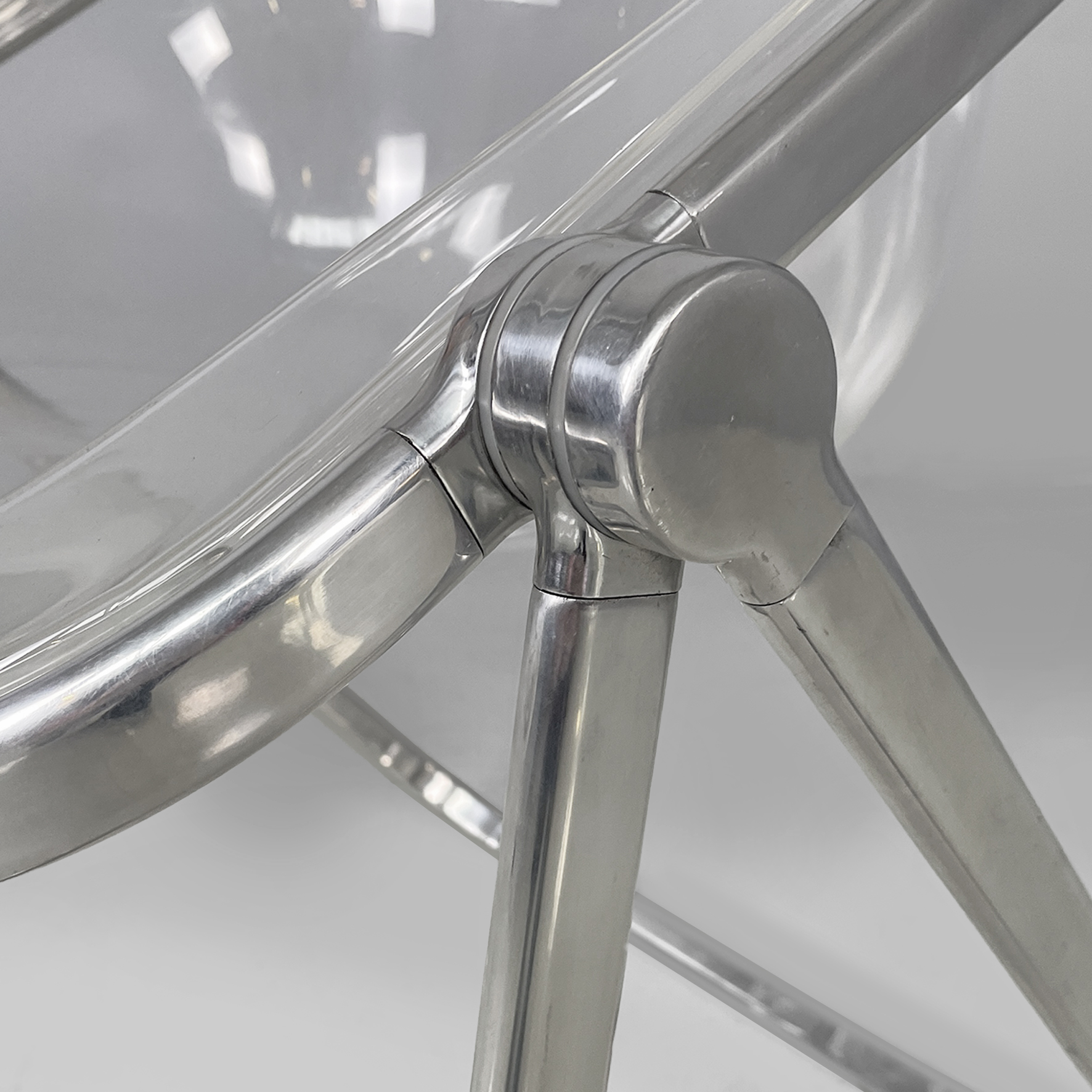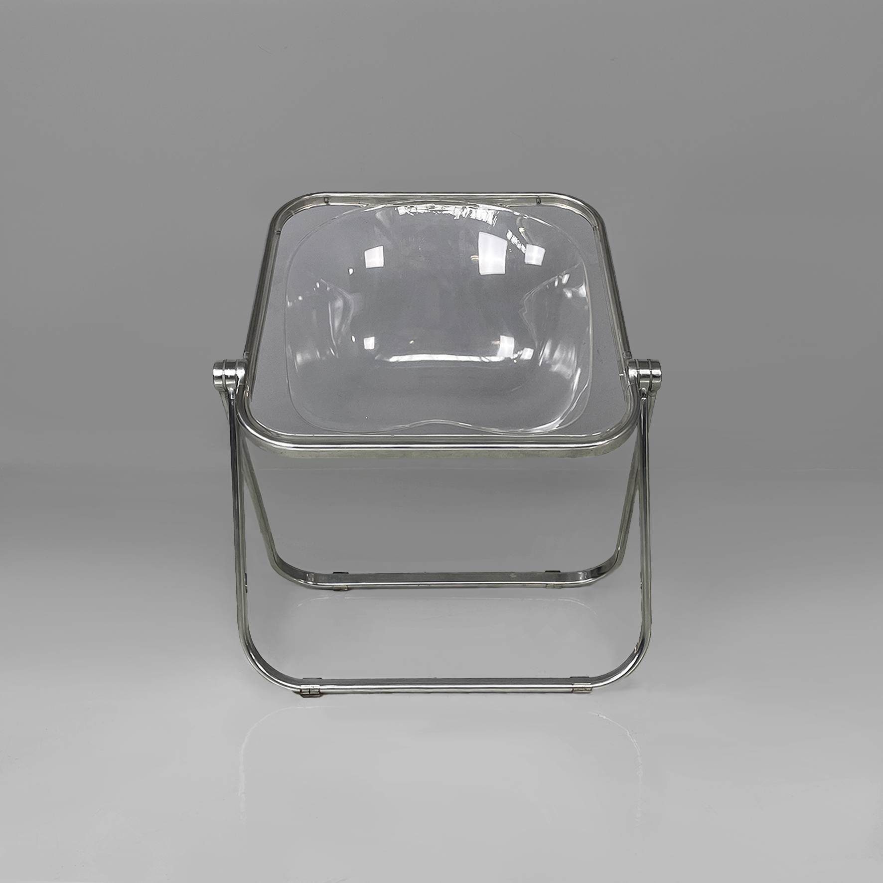 Poltrona modello Plona pieghevole con seduta e schienale monoscocca in plexiglass trasparente. La struttura è in tubolare a sezione ovale di alluminio cromato.