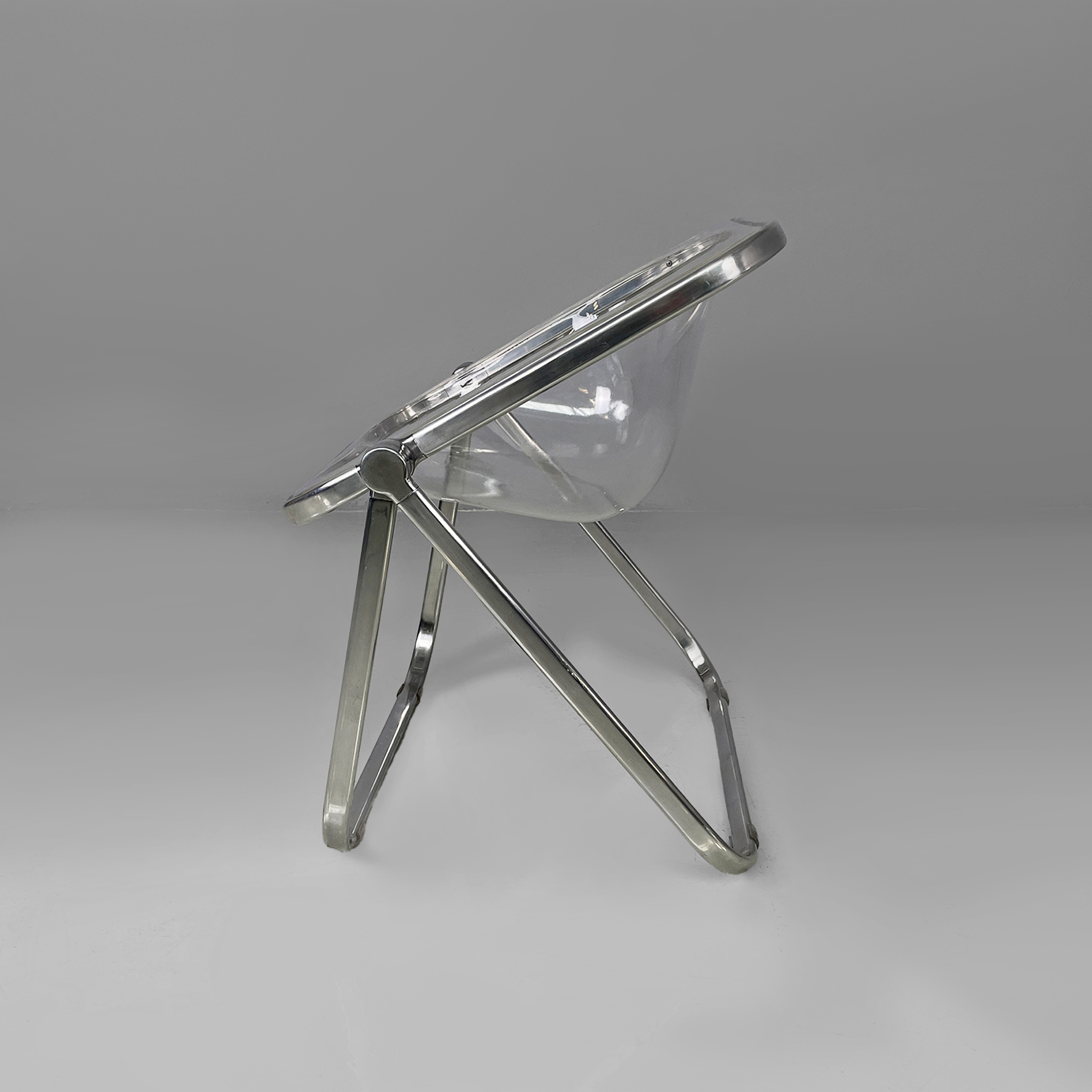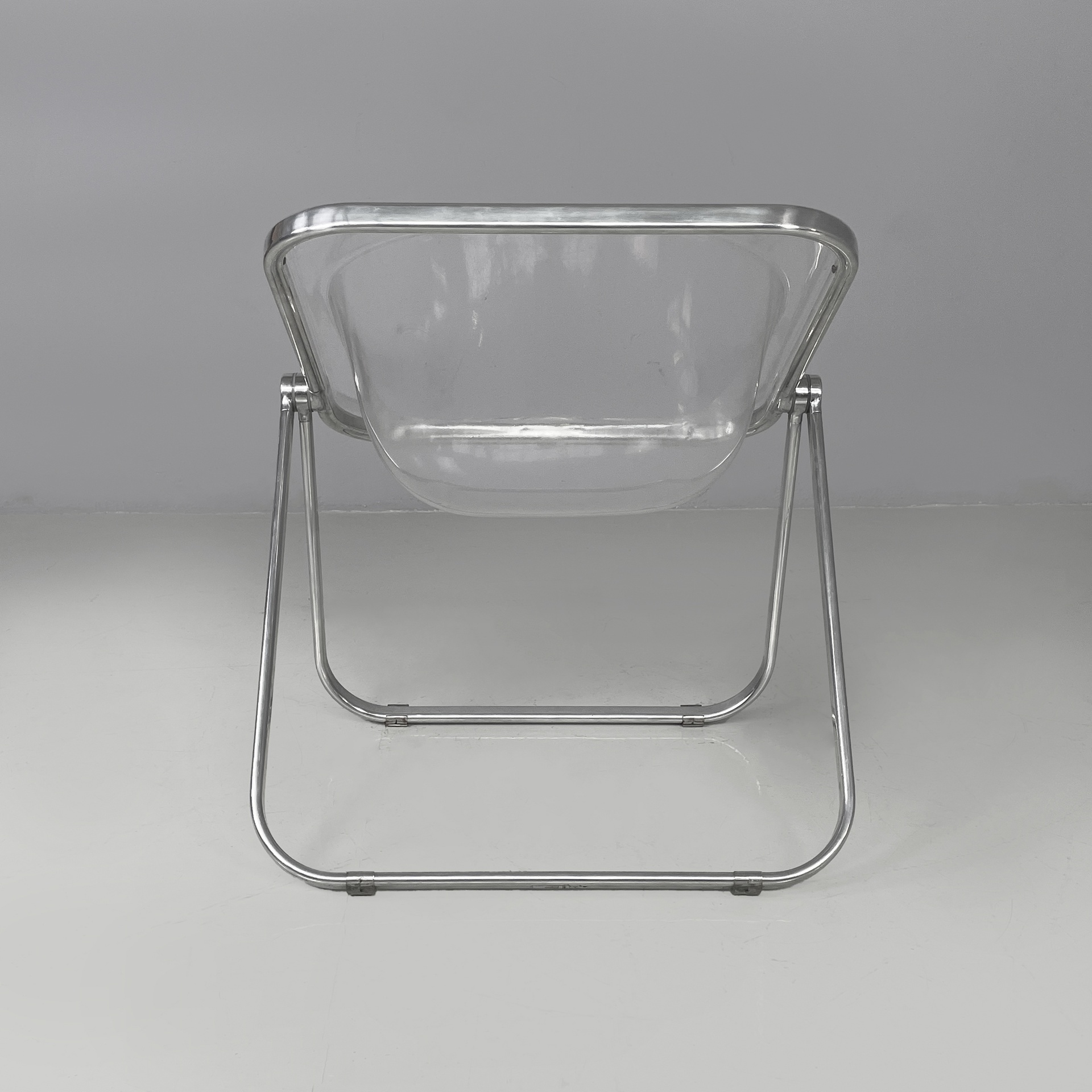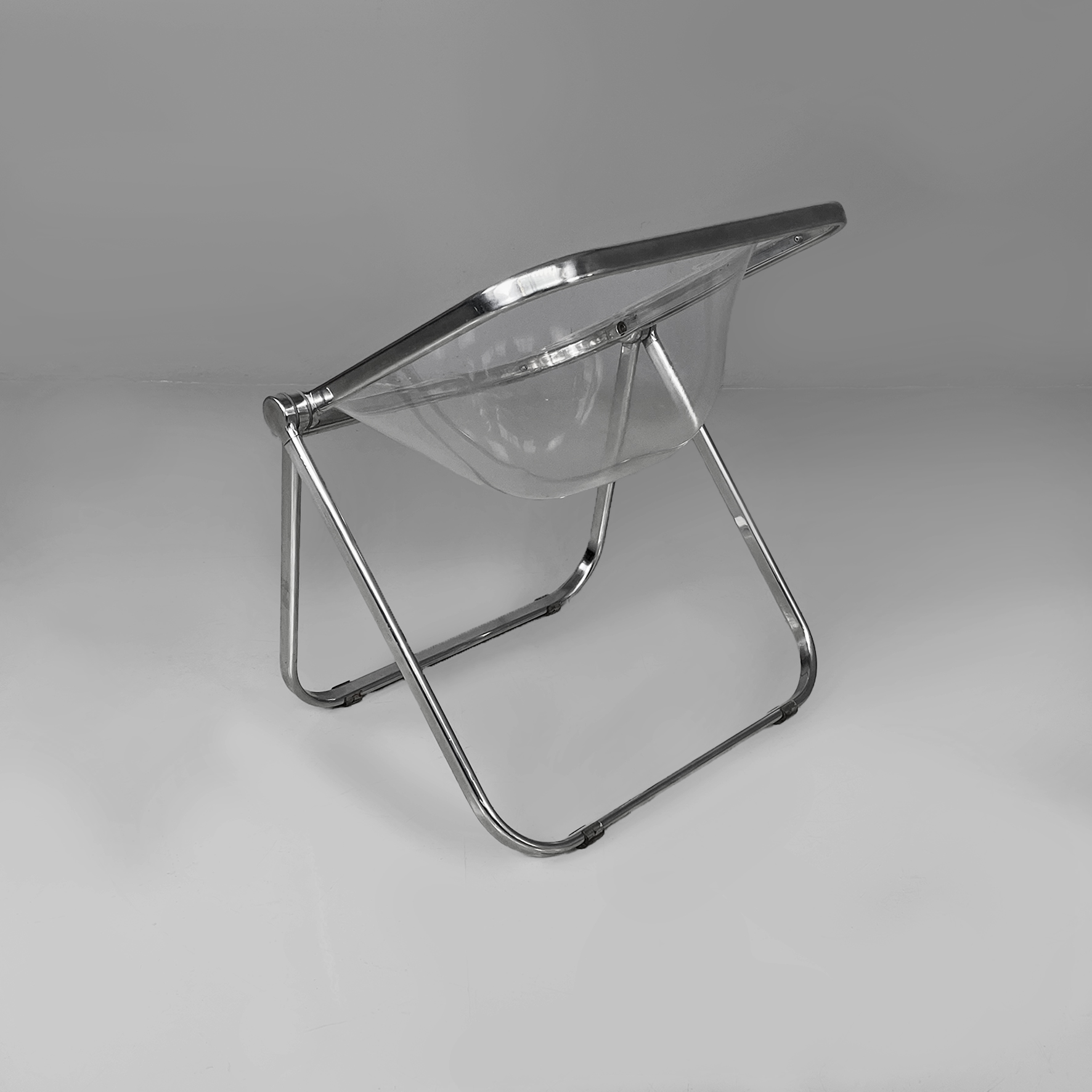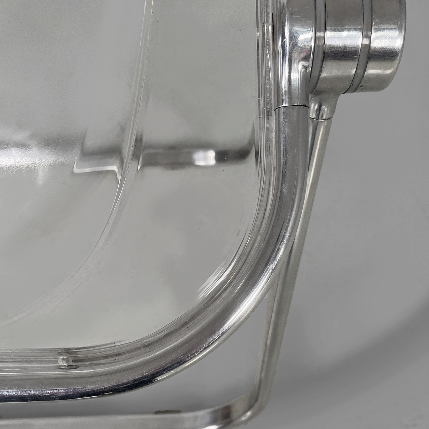 Poltrona modello Plona pieghevole con seduta e schienale monoscocca in plexiglass trasparente. La struttura è in tubolare a sezione ovale di alluminio cromato.