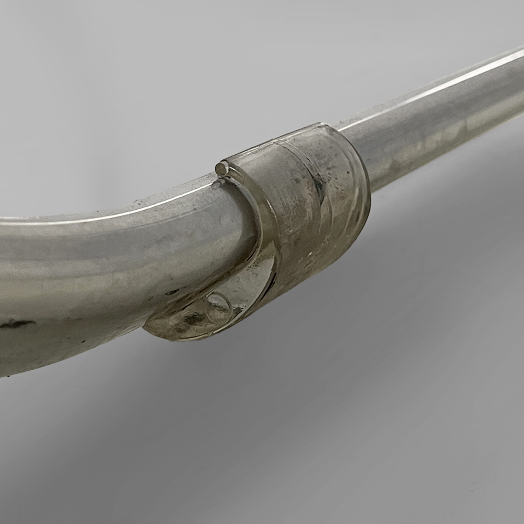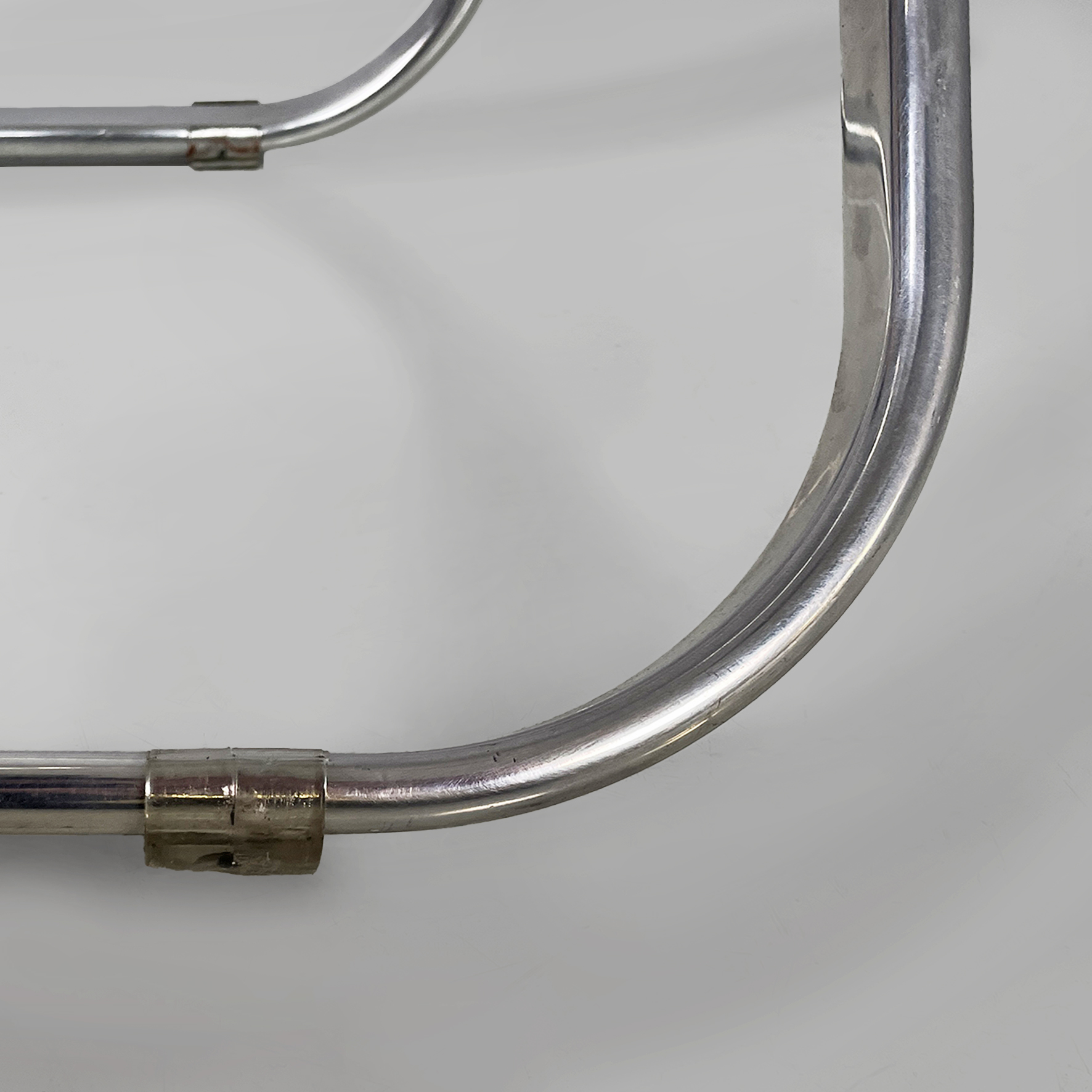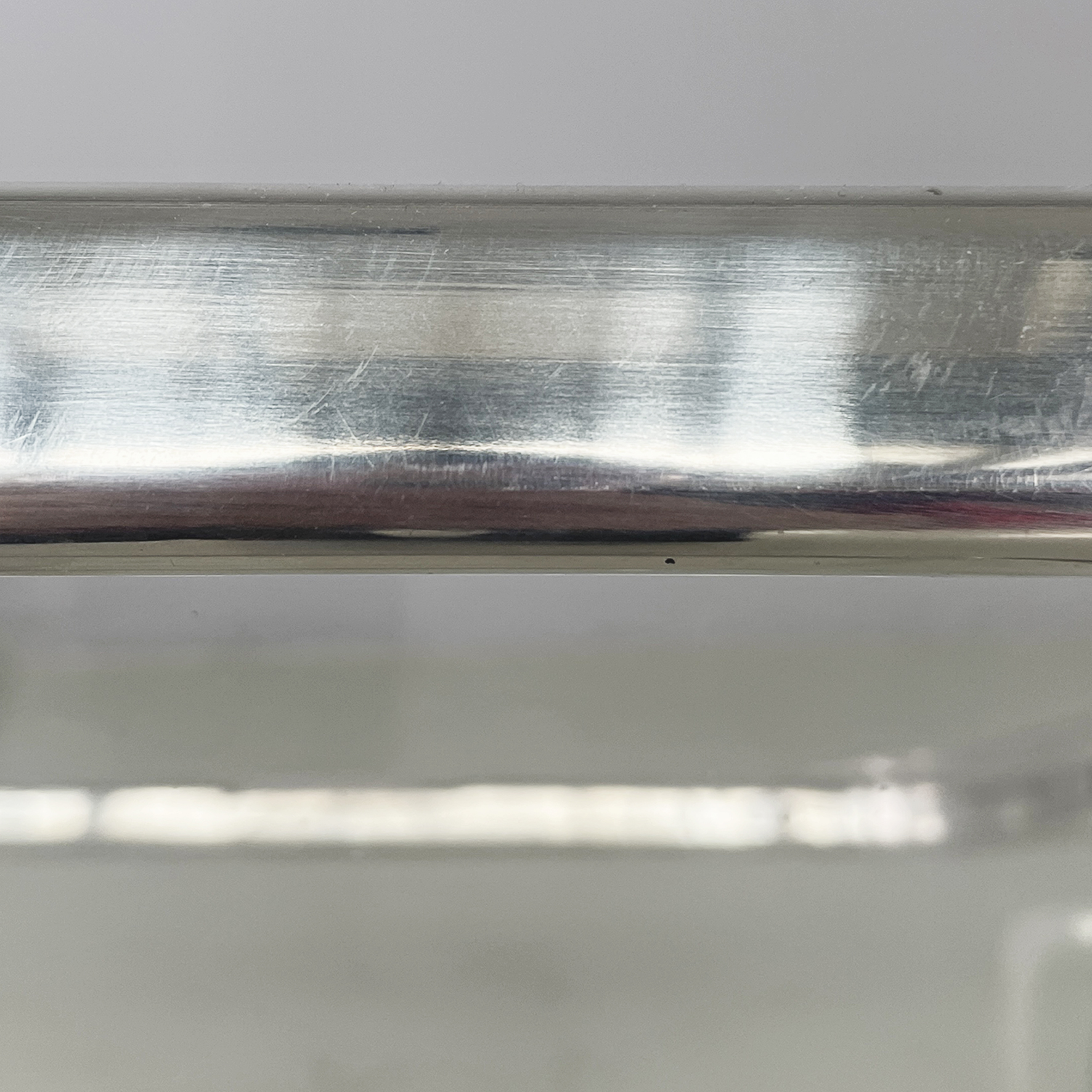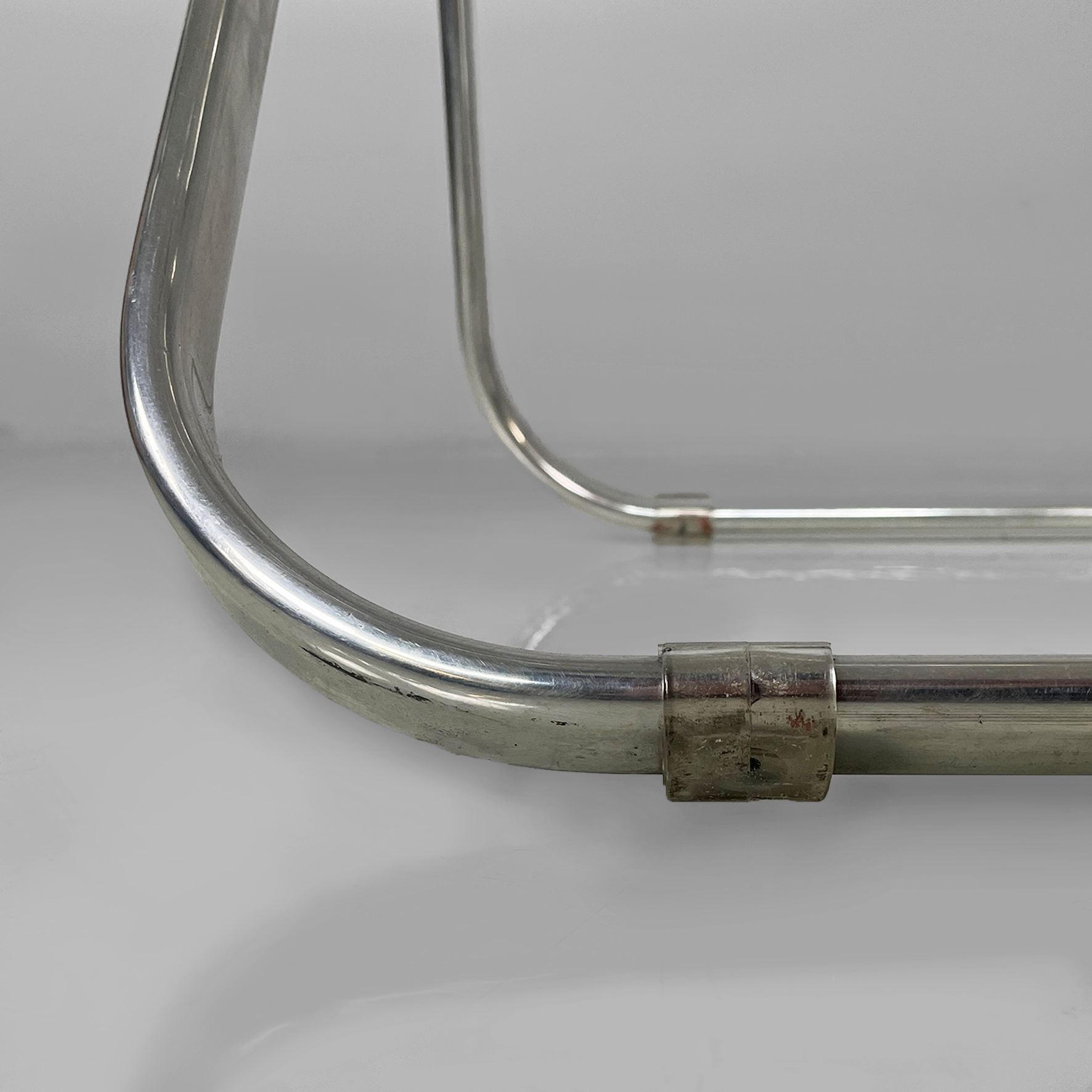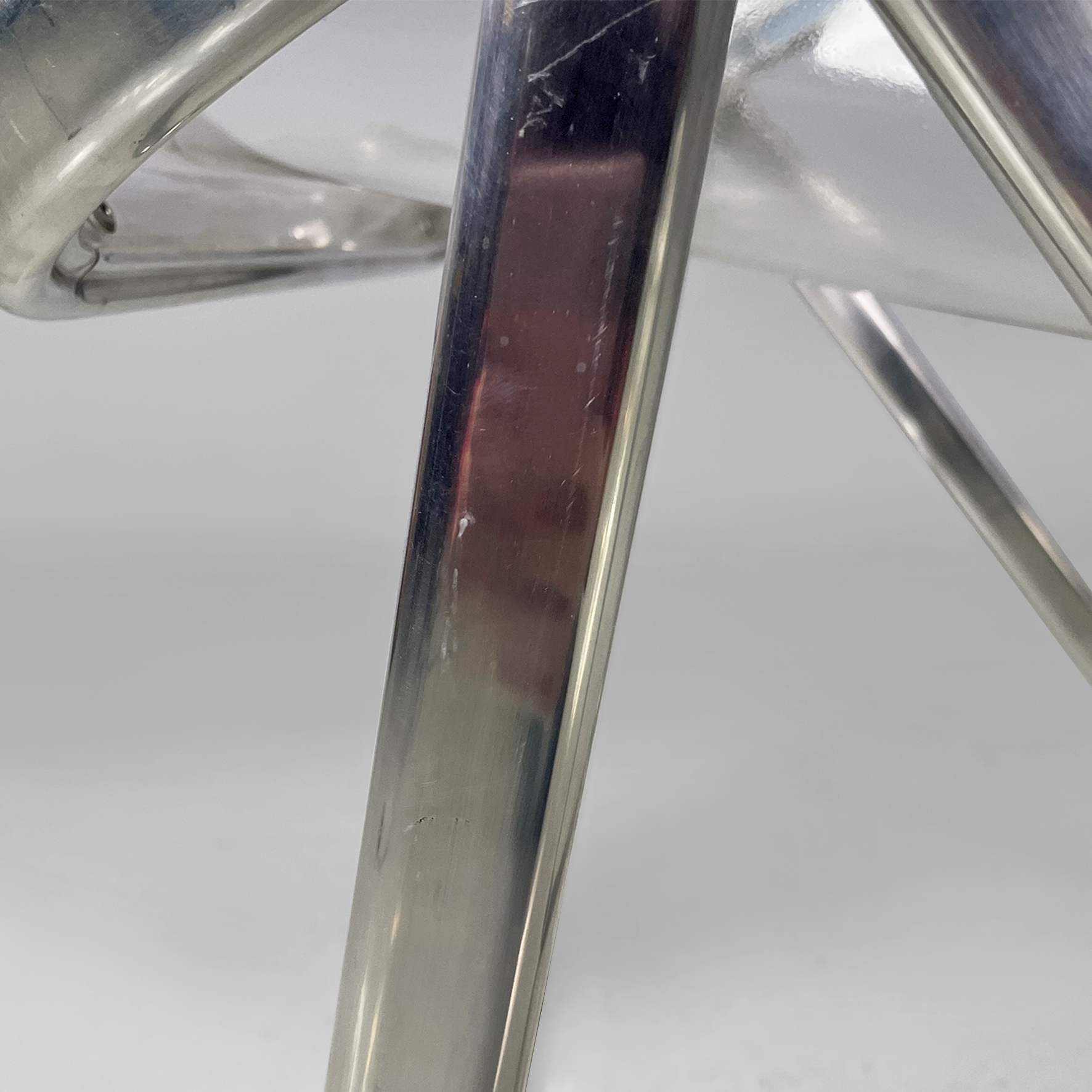 Poltrona modello Plona pieghevole con seduta e schienale monoscocca in plexiglass trasparente. La struttura è in tubolare a sezione ovale di alluminio cromato.