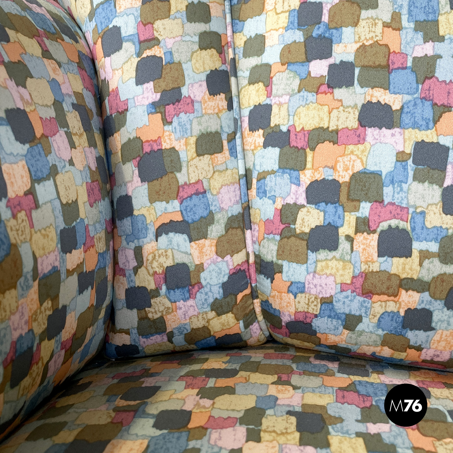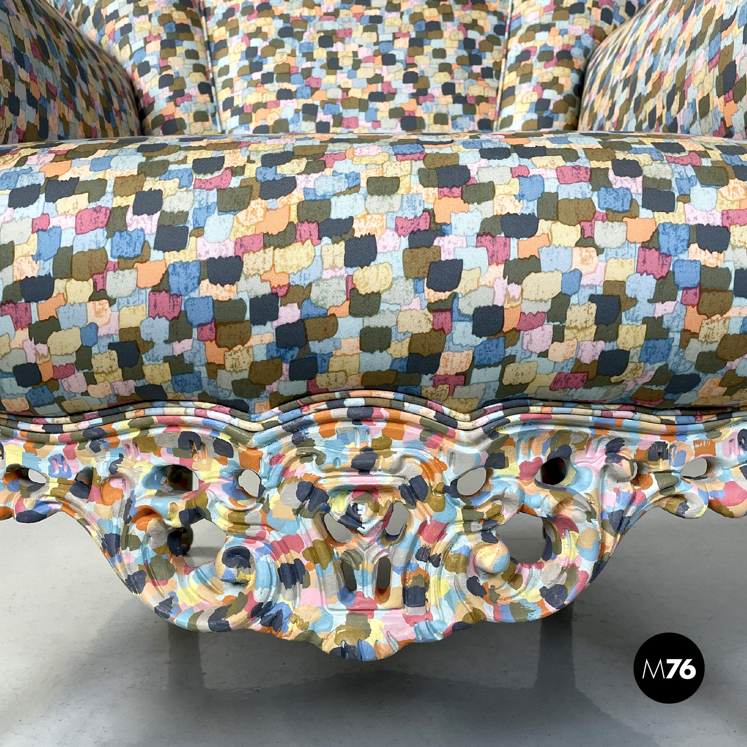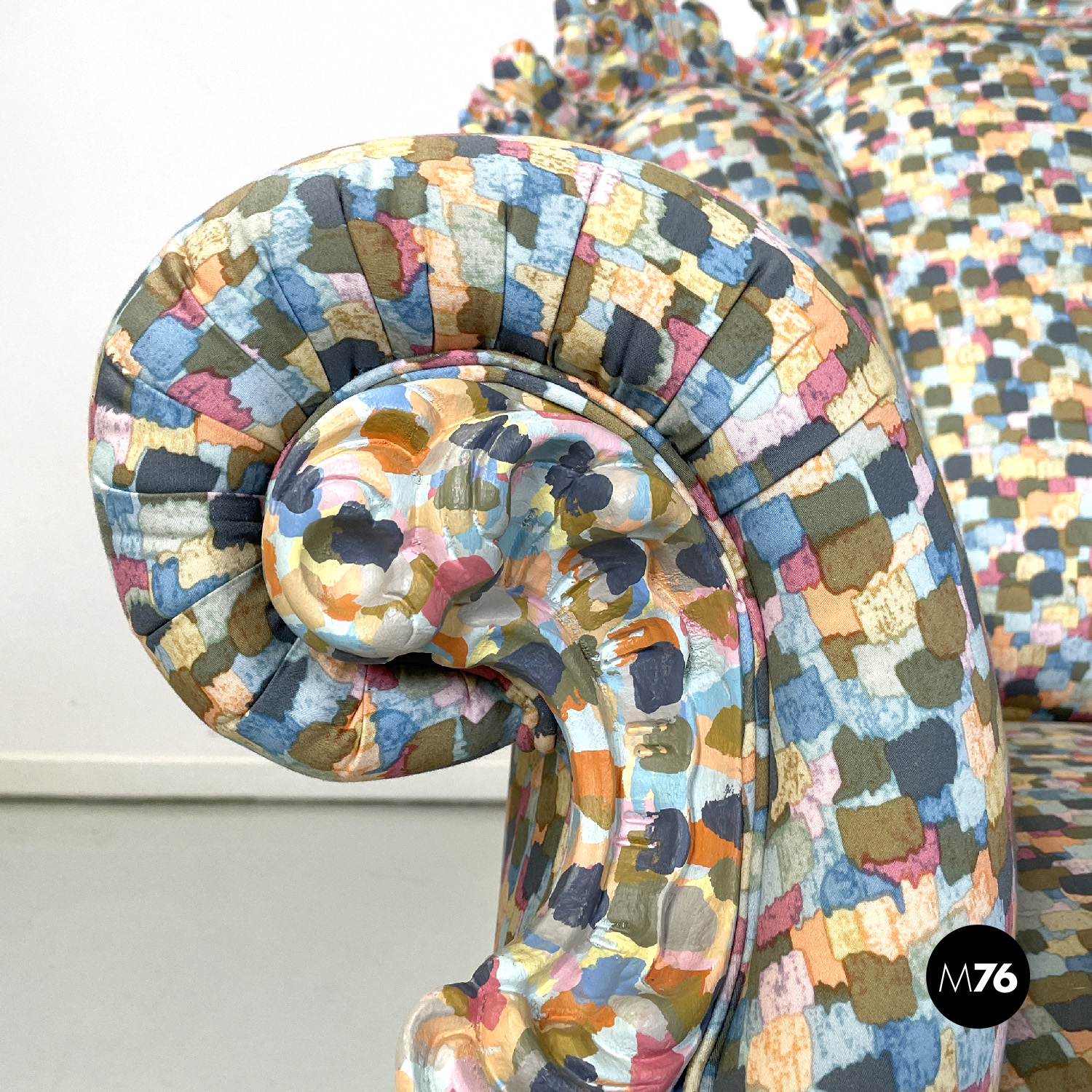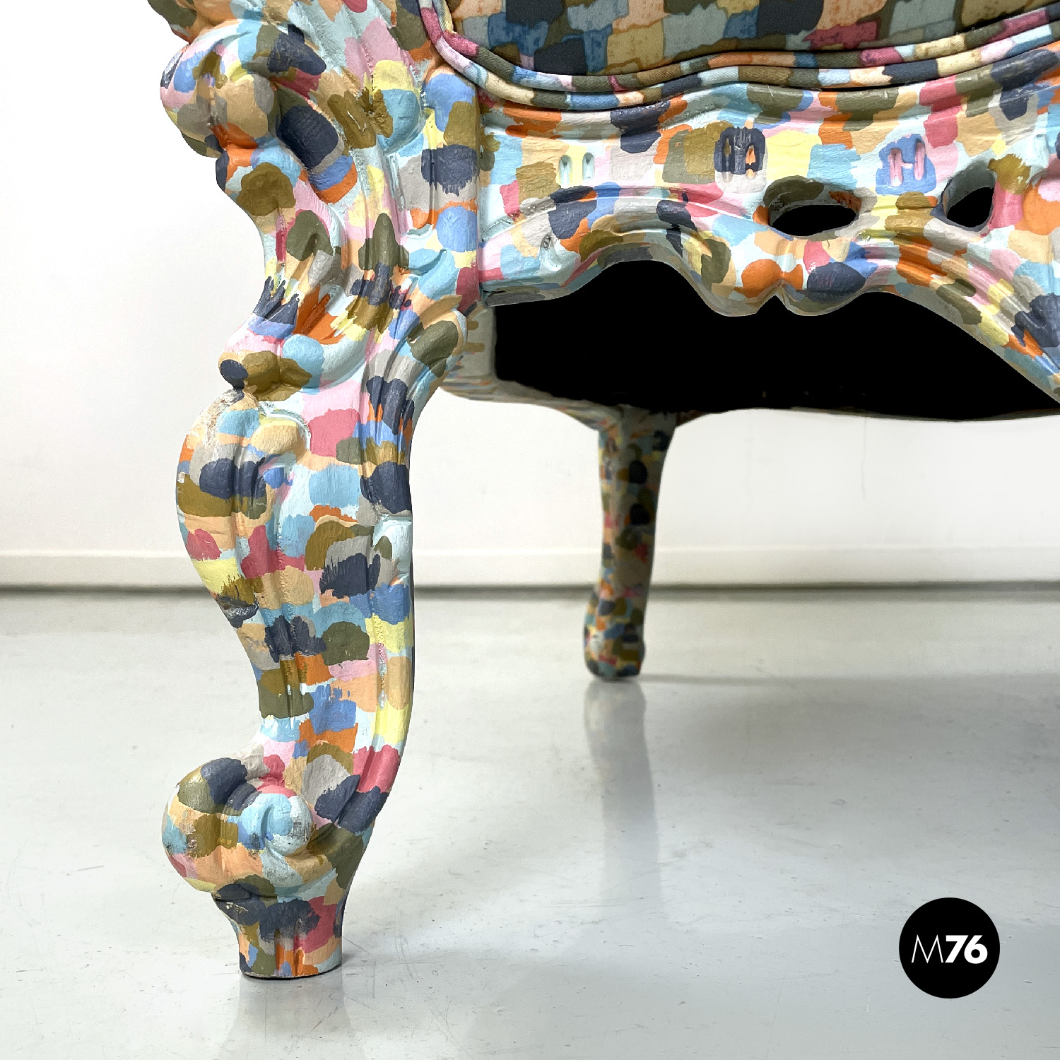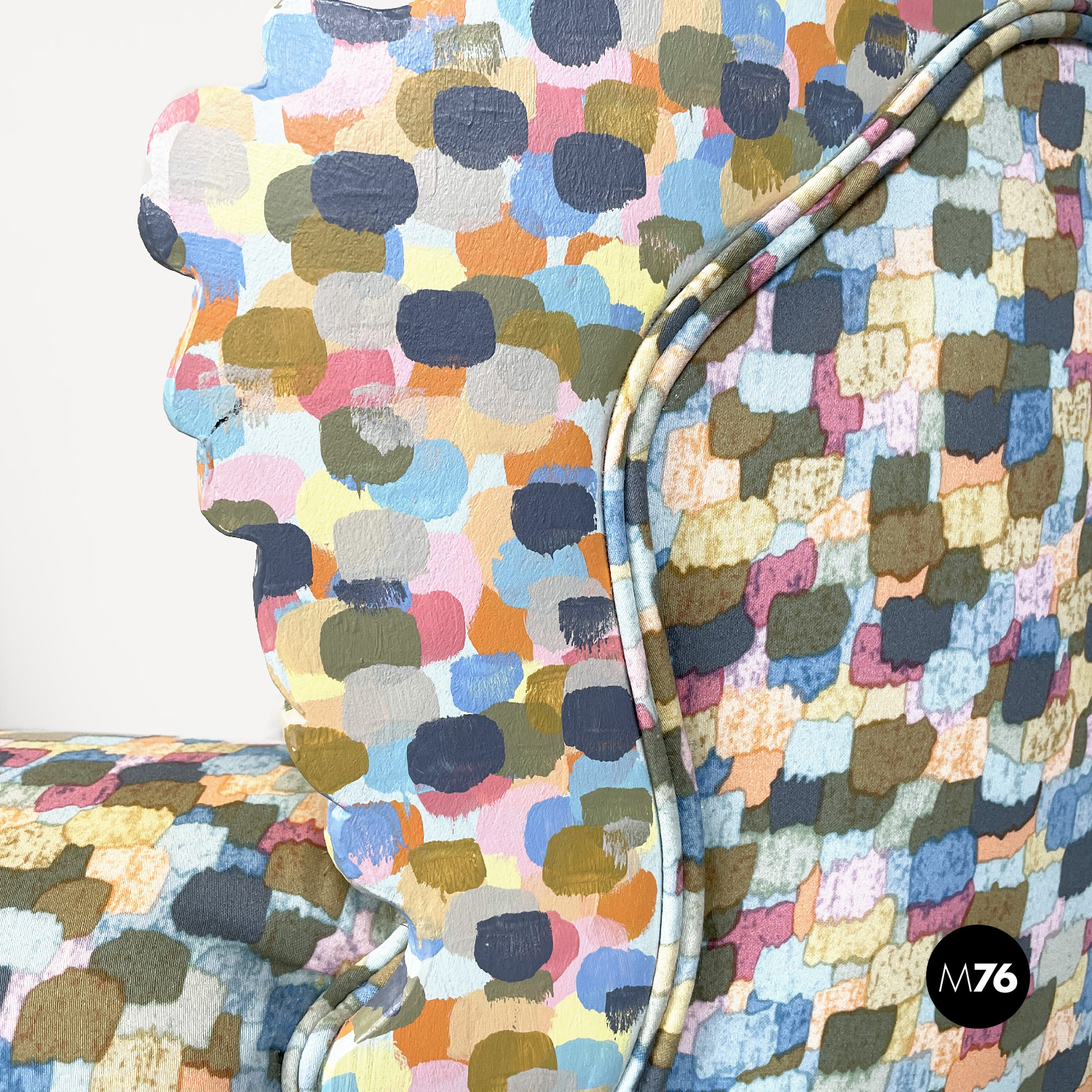 Poltrona modello Proust con tessuto e legno dipinto a mano. Il pattern della stoffa e della decorazione su legno è composto da tante pennellate squadrate che si sovrappongono e si affiancano, e sono sui toni del blu, rosa, arancione, grigio e marrone. Le parti in legno sono finemente lavorate e decorate.