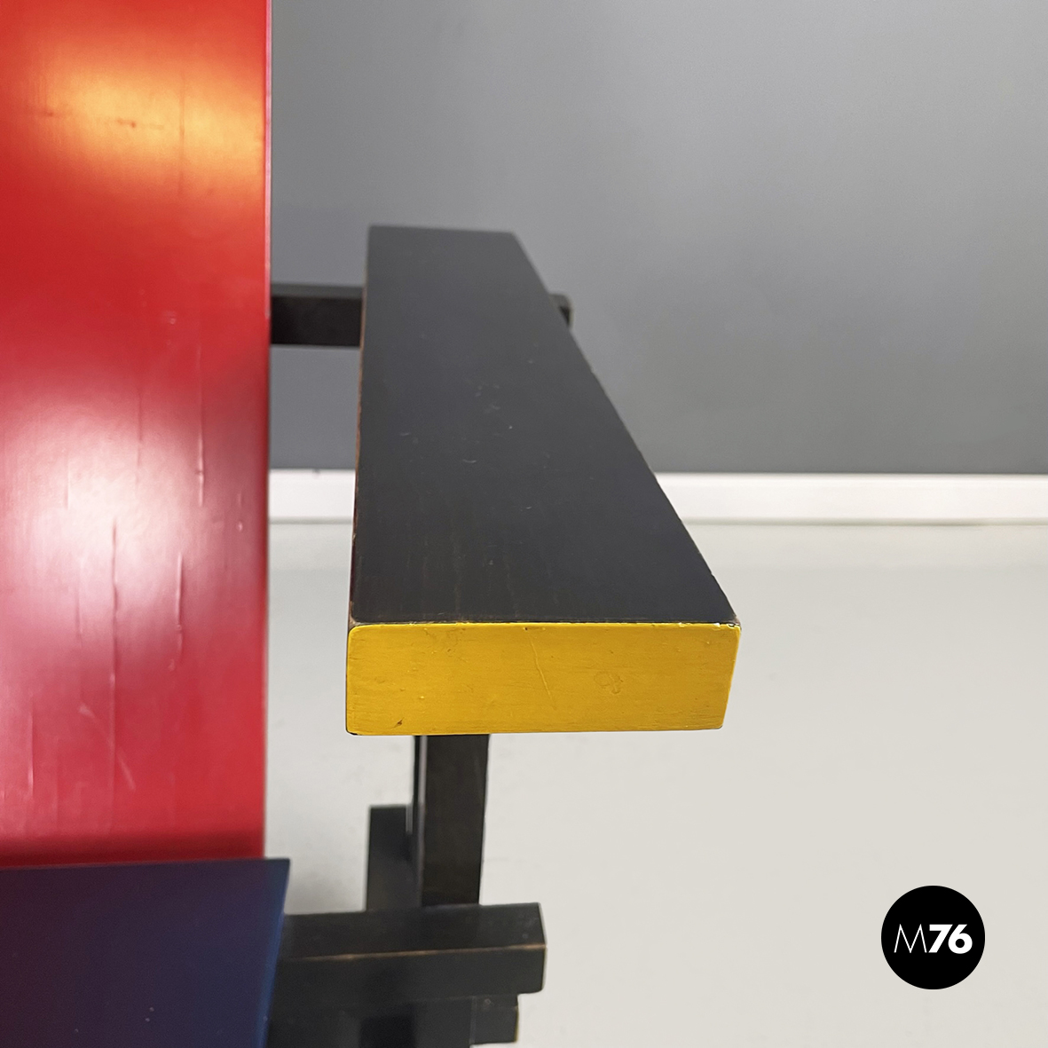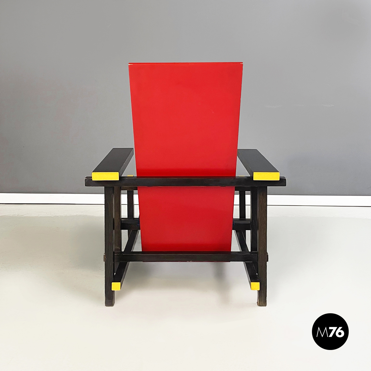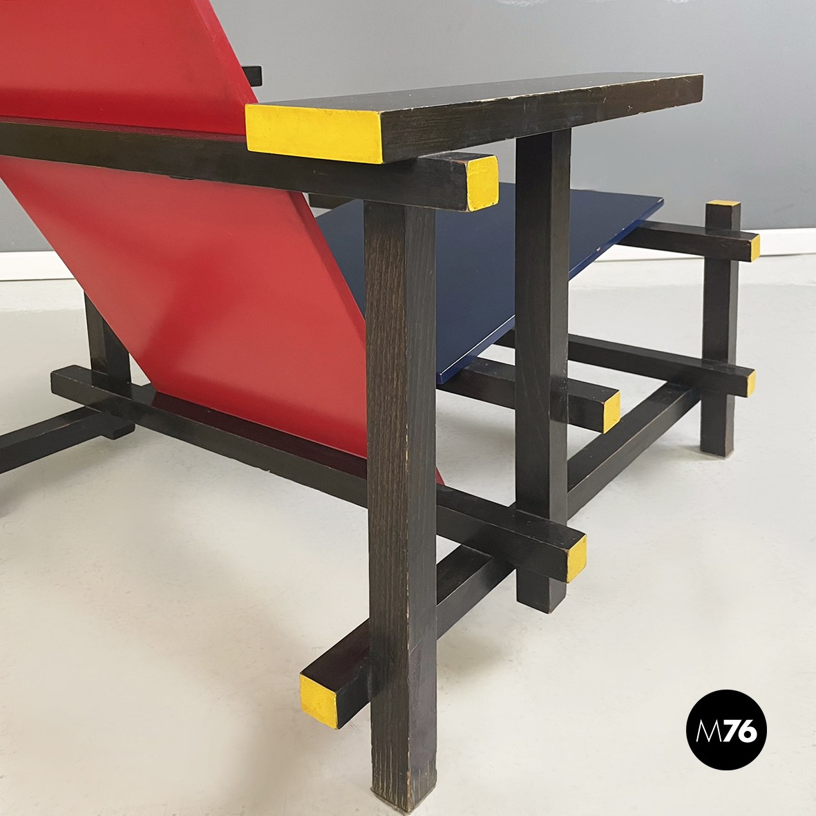 Poltrona modello Red and Blue interamente in legno verniciato in giallo, rosso, blu e nero. La sedia presenta presenta una seduta inclinata in legno verniciato blu e lo schienale inclinato in legno verniciato rosso. I braccioli e la struttura sono composti in composti da listelli di legno a sezione quadrata in nero con profili in giallo. In stile Bauhaus.