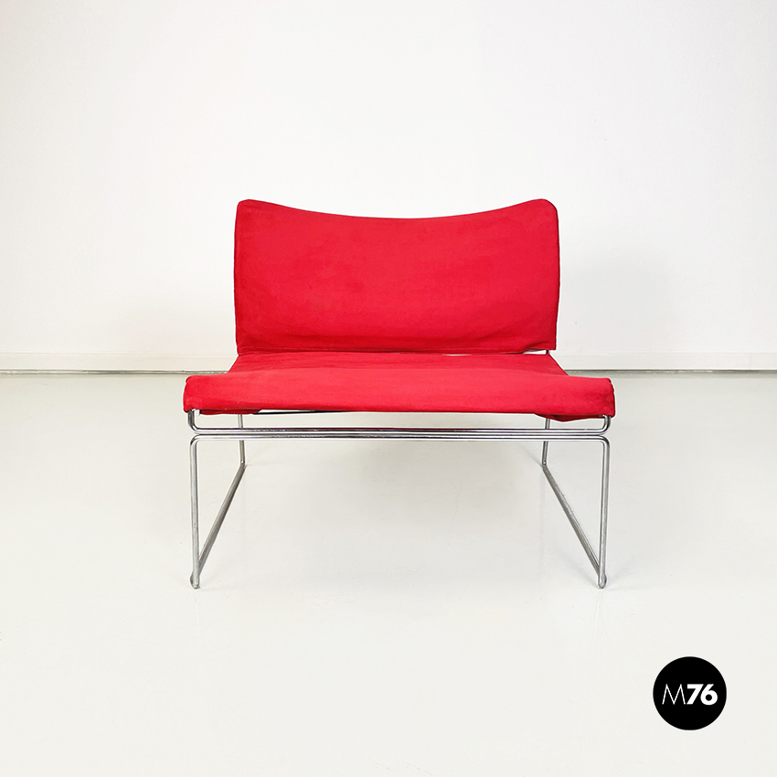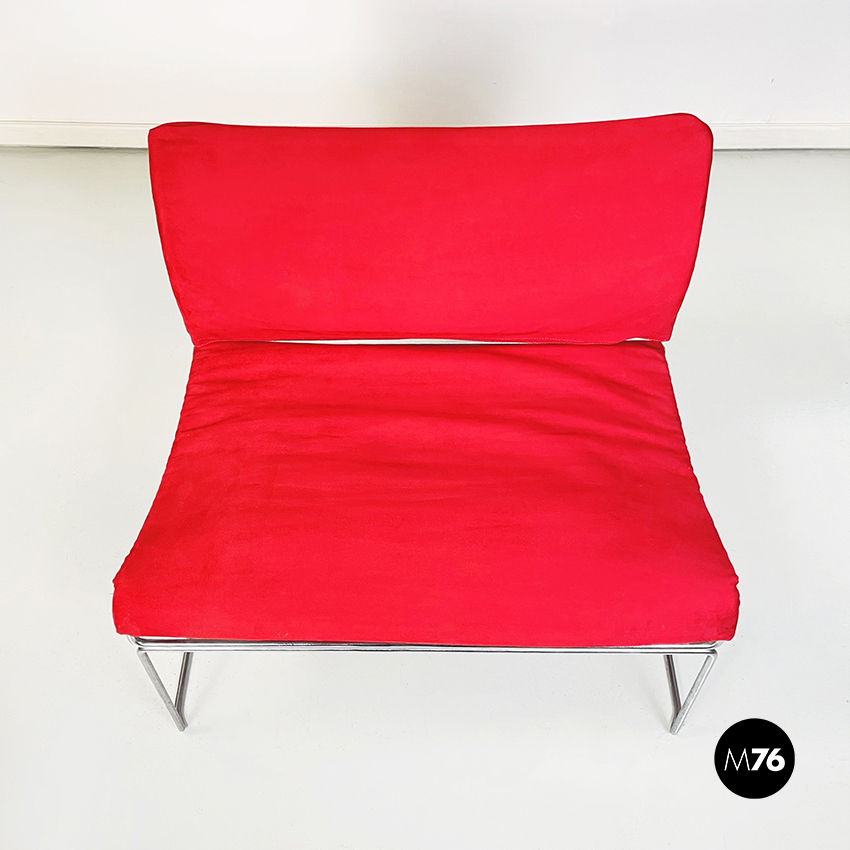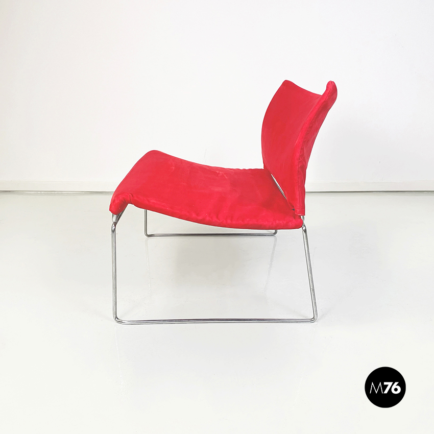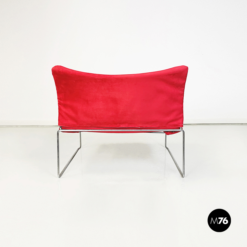 Poltrona modello Saghi con struttura in tondino di acciaio. La seduta e lo schienale sono leggermente imbottiti e rivestiti in velluto rosso.