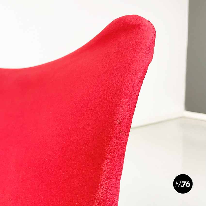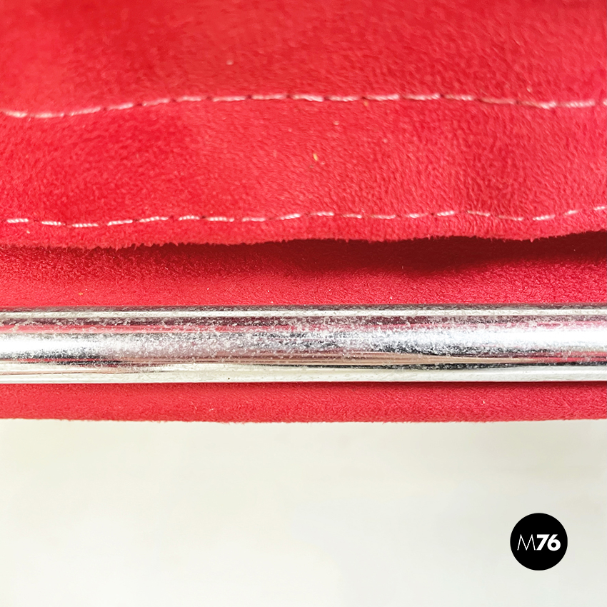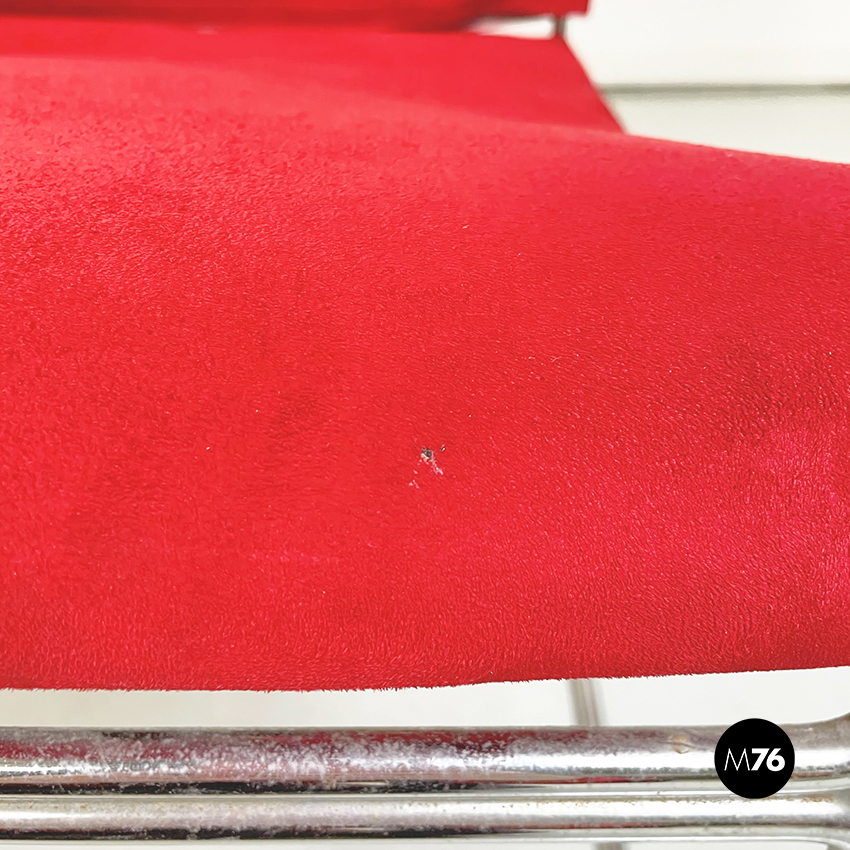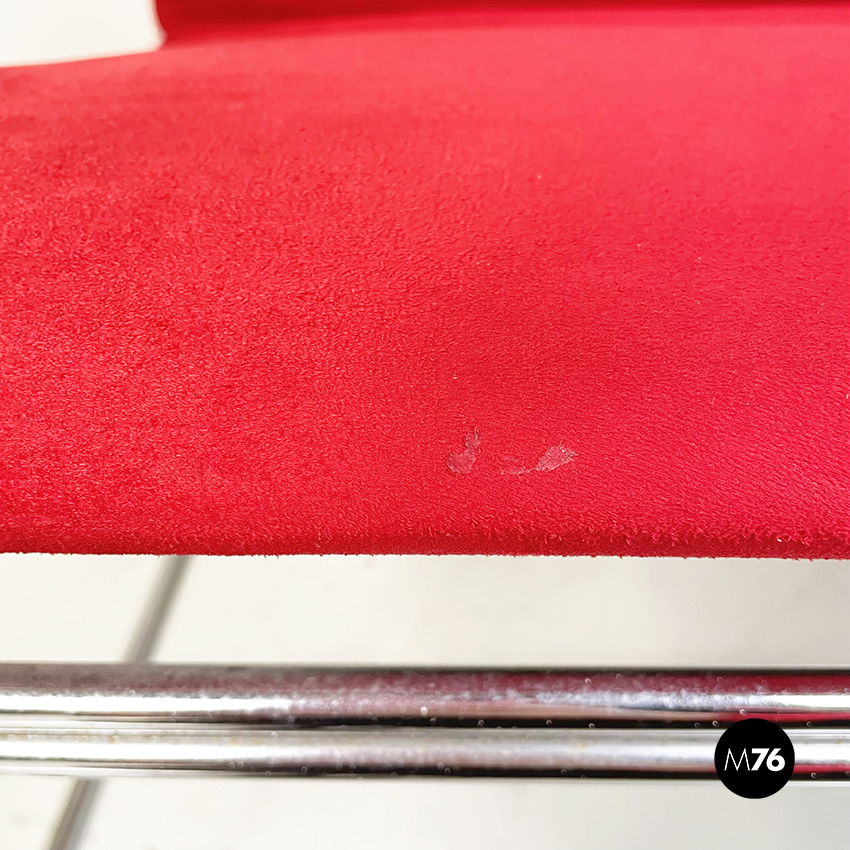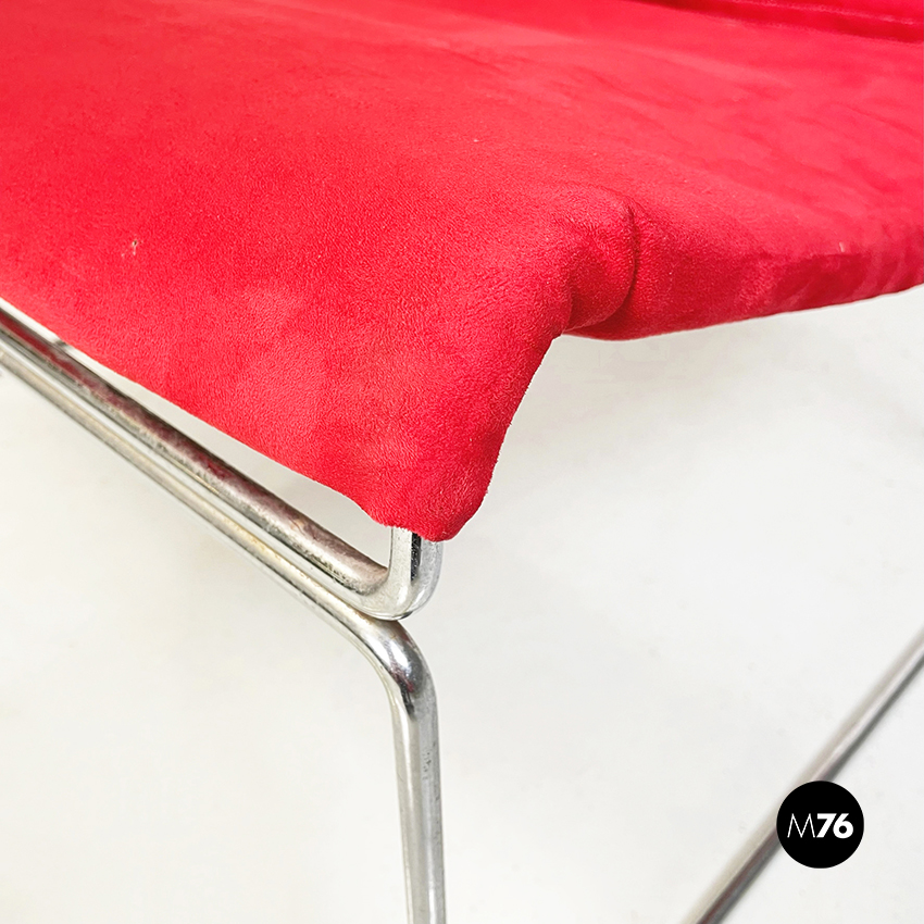 Poltrona modello Saghi con struttura in tondino di acciaio. La seduta e lo schienale sono leggermente imbottiti e rivestiti in velluto rosso.