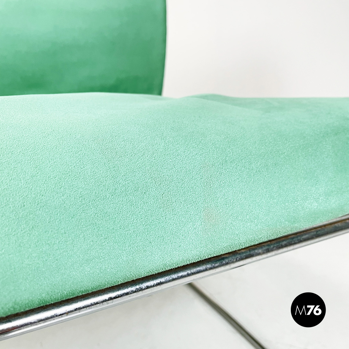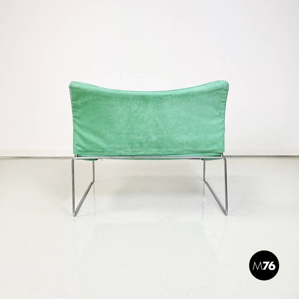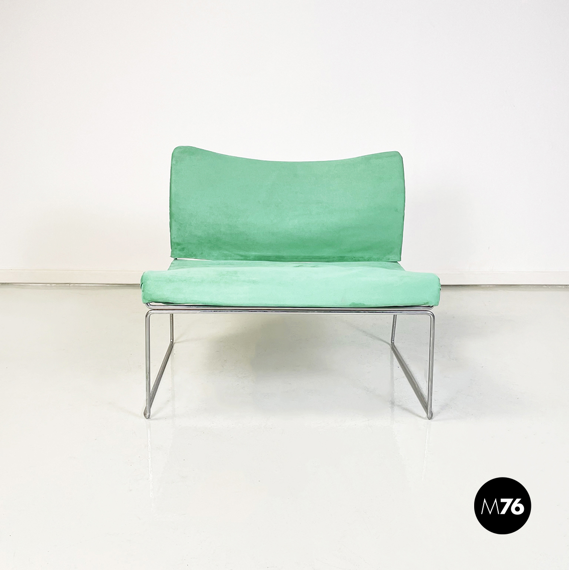 Poltrona modello Saghi con struttura in tondino di acciaio. La seduta e lo schienale sono leggermente imbottiti e rivestiti in velluto verde-acqua.