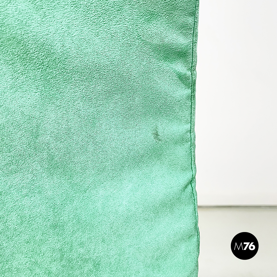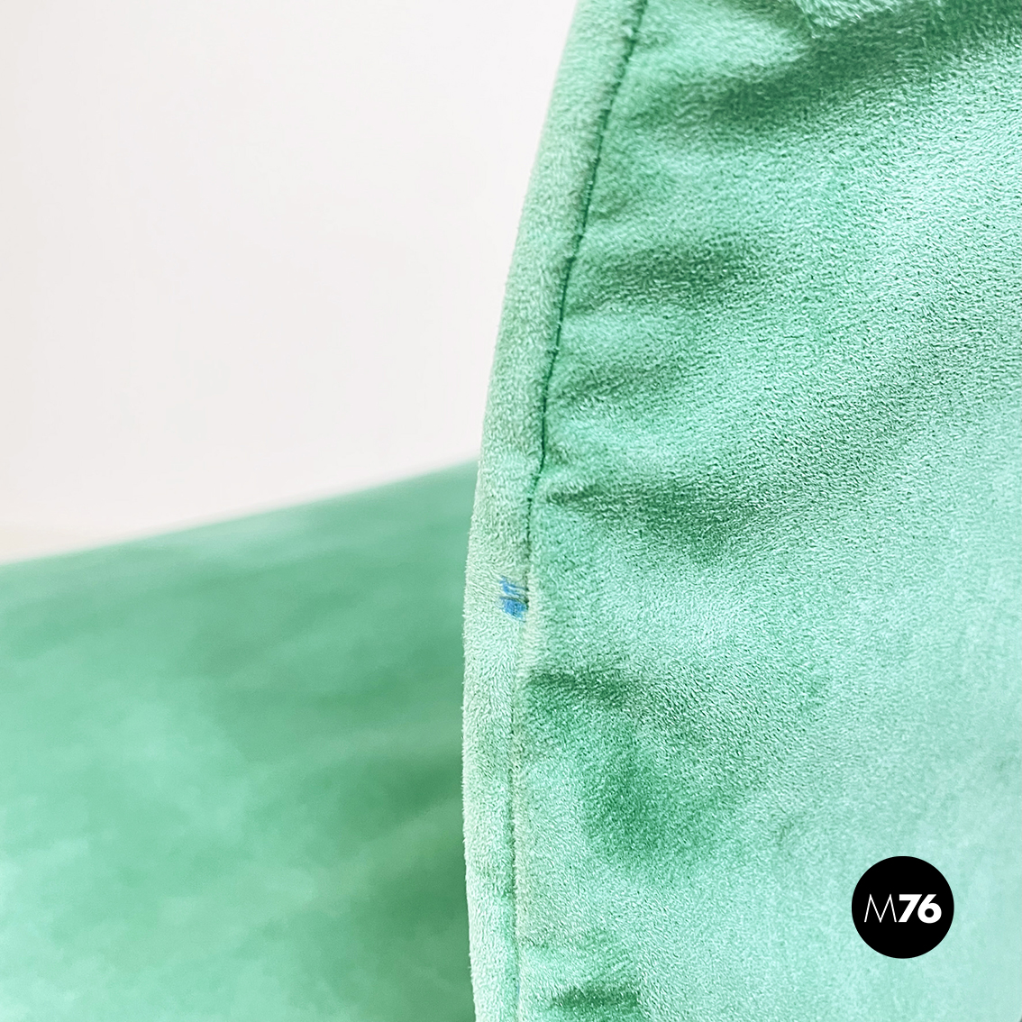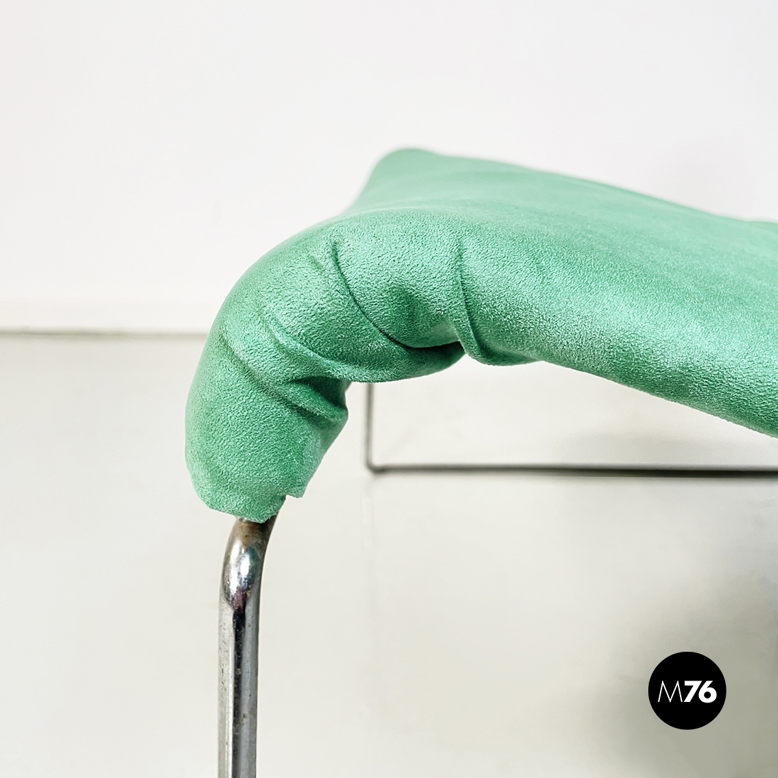 Poltrona modello Saghi con struttura in tondino di acciaio. La seduta e lo schienale sono leggermente imbottiti e rivestiti in velluto verde-acqua.