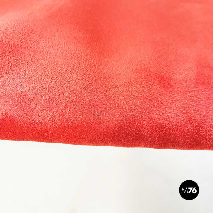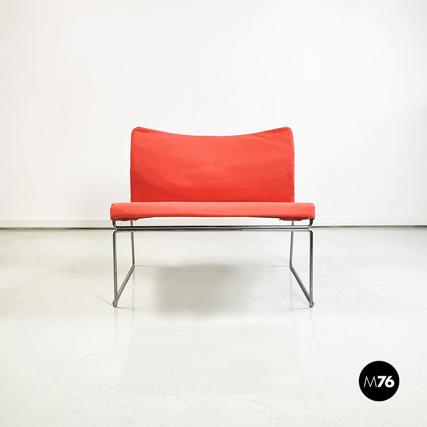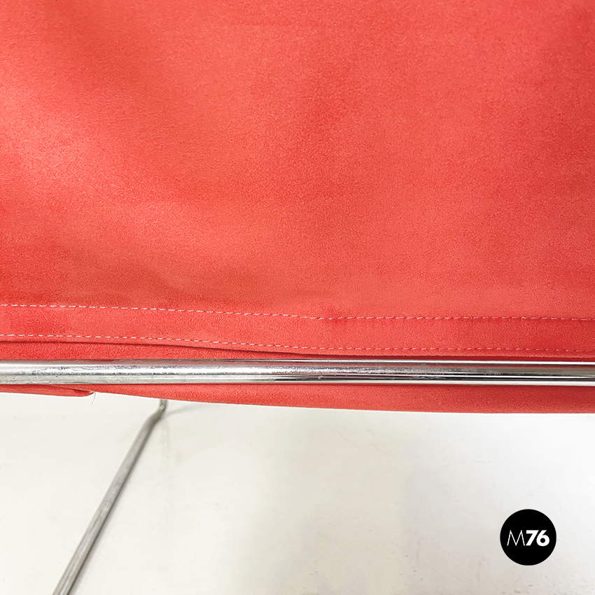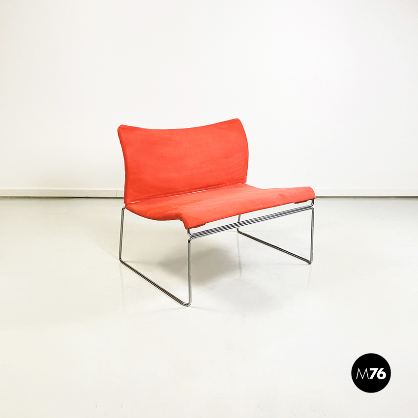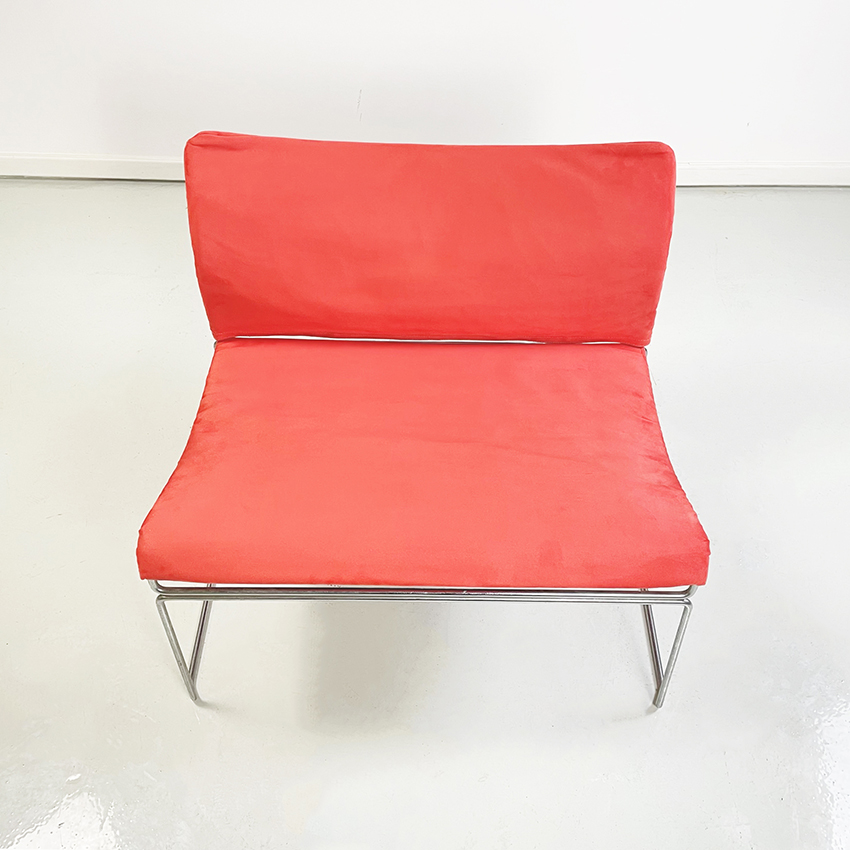 Poltrona modello Saghi con struttura in tondino di acciaio. La seduta e lo schienale sono leggermente imbottiti e rivestiti in velluto roso corallo.