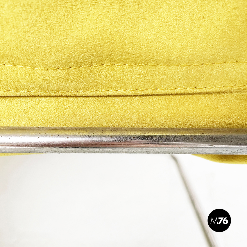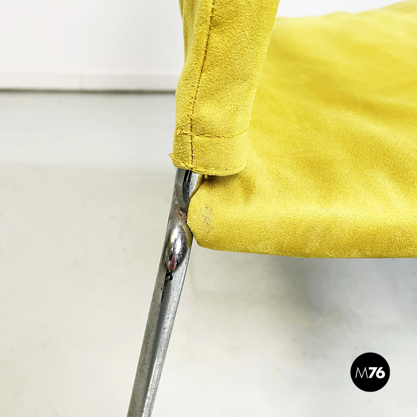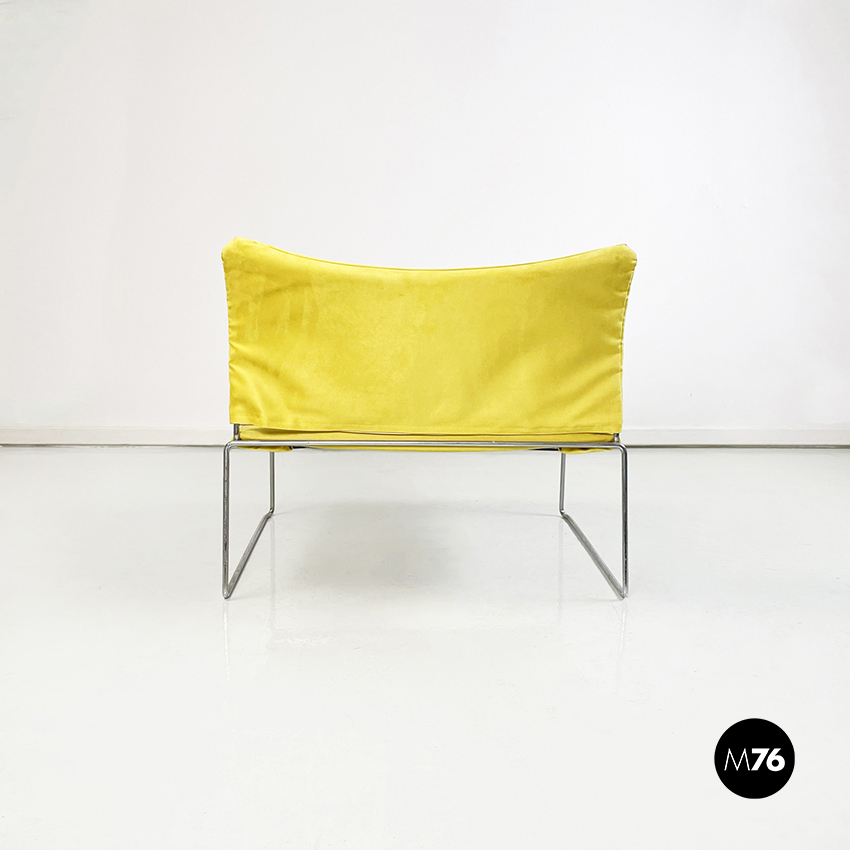 Poltrona modello Saghi con struttura in tondino di acciaio. La seduta e lo schienale sono leggermente imbottiti e rivestiti in velluto giallo.