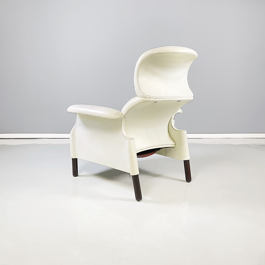 Poltrona model Sanluca in pelle bianca. Seduta squadrata imbottita. L’iconico schienale è composto da due archi. Braccioli ricurvi. Piedini cilindrici in legno.