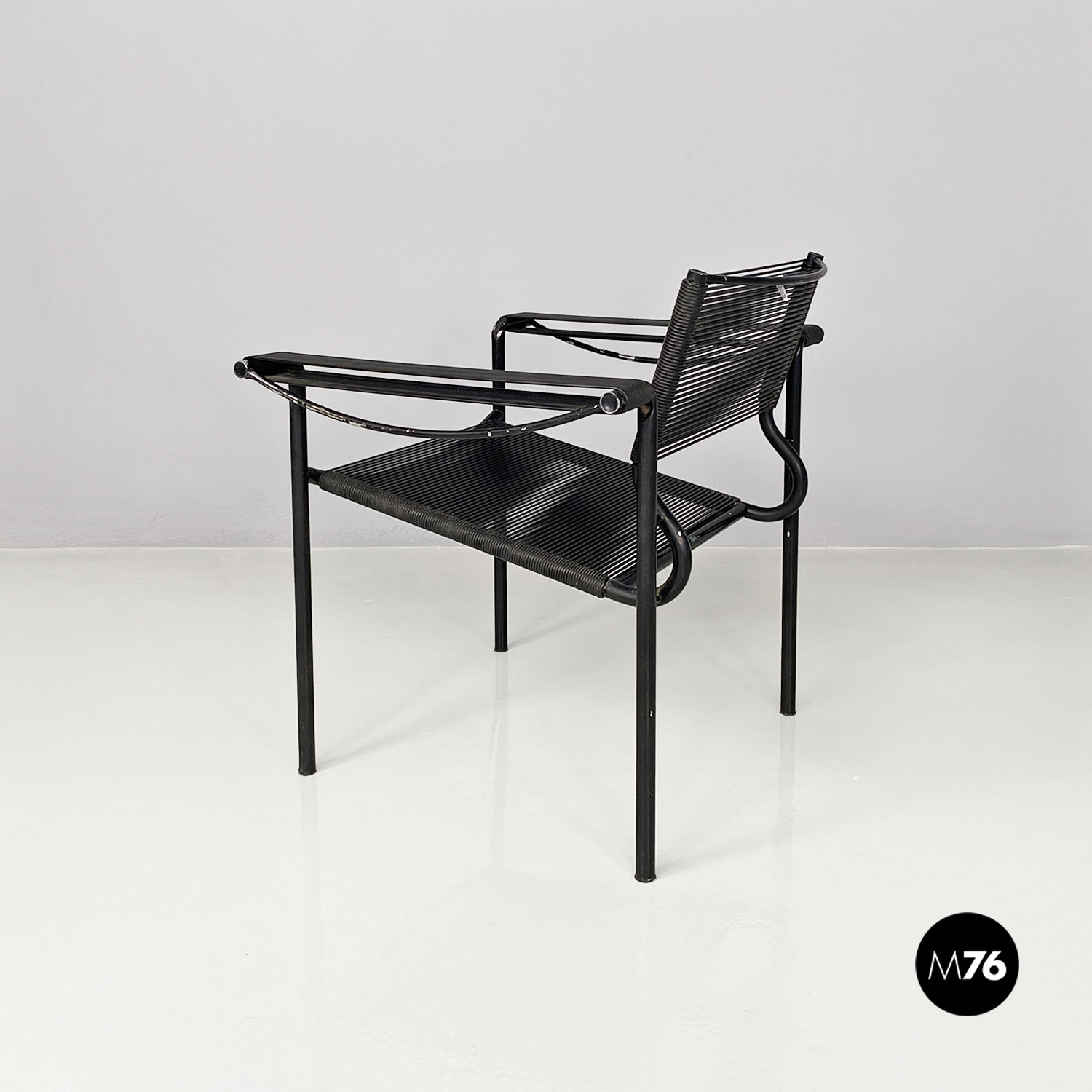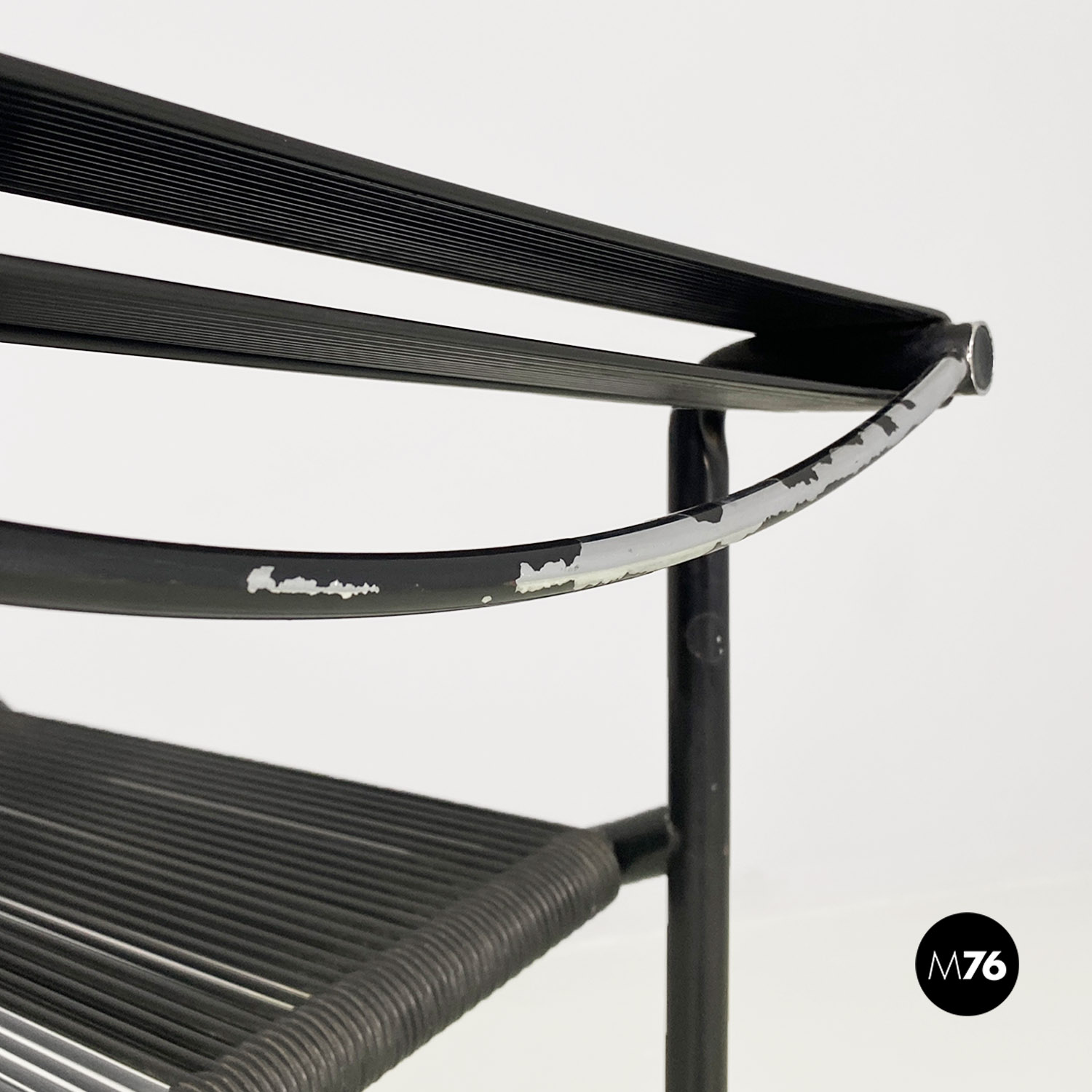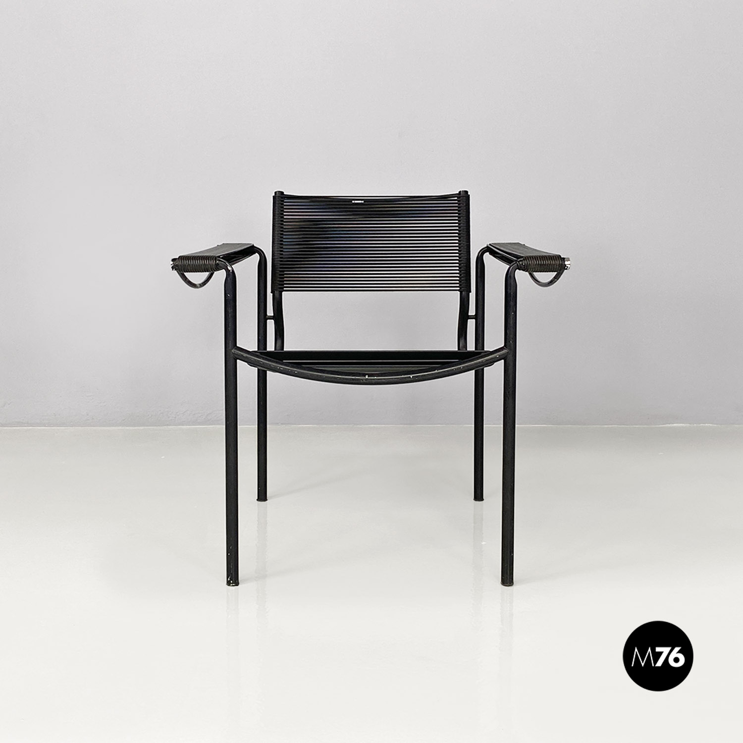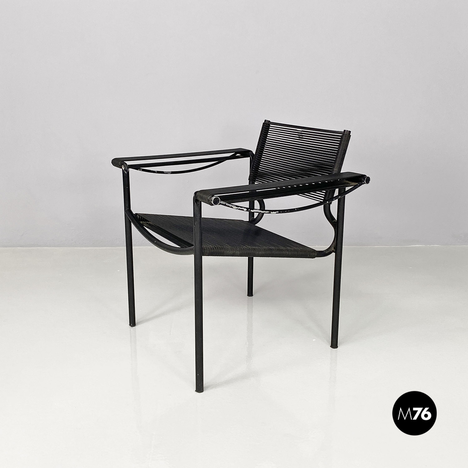 Poltrona Spaghetti con braccioli e struttura in metallo laccato nero e seduta e schienale in corde di plastica sempre di colore nero.