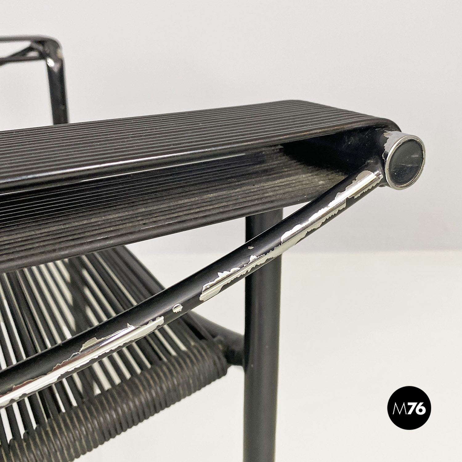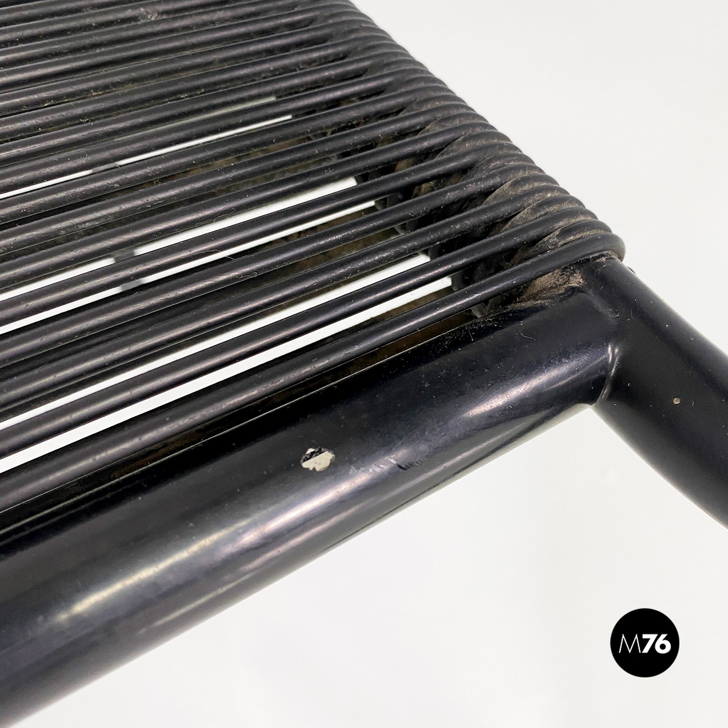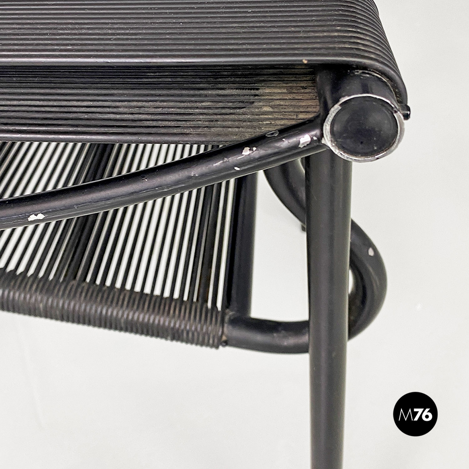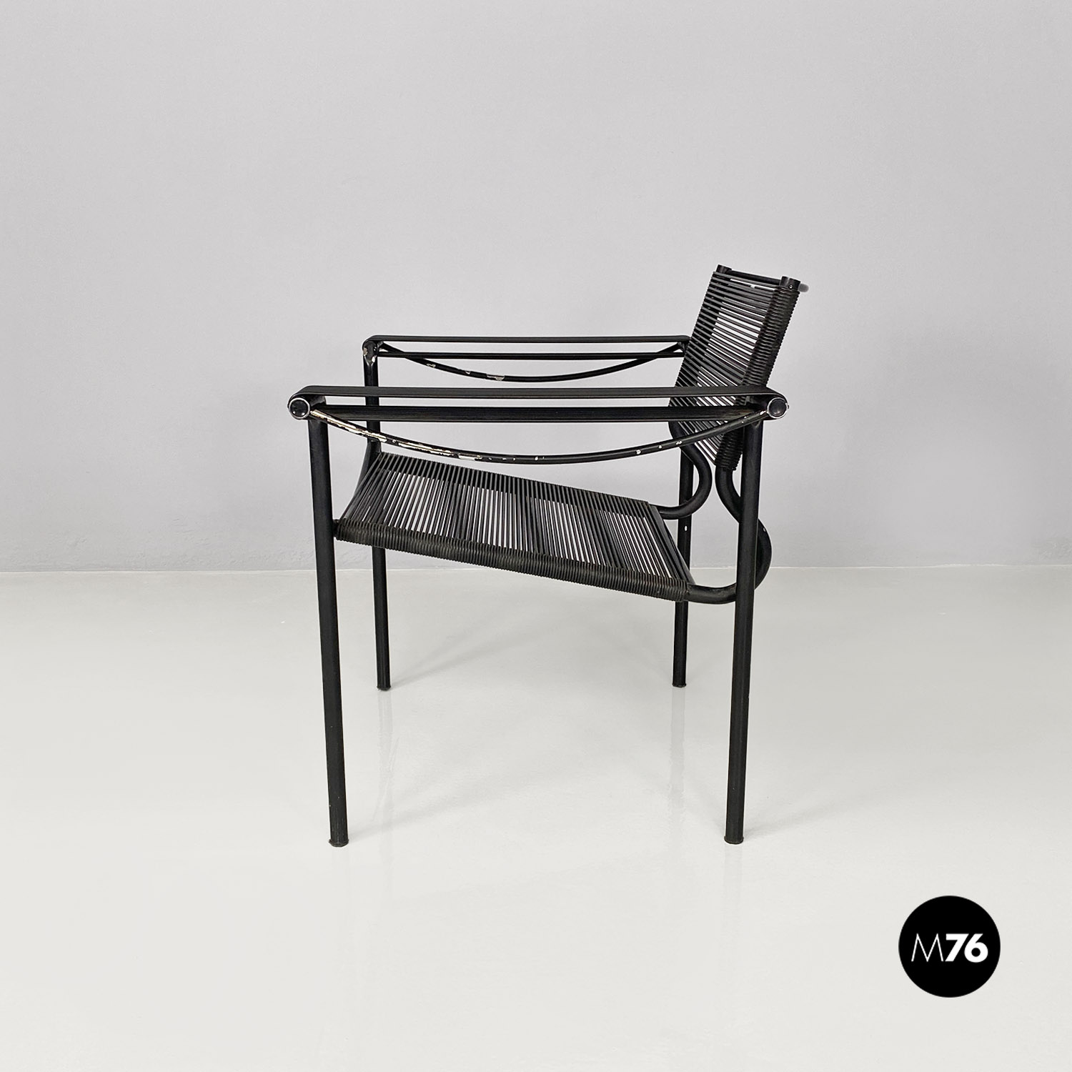 Poltrona Spaghetti con braccioli e struttura in metallo laccato nero e seduta e schienale in corde di plastica sempre di colore nero.