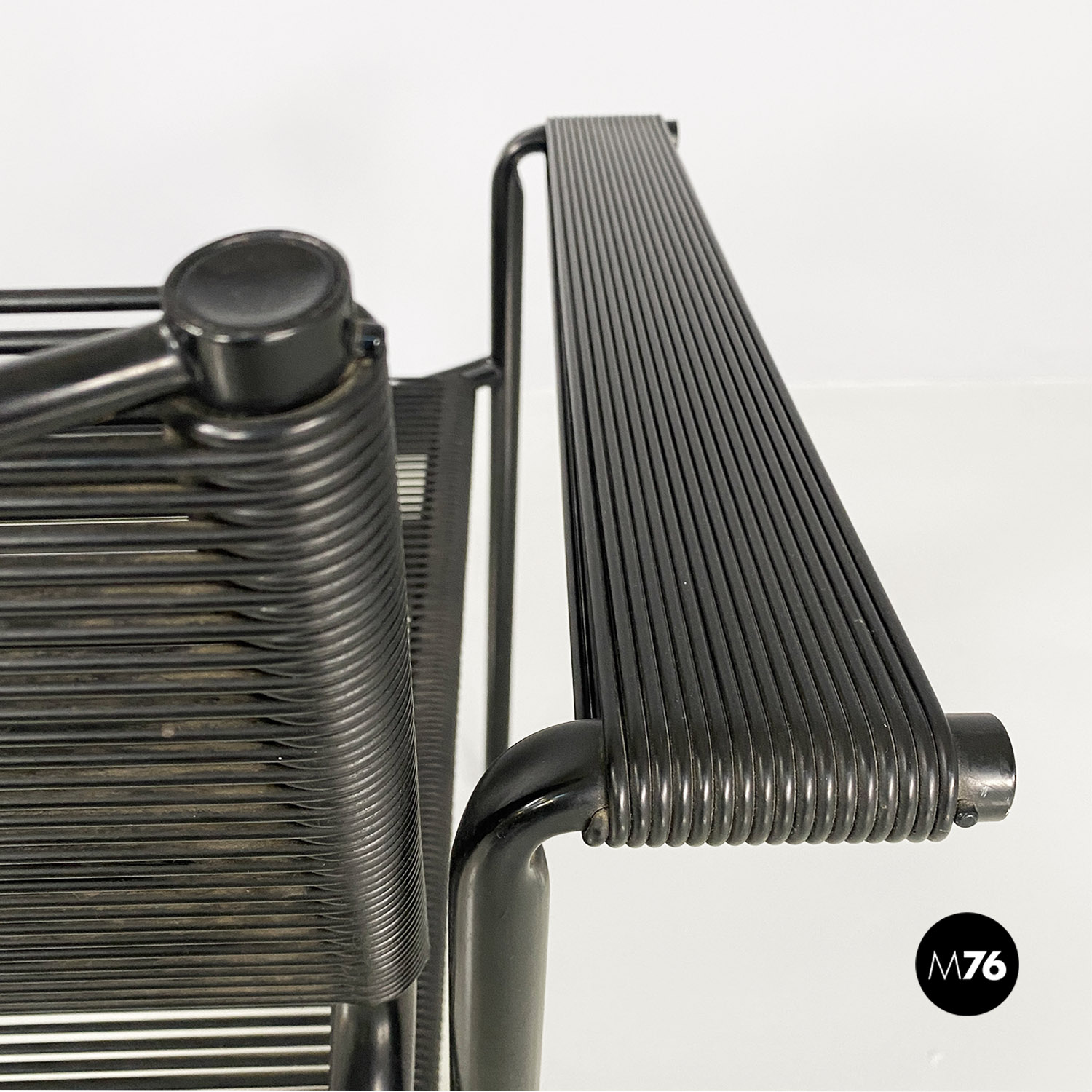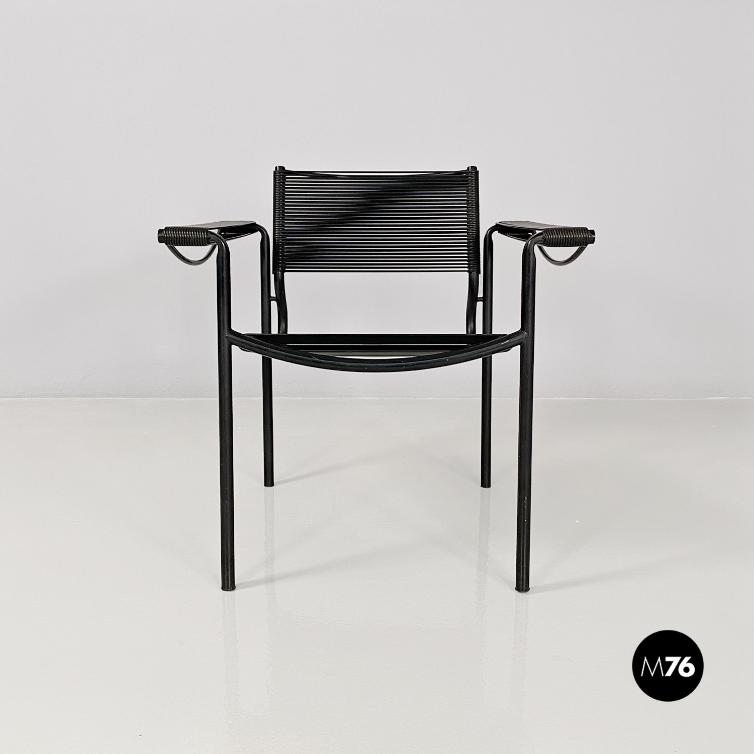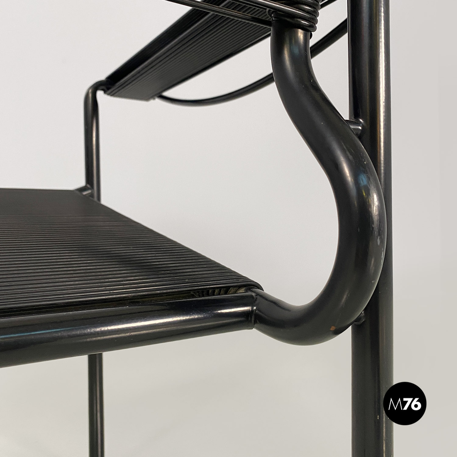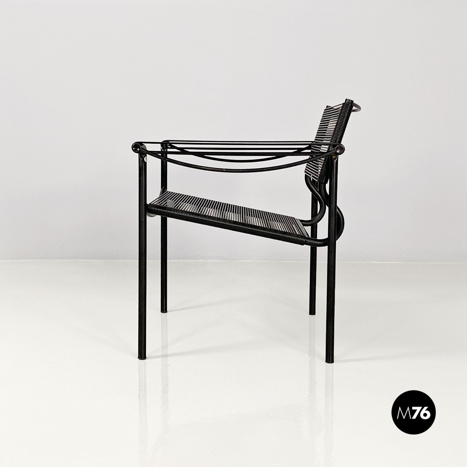 Poltrona modello Spaghetti con struttura in metallo verniciato nero dalla forma geometrica e seduta, schienale e braccioli in plastica o scooby nero.