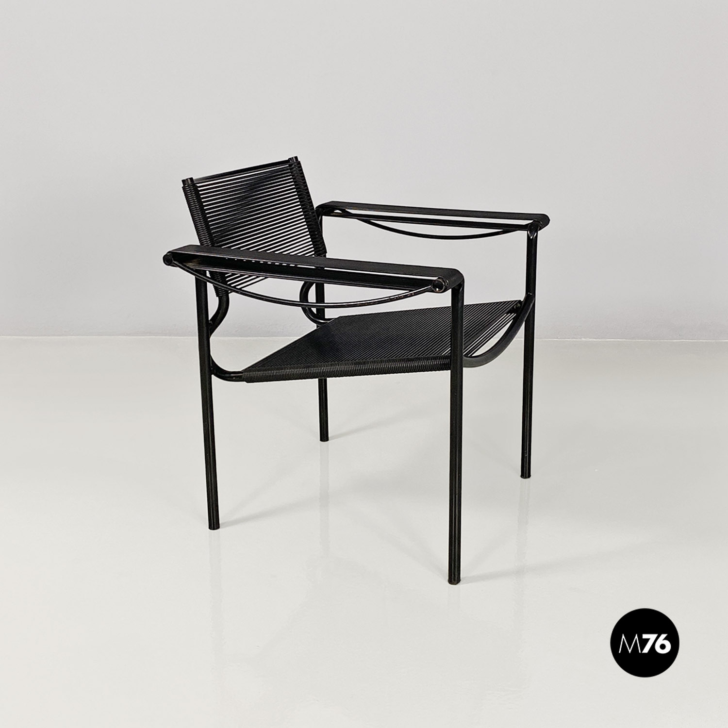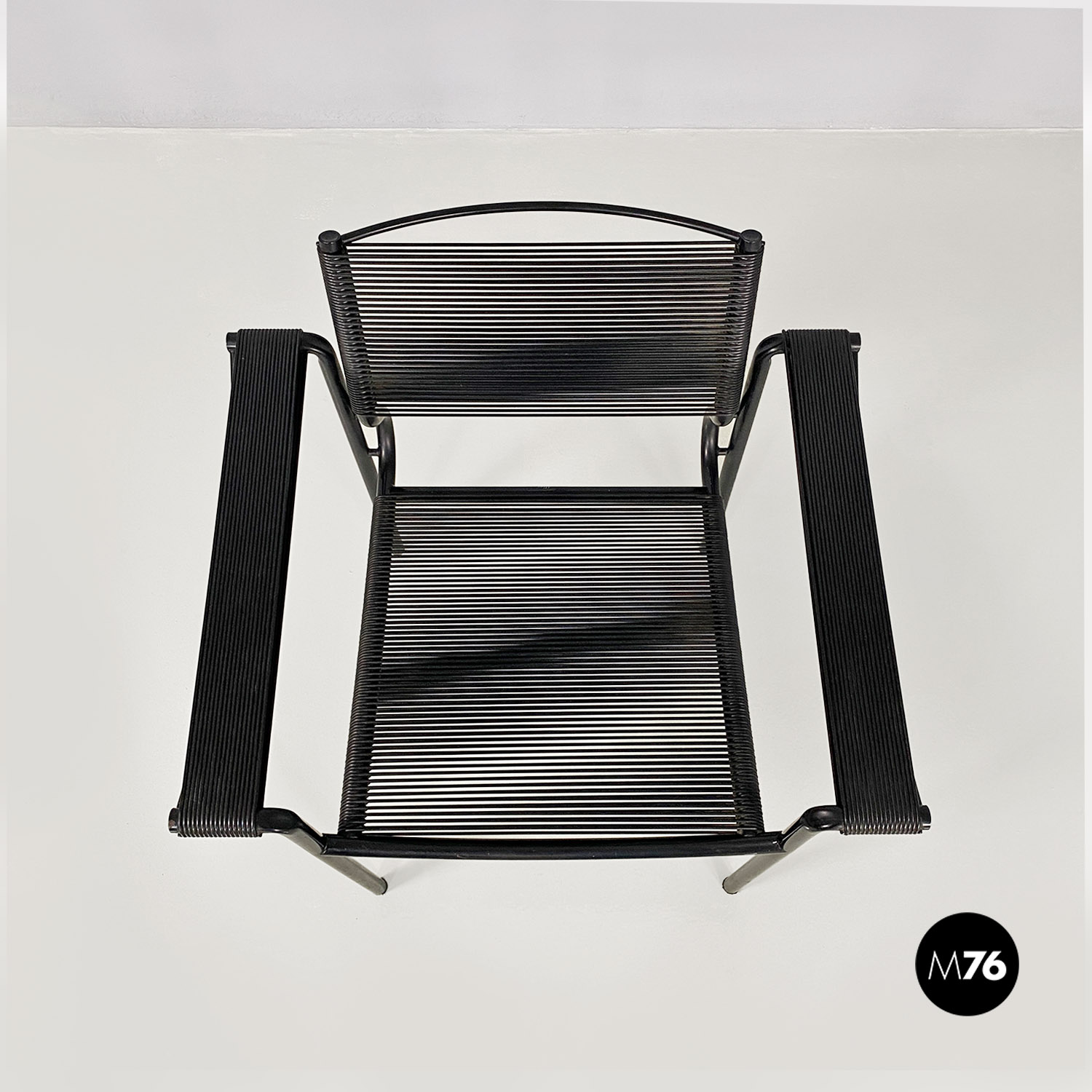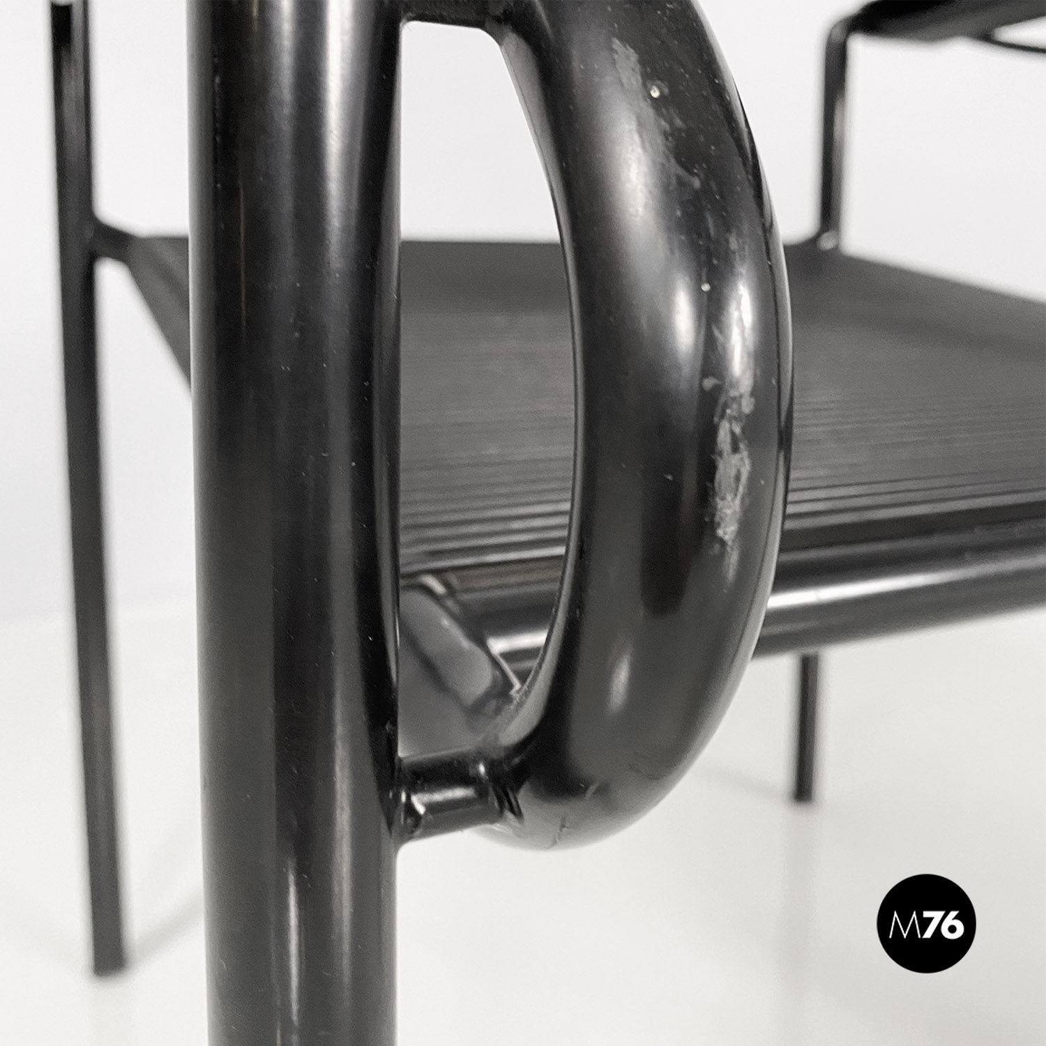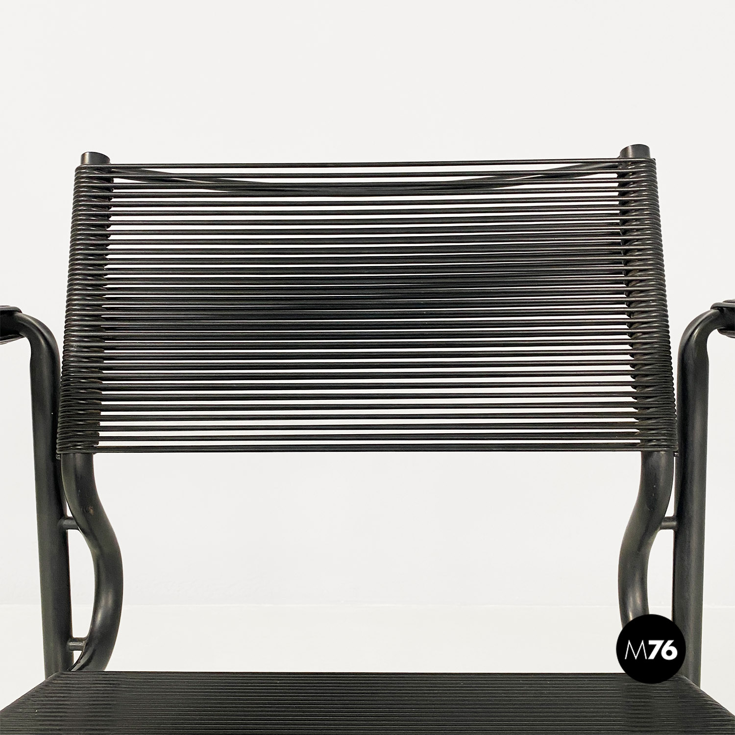 Poltrona modello Spaghetti con struttura in metallo verniciato nero dalla forma geometrica e seduta, schienale e braccioli in plastica o scooby nero.