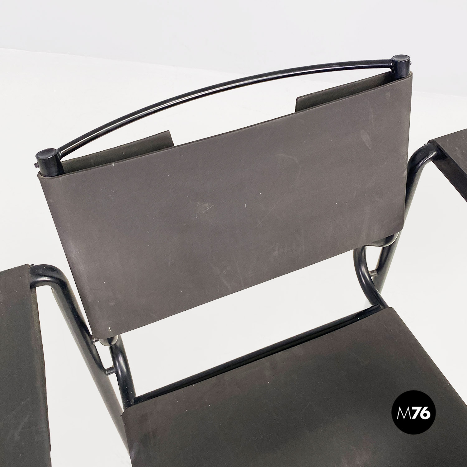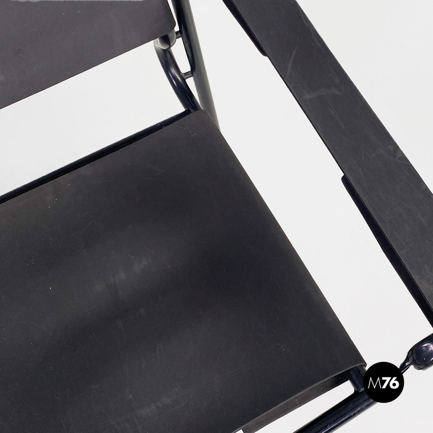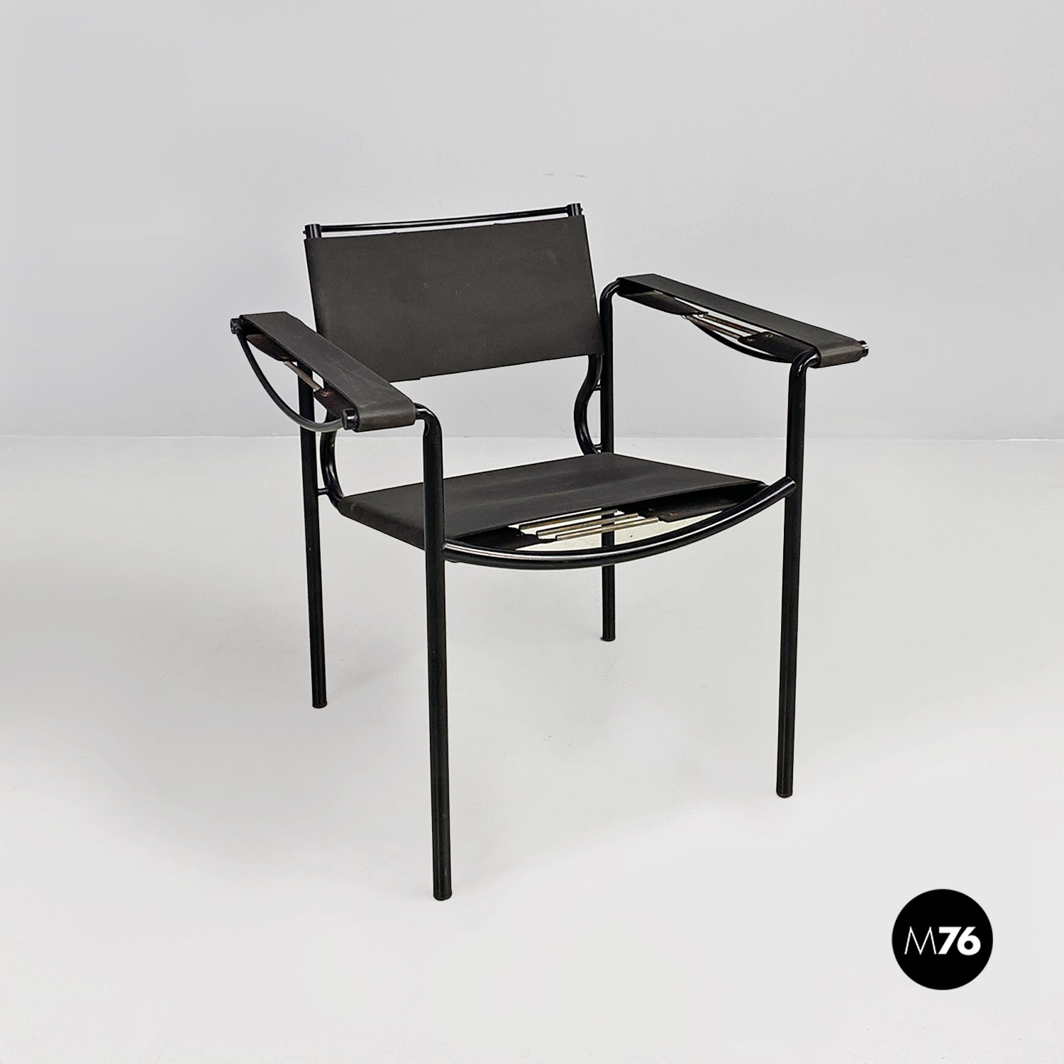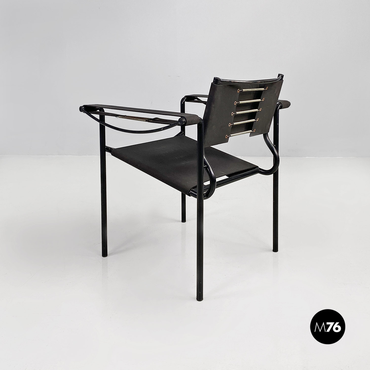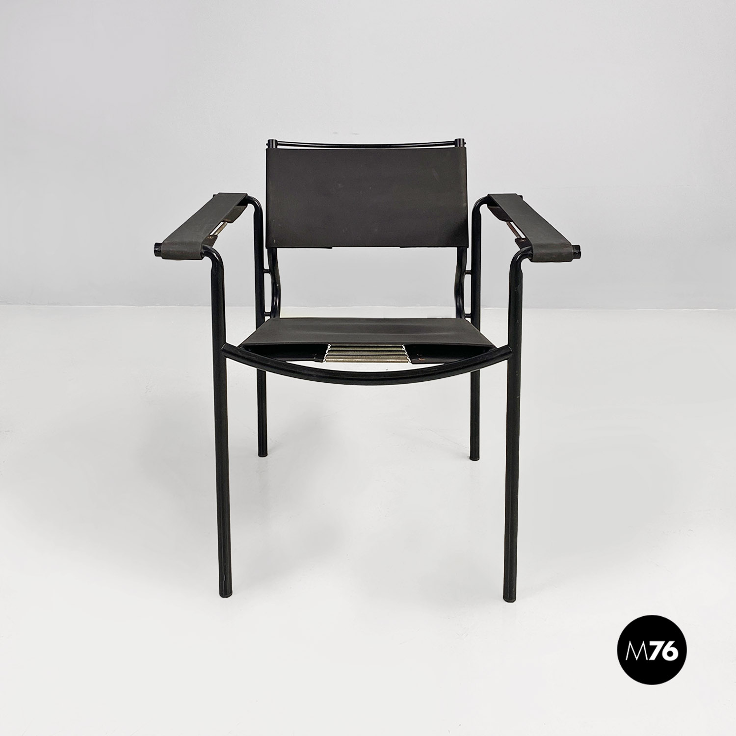 Poltrona modello Spaghetti con struttura in metallo verniciato nero, seduta quadrata e schienale in pelle ecologica di colore nero opaco.
