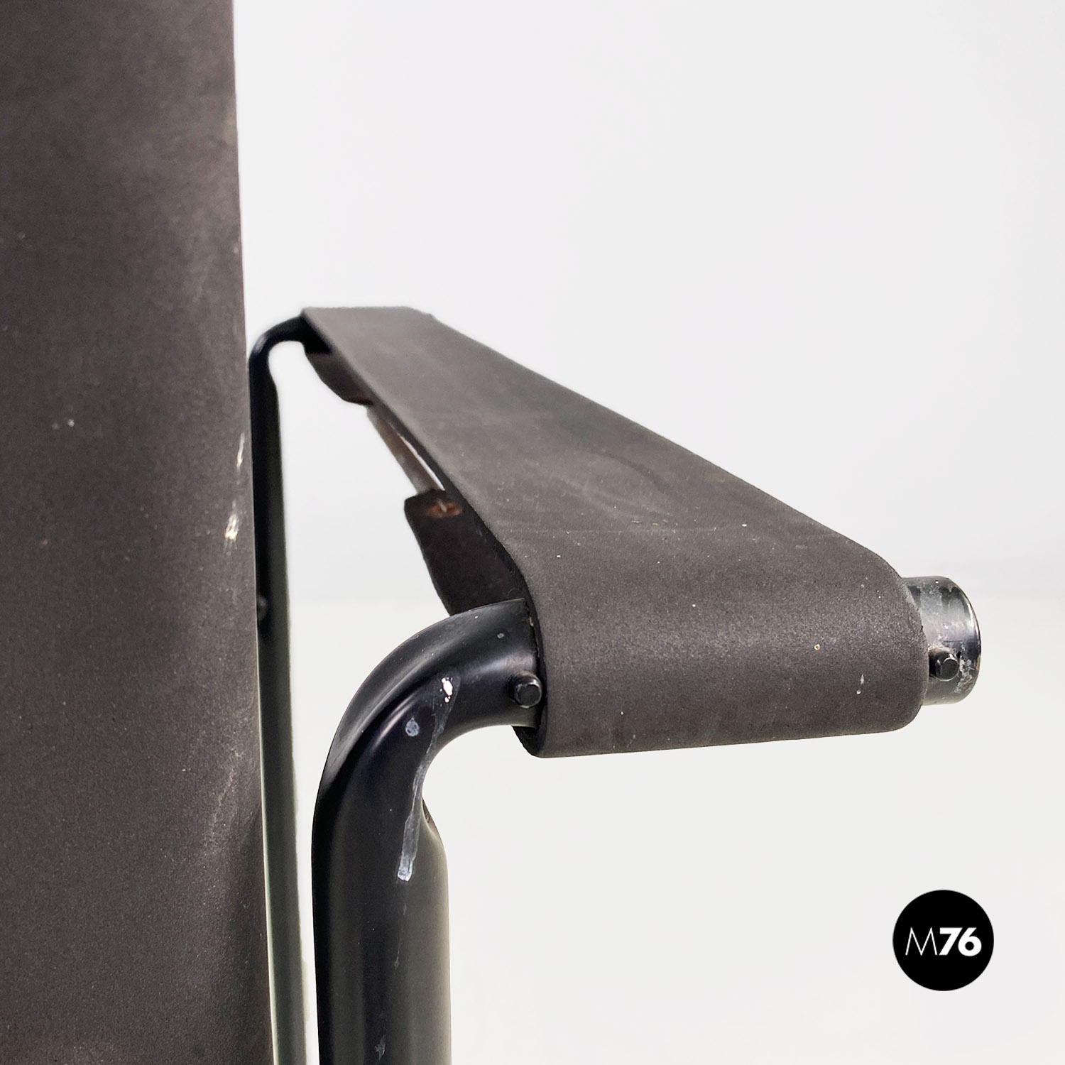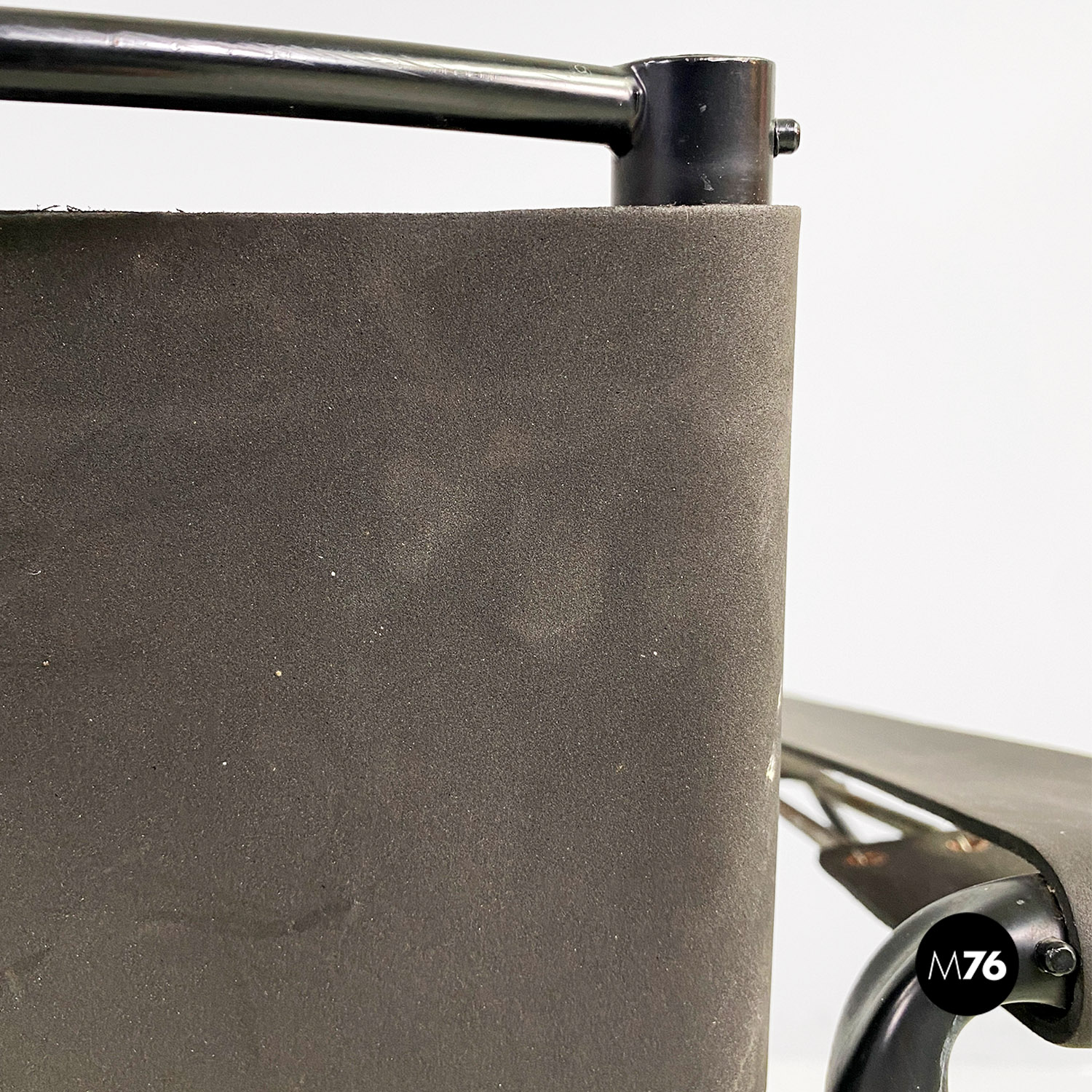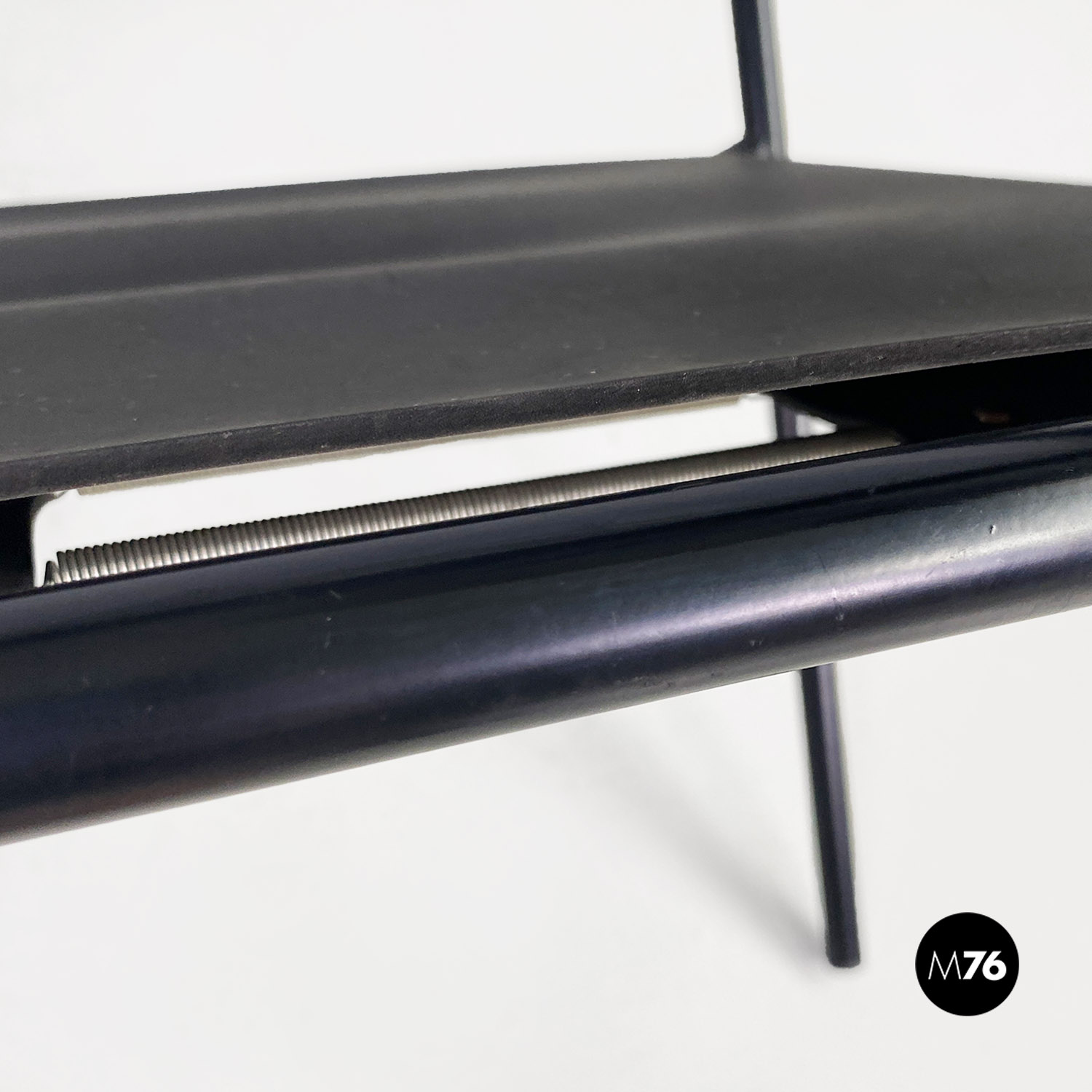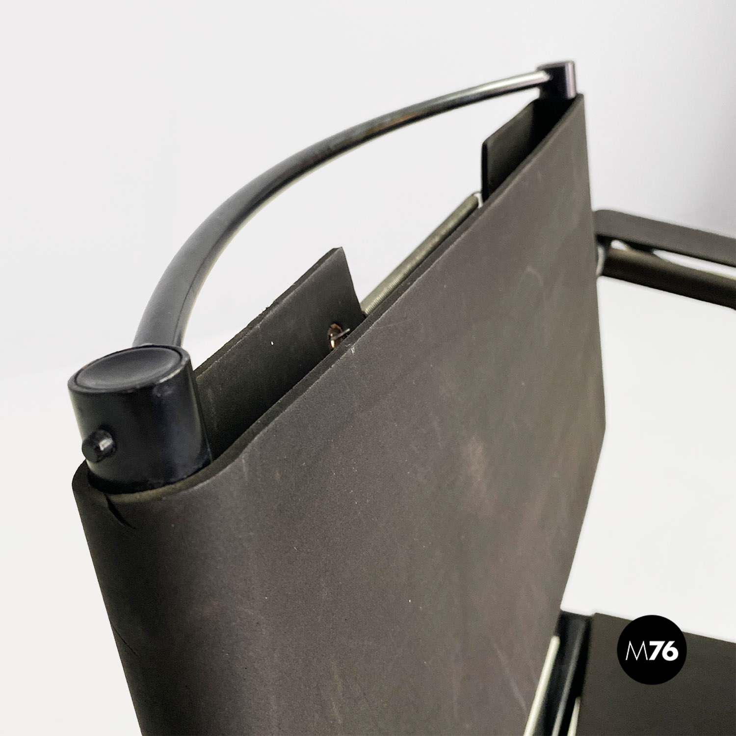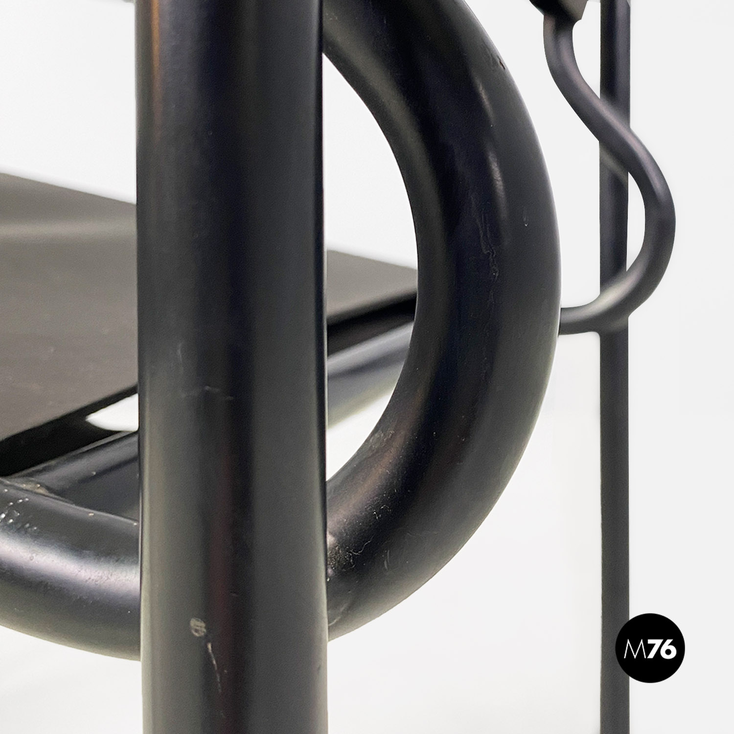 Poltrona modello Spaghetti con struttura in metallo verniciato nero, seduta quadrata e schienale in pelle ecologica di colore nero opaco.