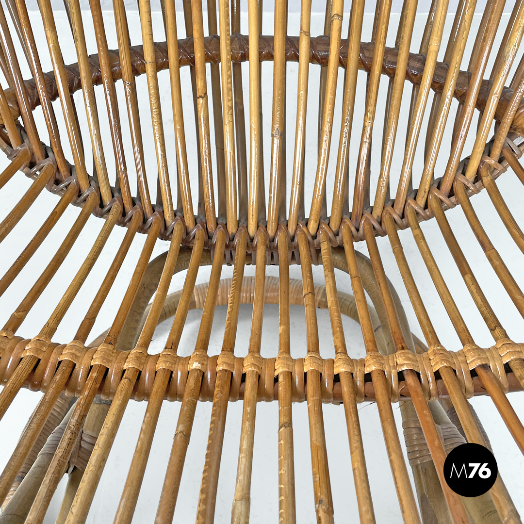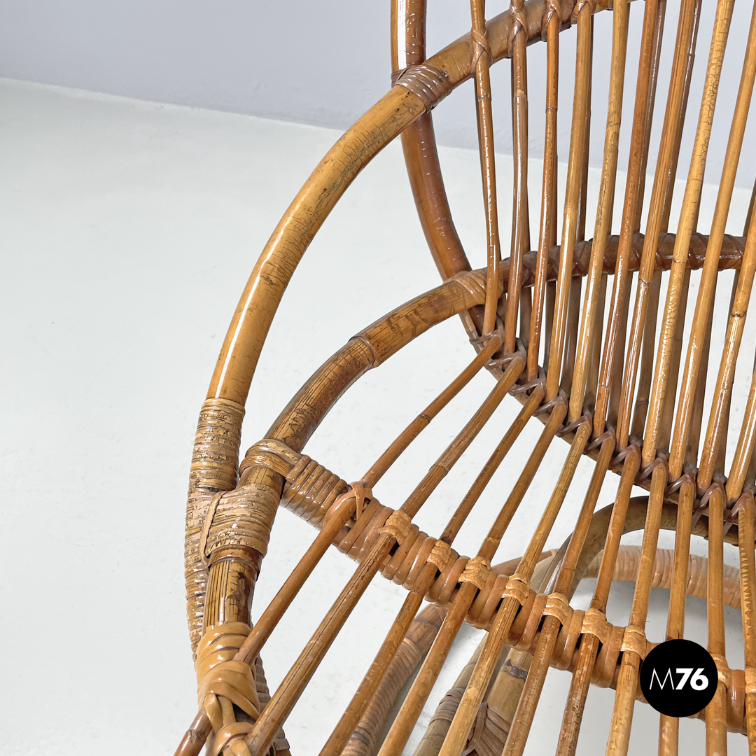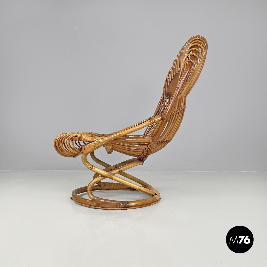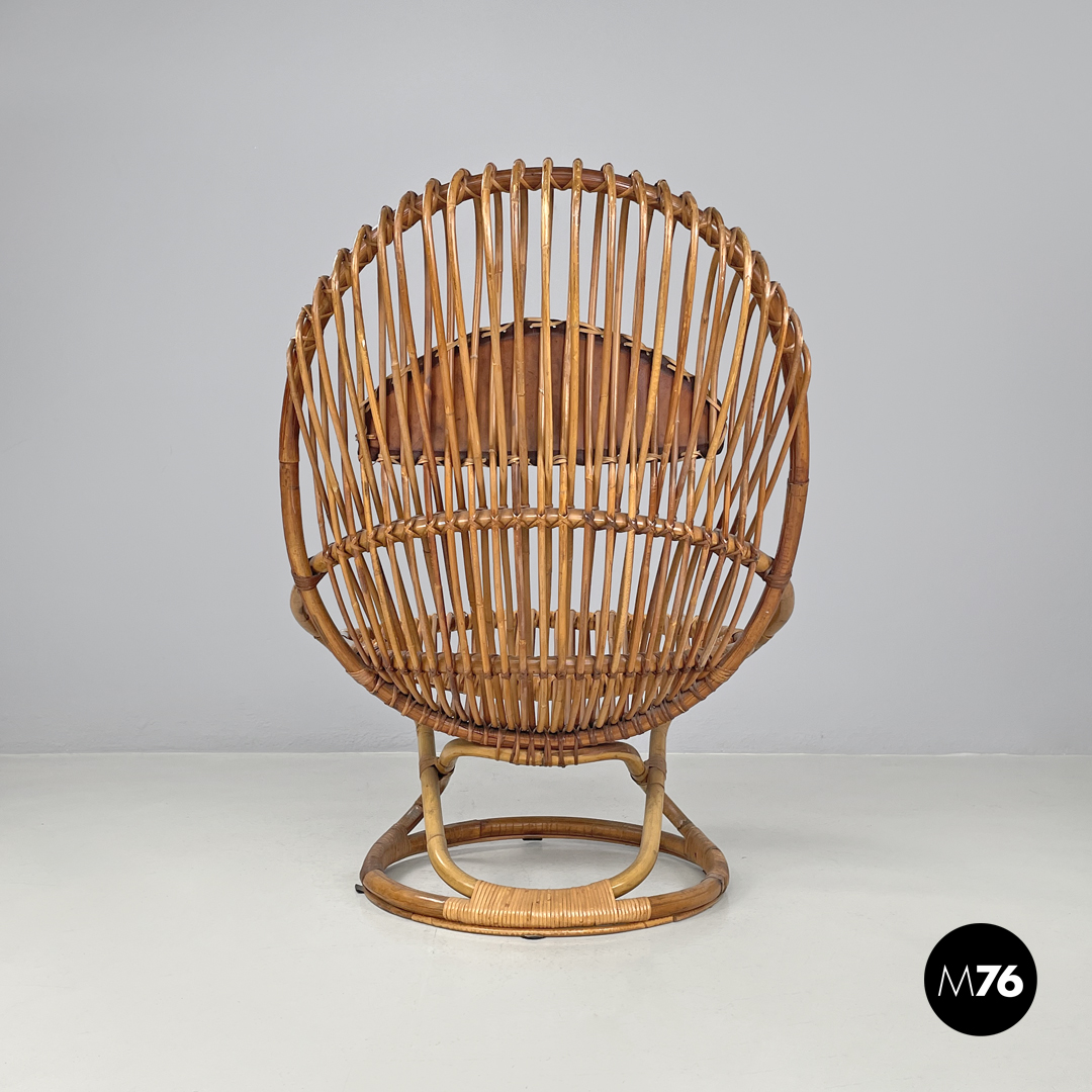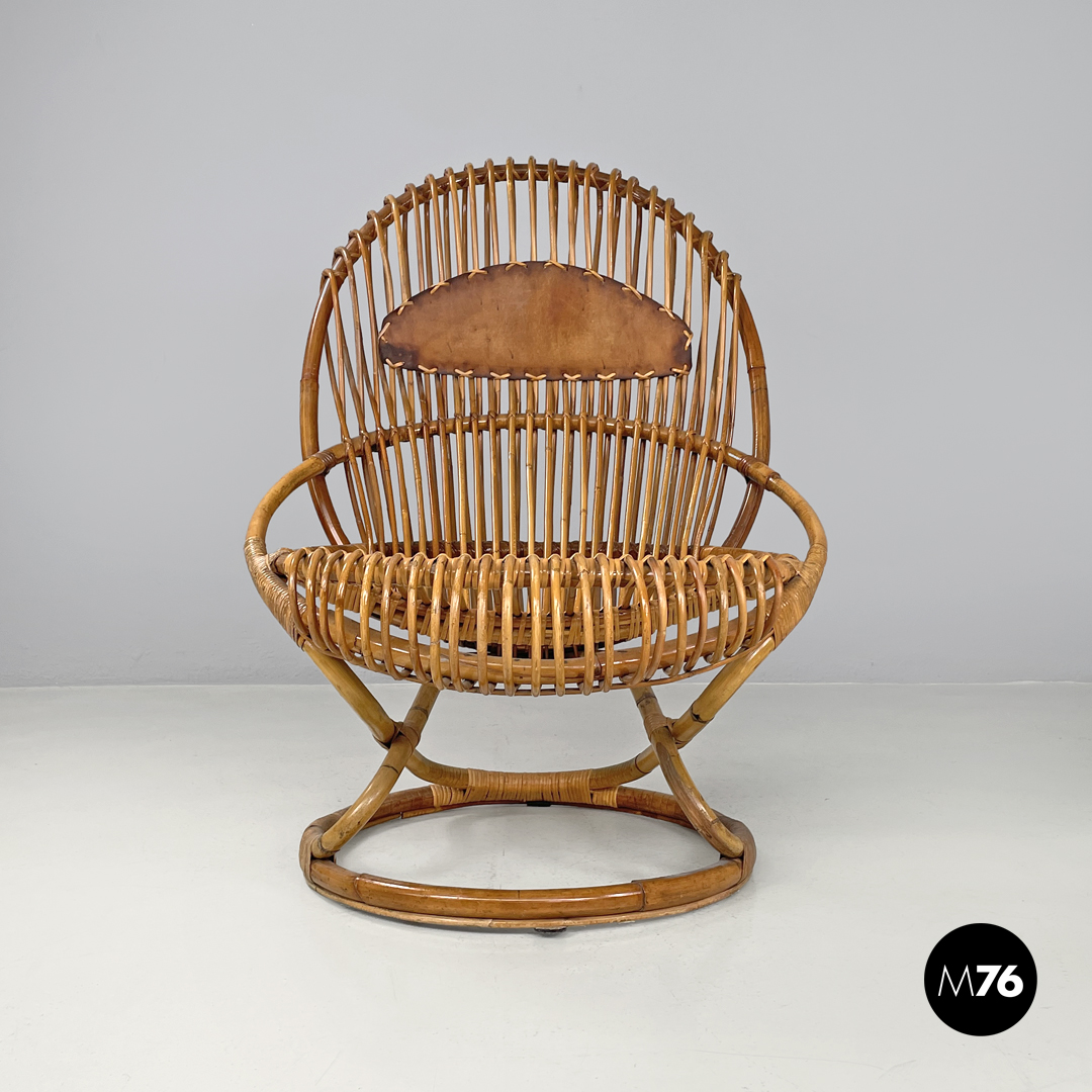 Poltrona modello Tre Cerchi a base tonda in rattan. La struttura si basa su tre cerchi che si incrociano, intrecciandosi, a forma la seduta, lo schienale e la base. Nella parte alta dello schienale presenta un poggia testa semicircolare in pelle marrone unito alla struttura tramite intrecci incrociati di rattan.