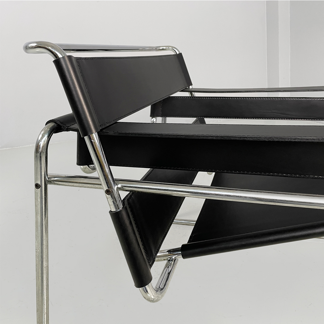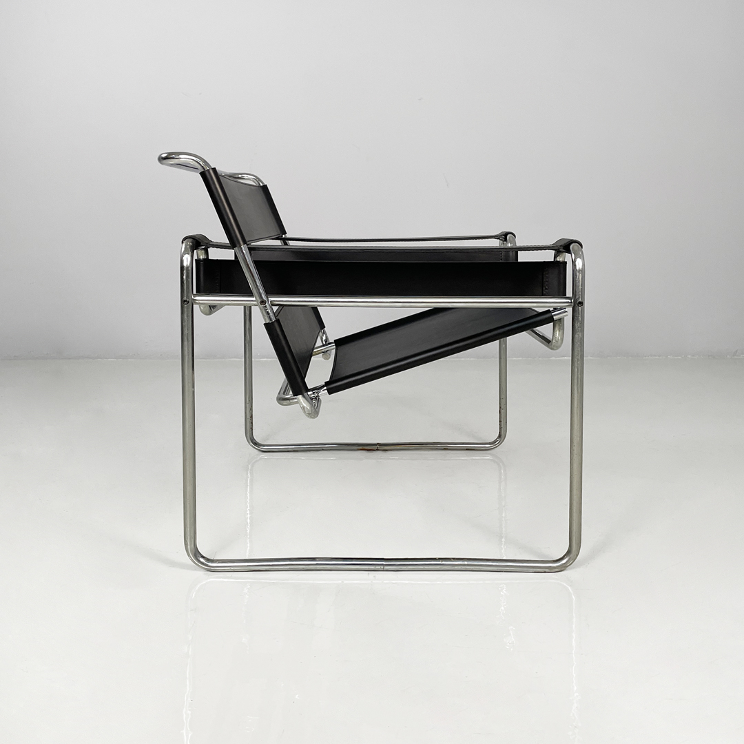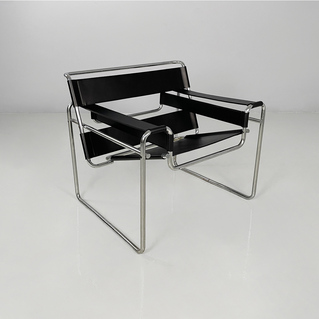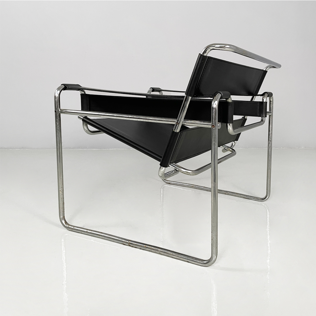 Poltrona modello Wassily o B3 in pelle nera. Lo schienale, i braccioli e la seduta sono a fasce interamente in cuoio con cuciture a vista. La struttura è in tubolare di acciaio cromato.