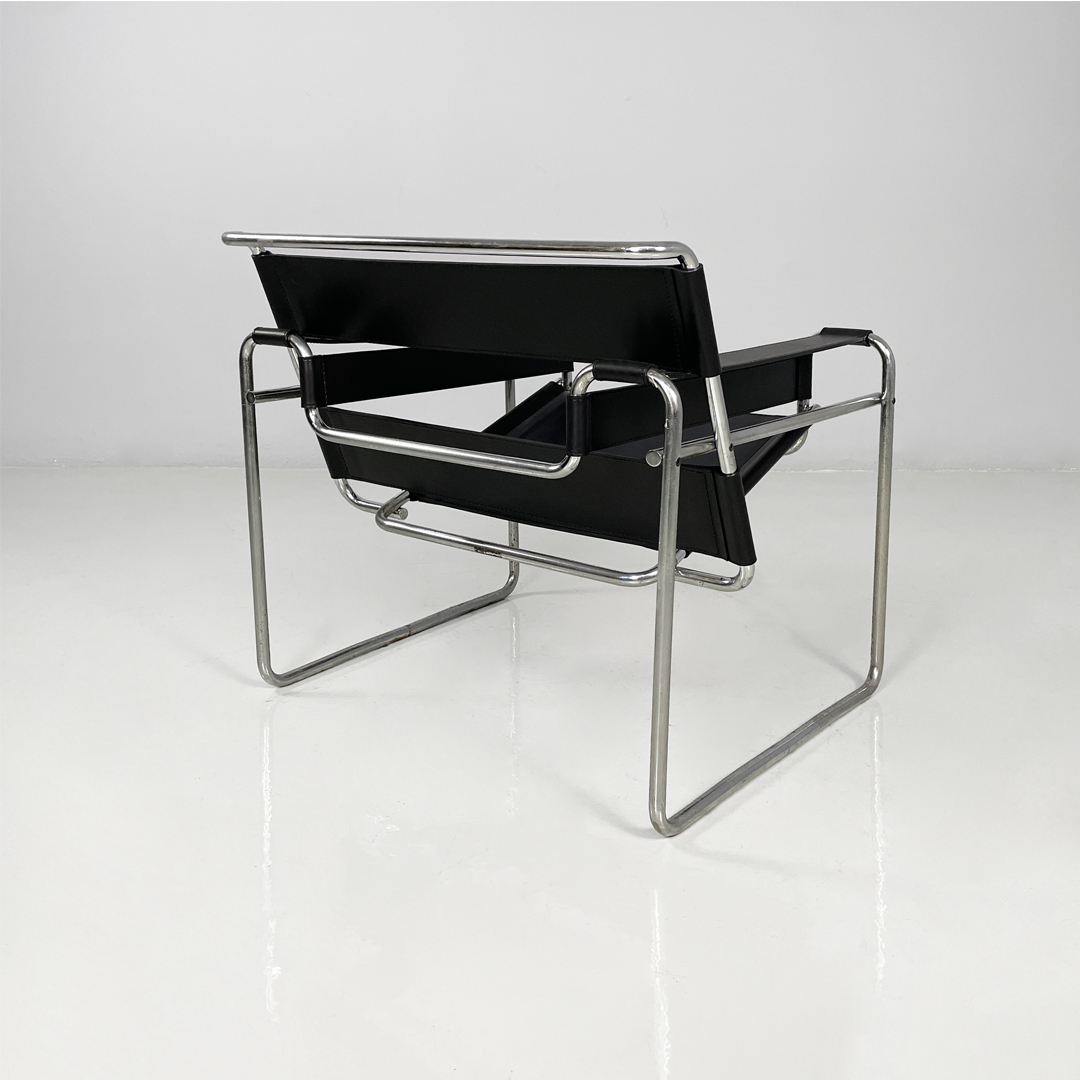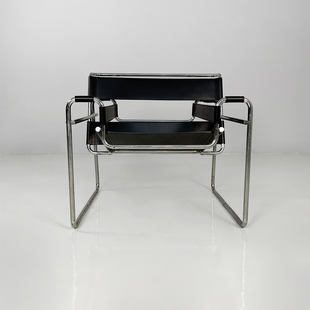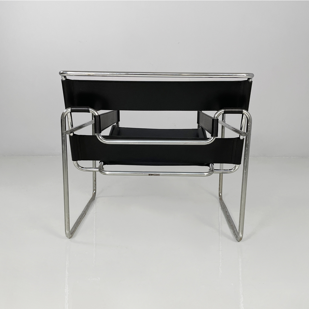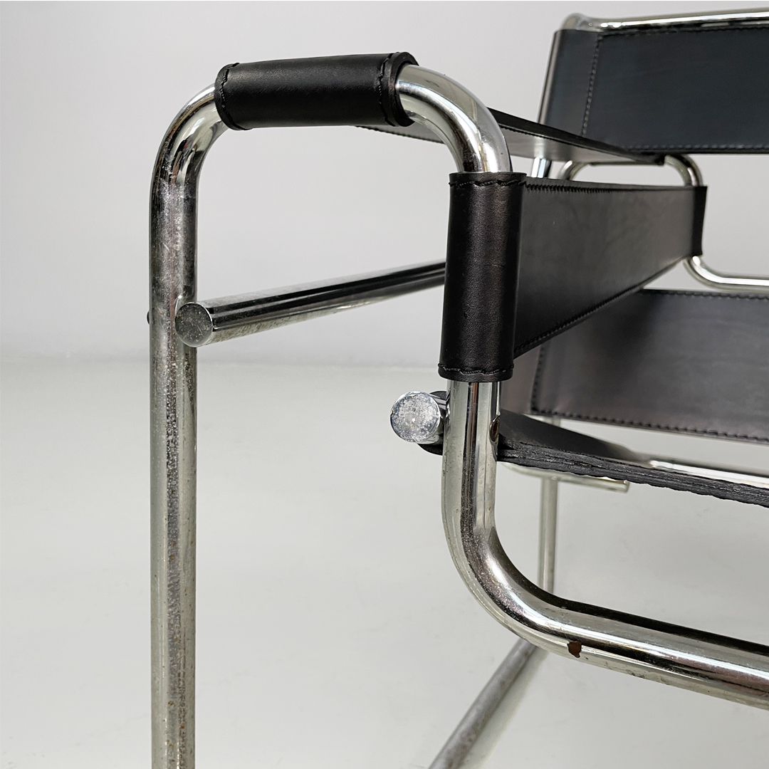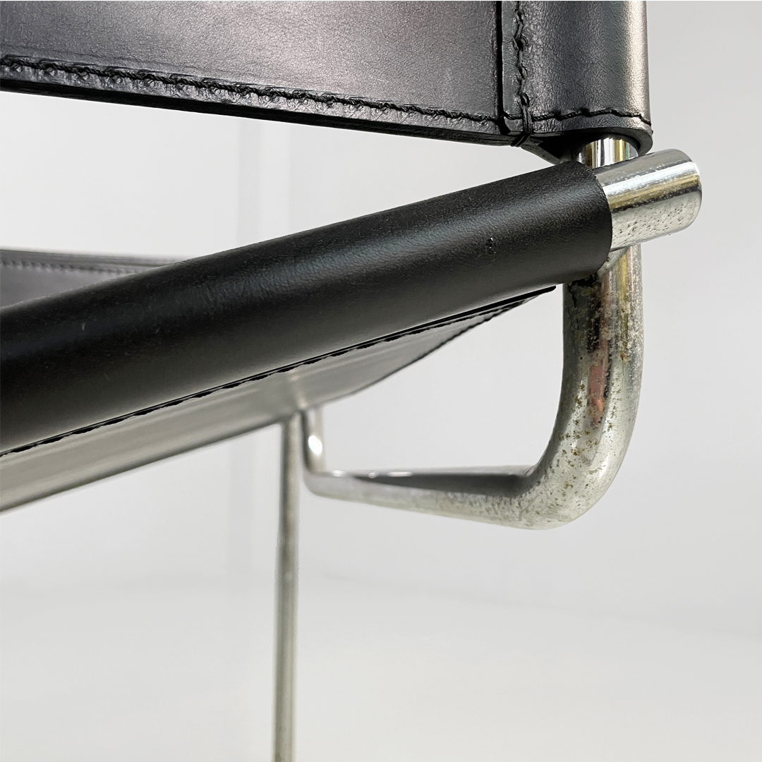 Poltrona modello Wassily o B3 in pelle nera. Lo schienale, i braccioli e la seduta sono a fasce interamente in cuoio con cuciture a vista. La struttura è in tubolare di acciaio cromato.