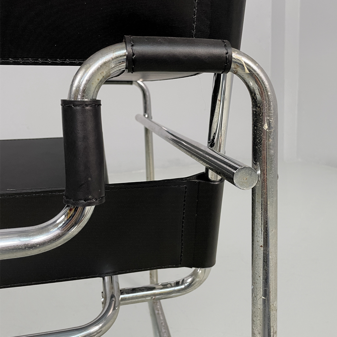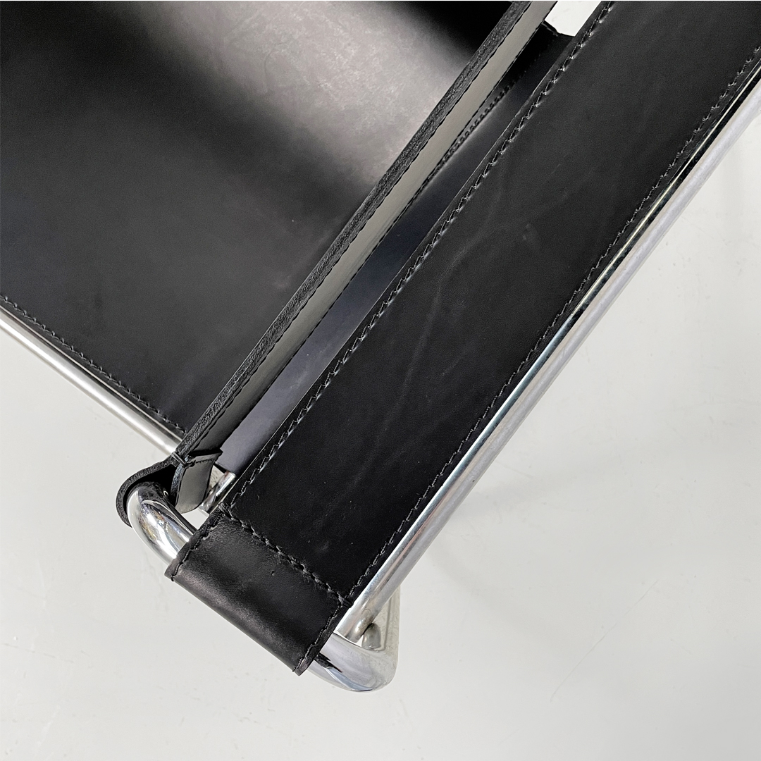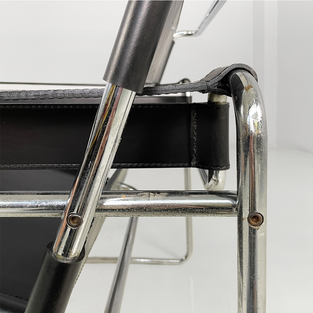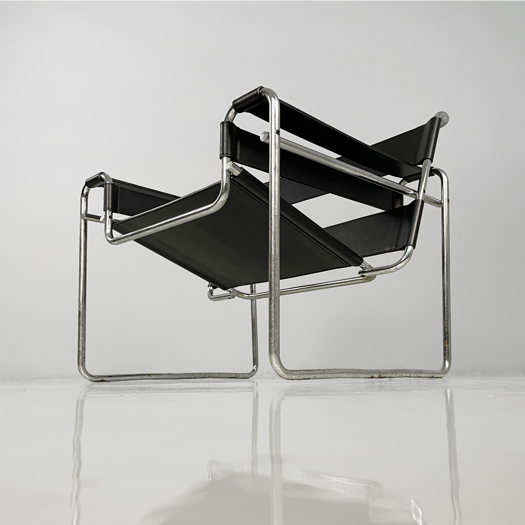 Poltrona modello Wassily o B3 in pelle nera. Lo schienale, i braccioli e la seduta sono a fasce interamente in cuoio con cuciture a vista. La struttura è in tubolare di acciaio cromato.