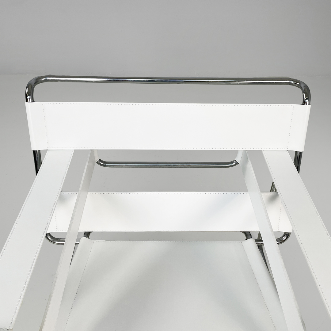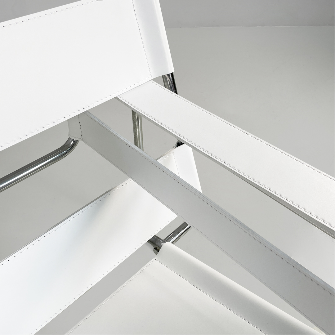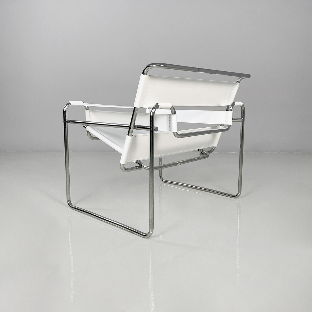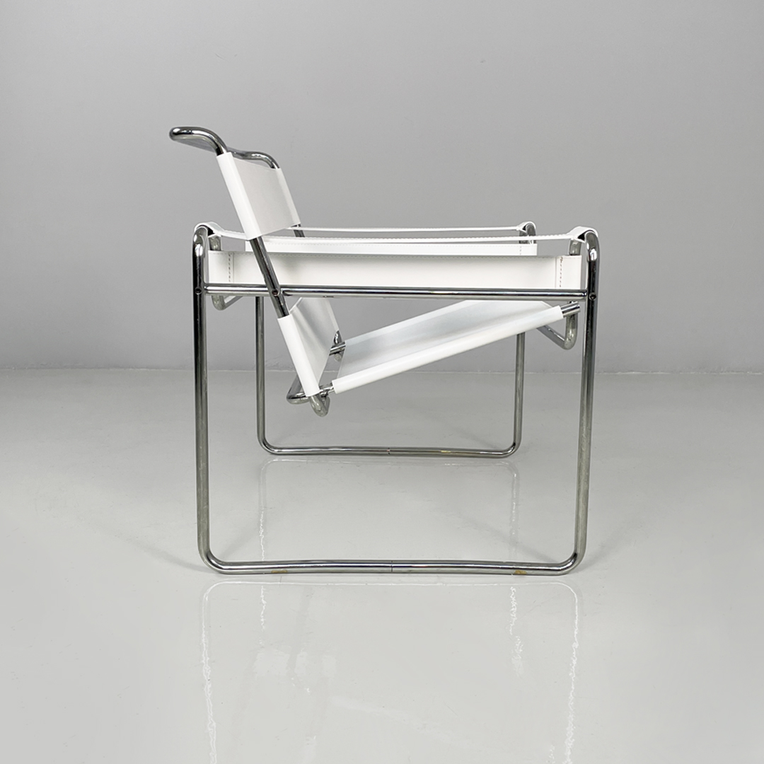 Poltrona modello Wassily o B3 in pelle bianca. Lo schienale, i braccioli e la seduta sono a fasce interamente in cuoio con cuciture a vista. La struttura è in tubolare di acciaio cromato.
