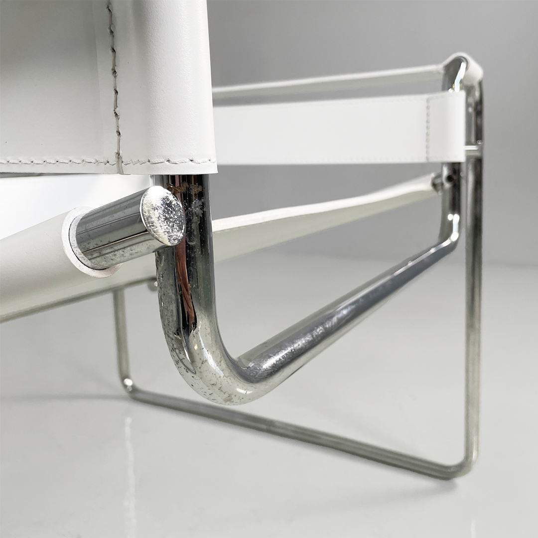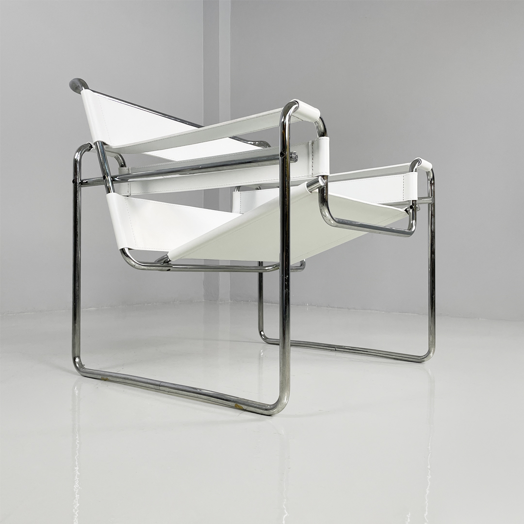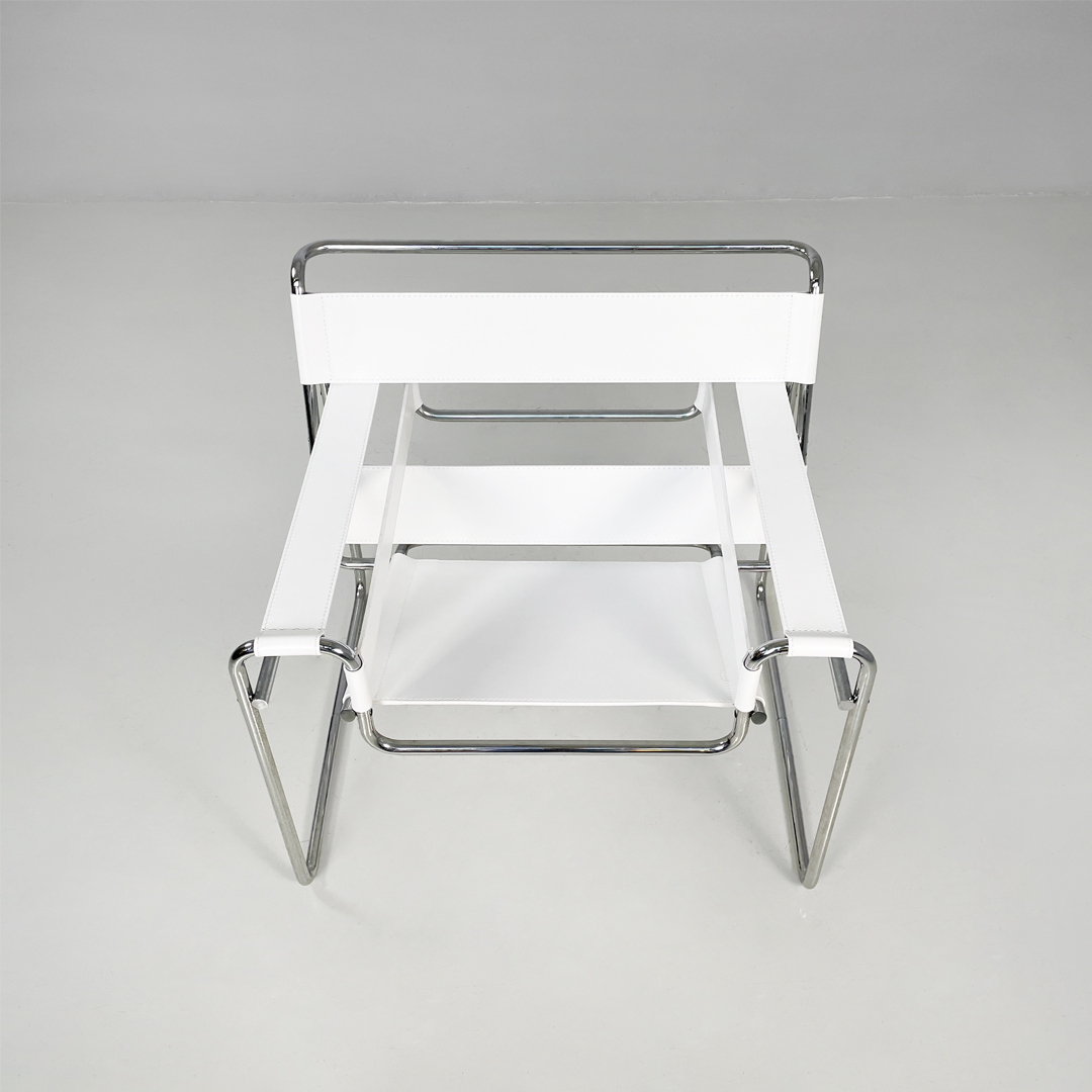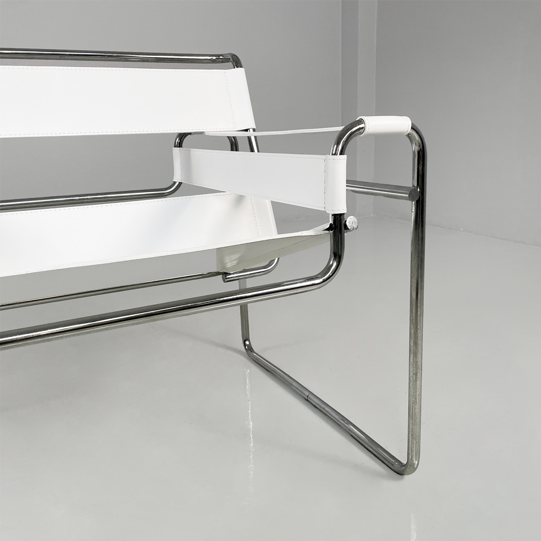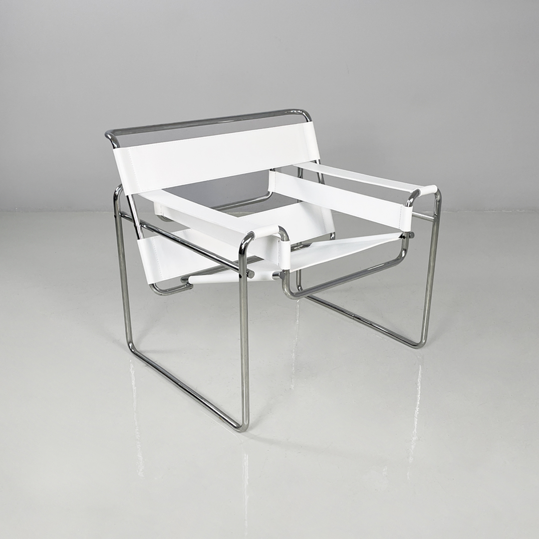 Poltrona modello Wassily o B3 in pelle bianca. Lo schienale, i braccioli e la seduta sono a fasce interamente in cuoio con cuciture a vista. La struttura è in tubolare di acciaio cromato.