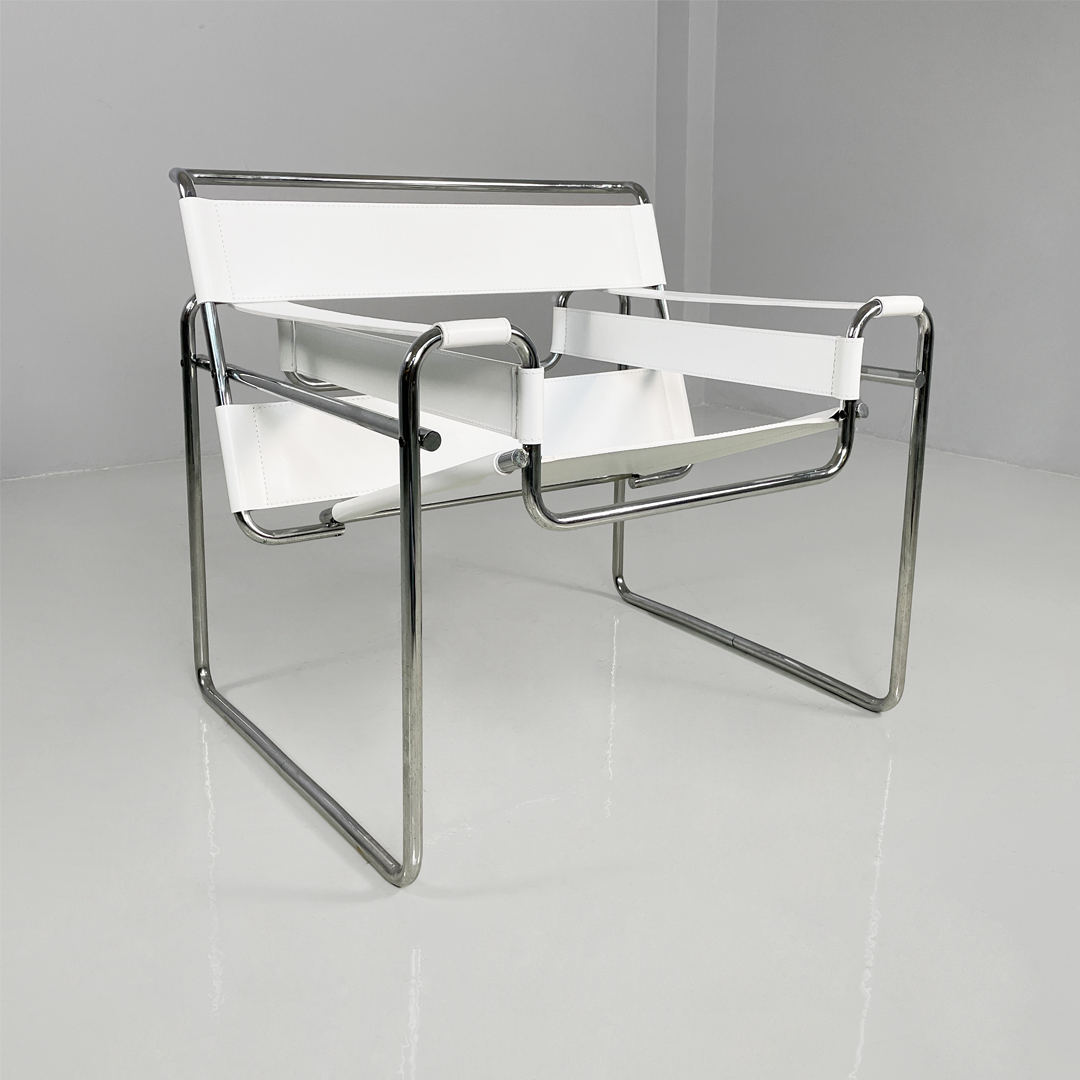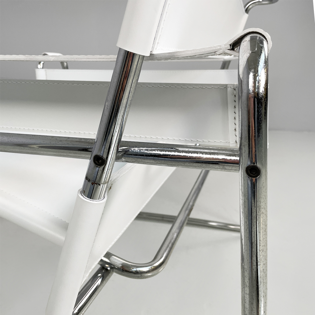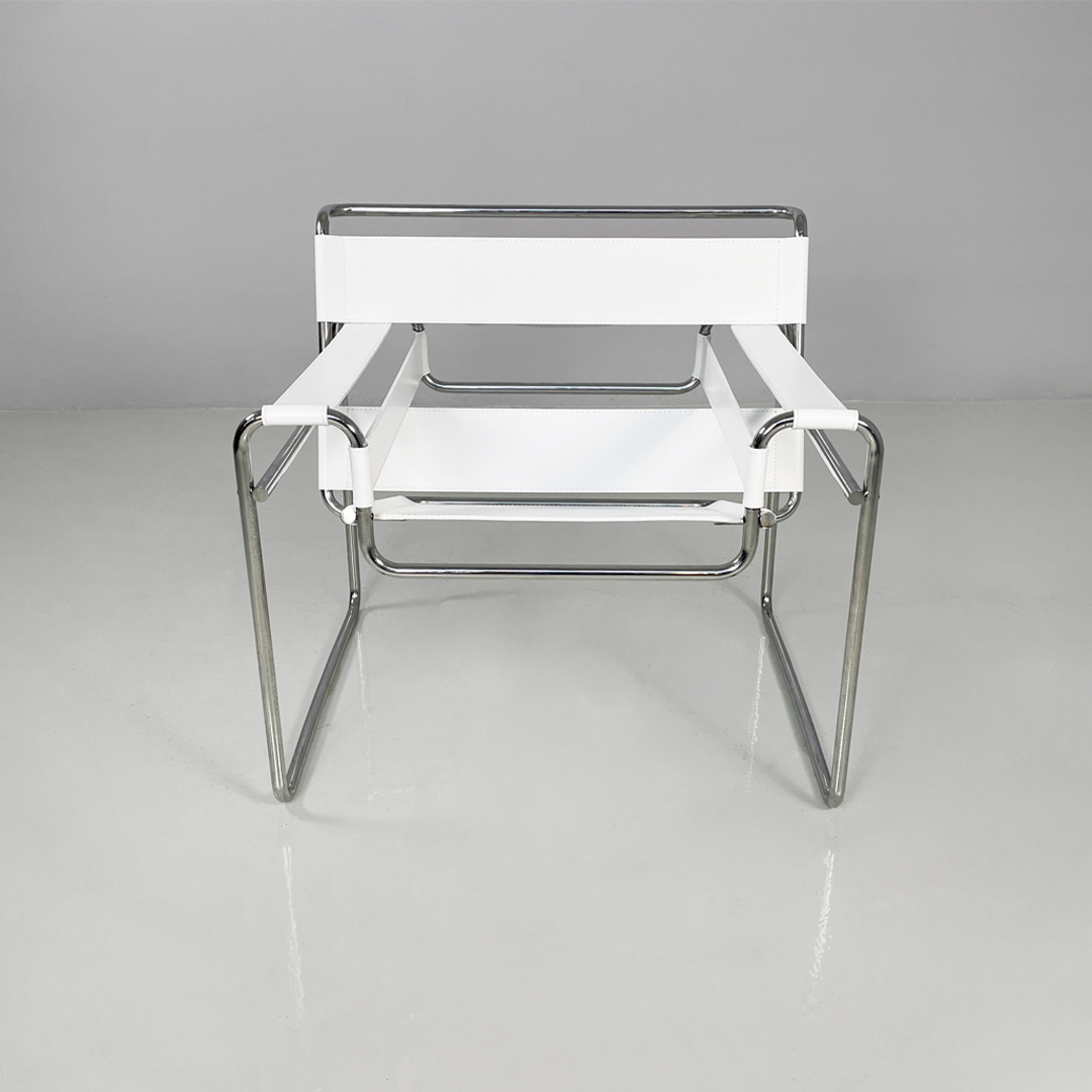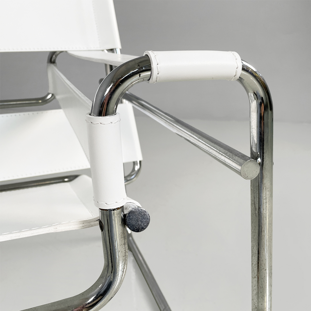 Poltrona modello Wassily o B3 in pelle bianca. Lo schienale, i braccioli e la seduta sono a fasce interamente in cuoio con cuciture a vista. La struttura è in tubolare di acciaio cromato.