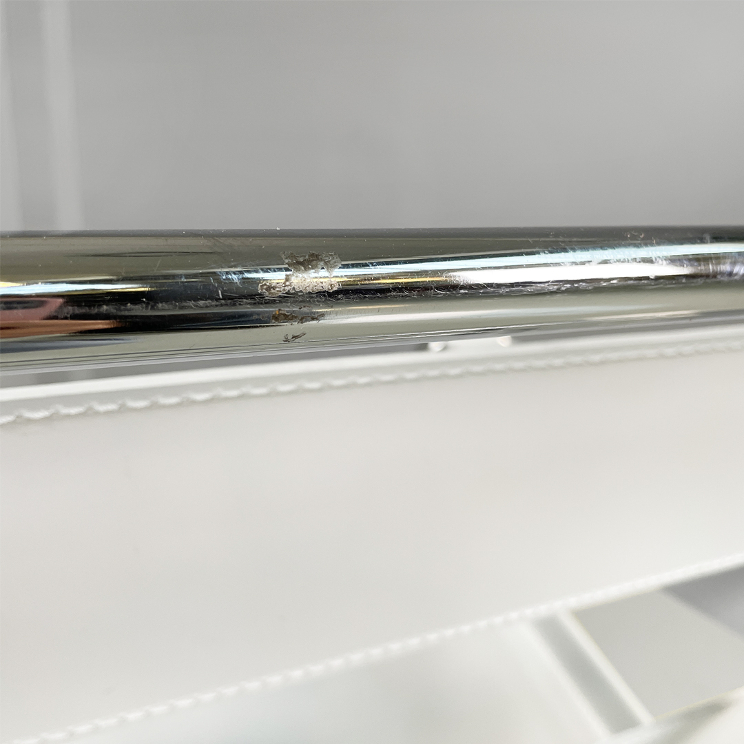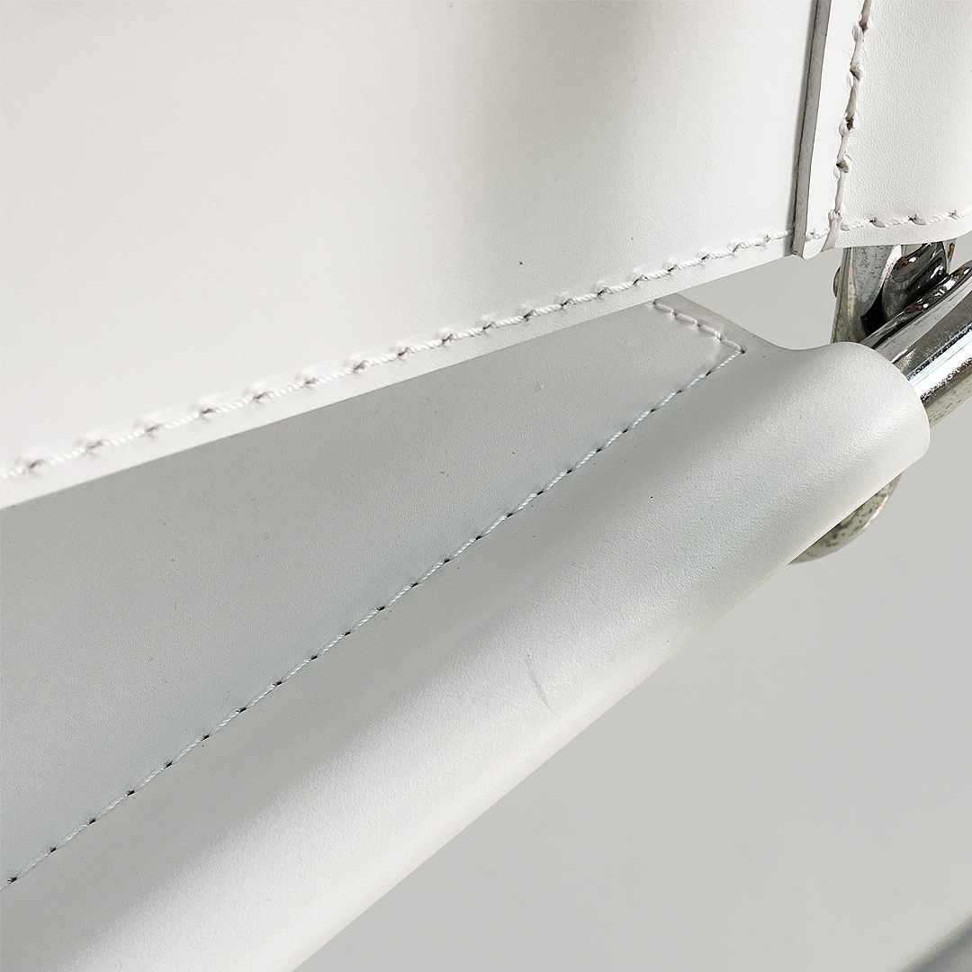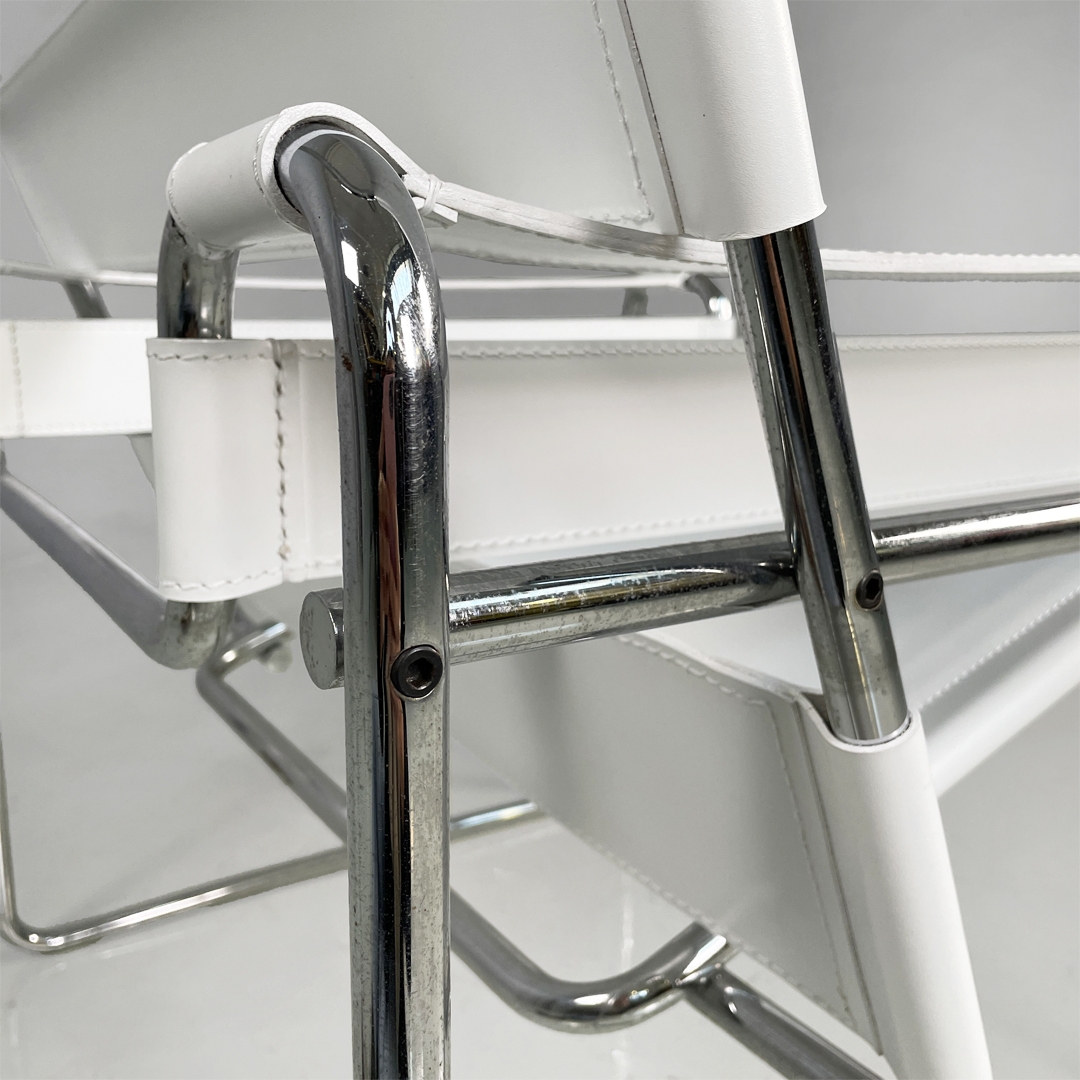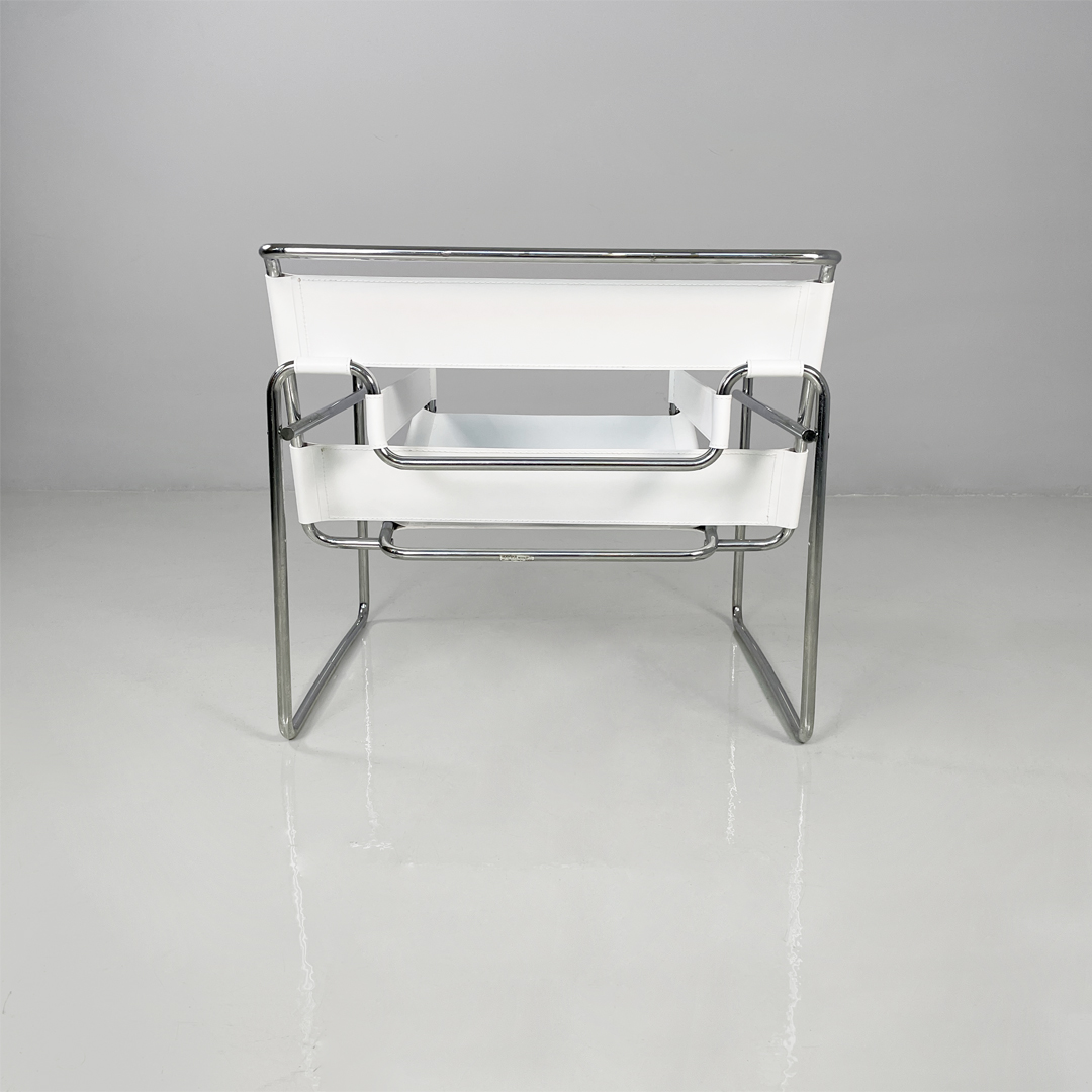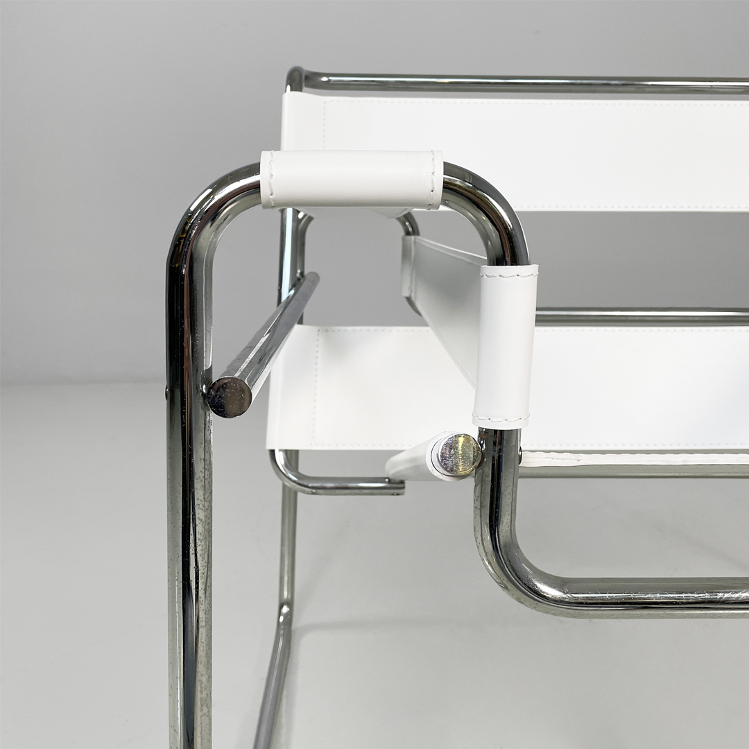 Poltrona modello Wassily o B3 in pelle bianca. Lo schienale, i braccioli e la seduta sono a fasce interamente in cuoio con cuciture a vista. La struttura è in tubolare di acciaio cromato.