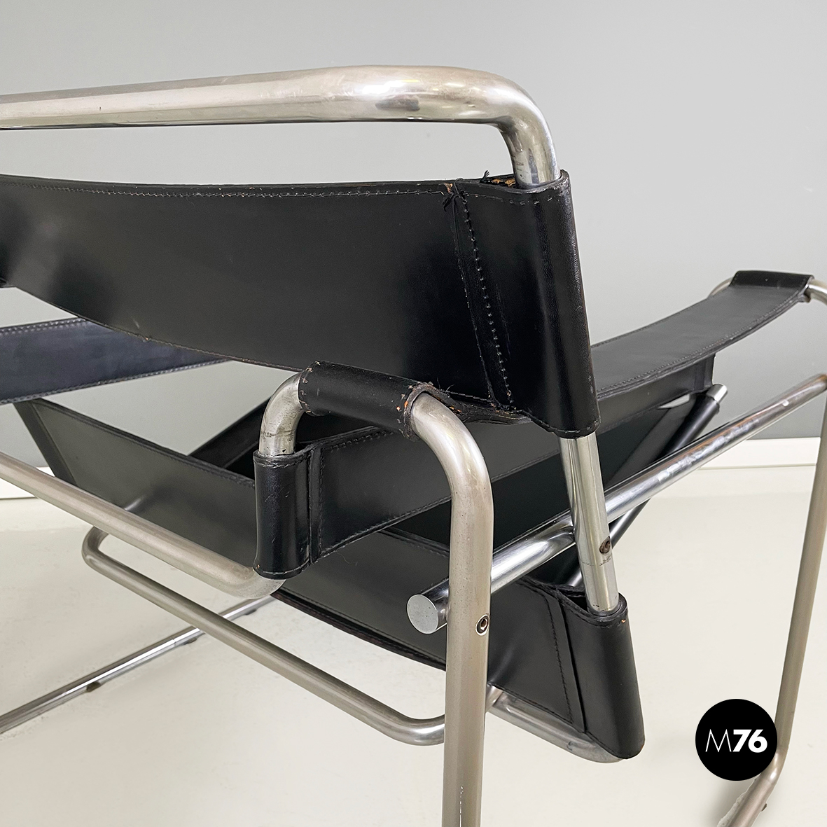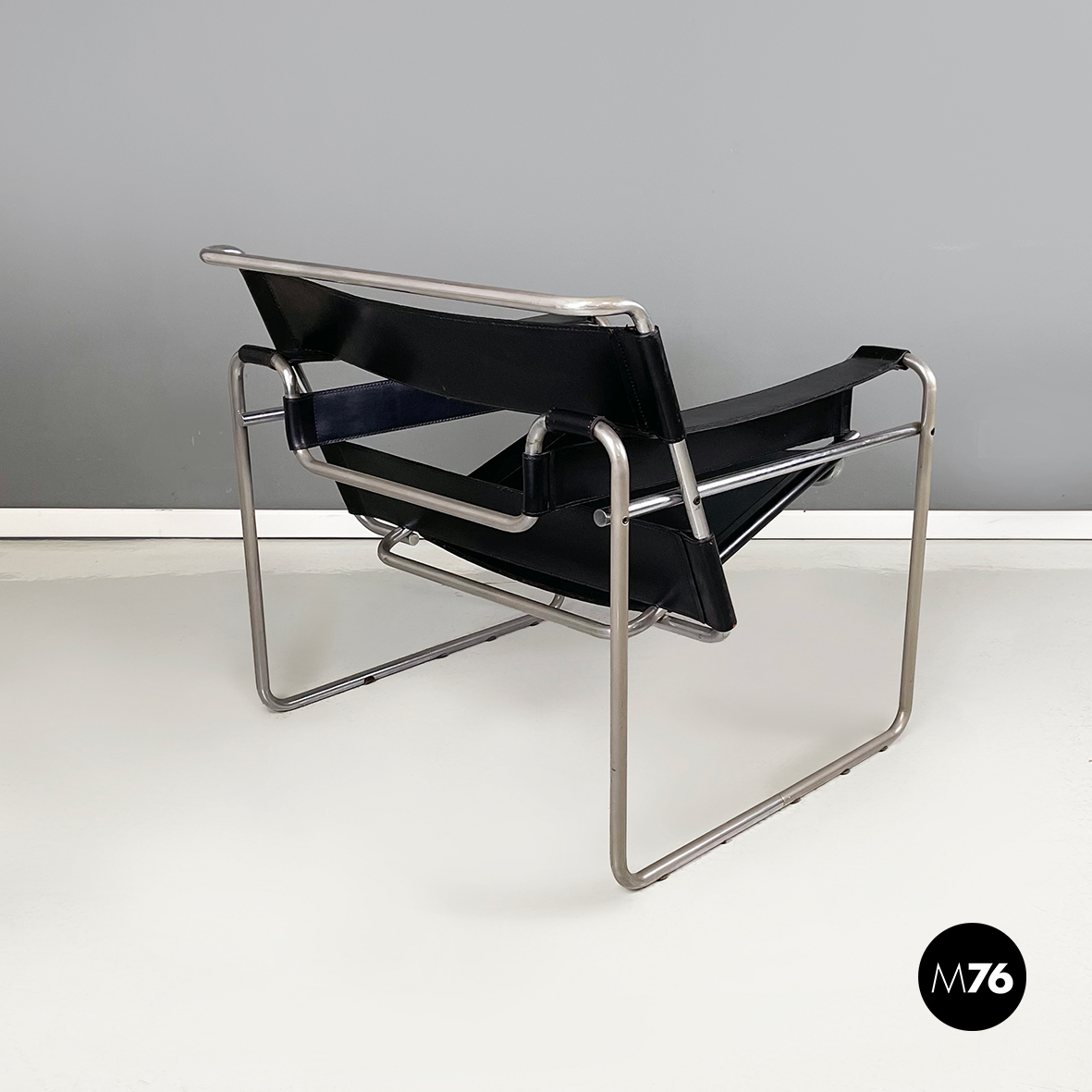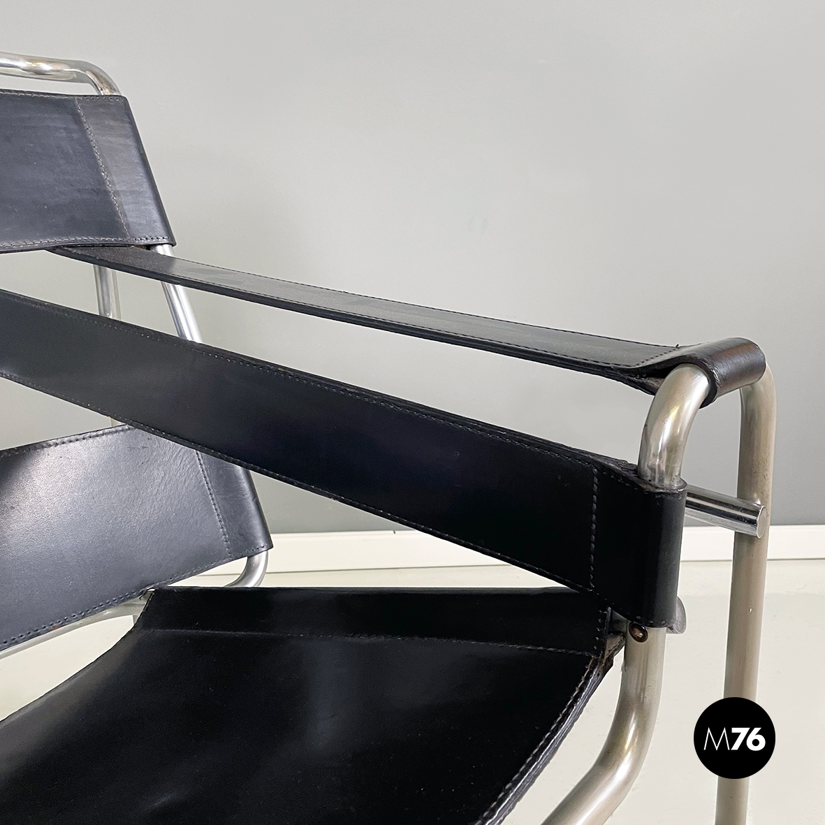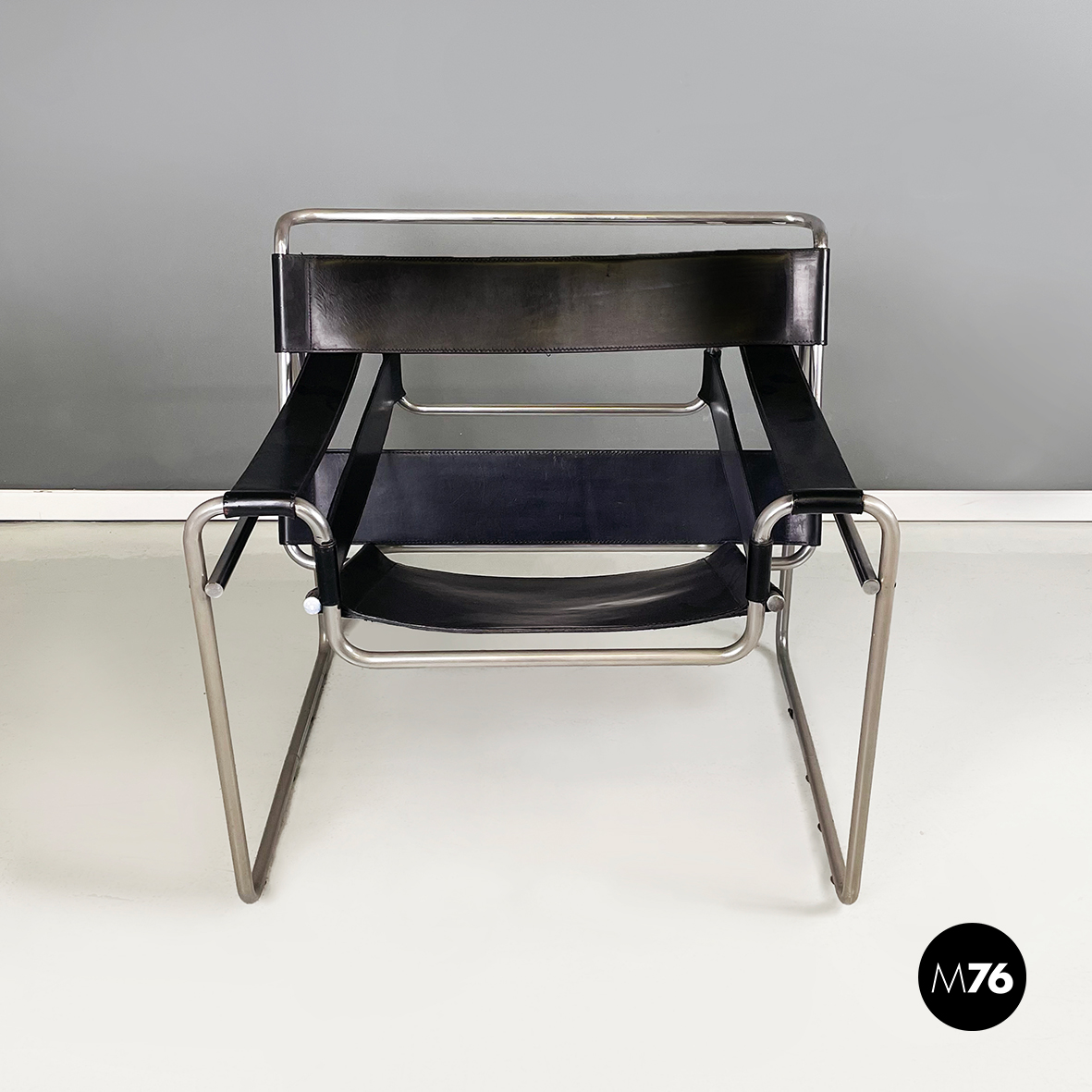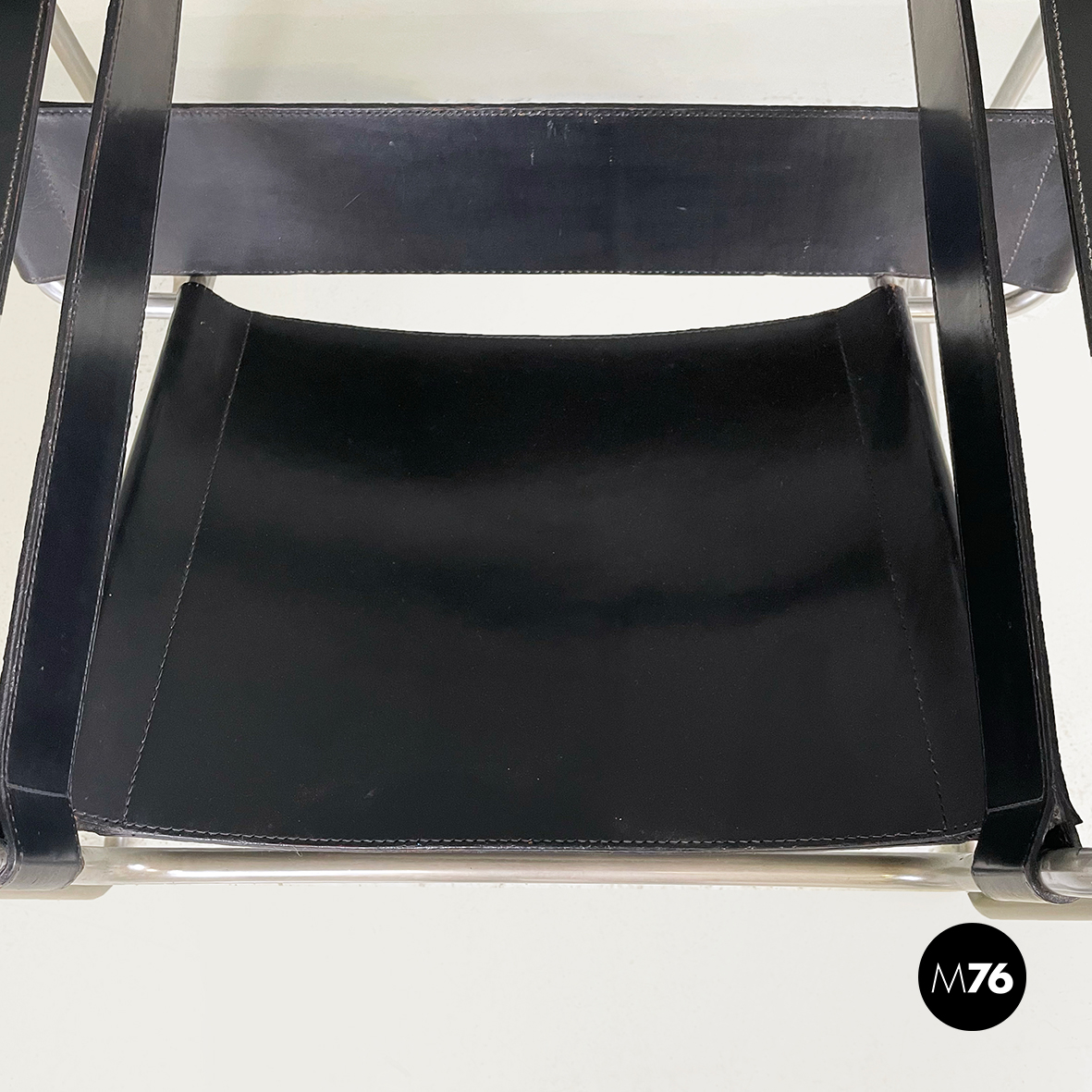 Poltrona modello Wassily o B3, con struttura in tubolare di acciaio cromato. La seduta, i braccioli e lo schienale sono composti da fasce interamente in pelle di colore nero, con cuciture a vista.