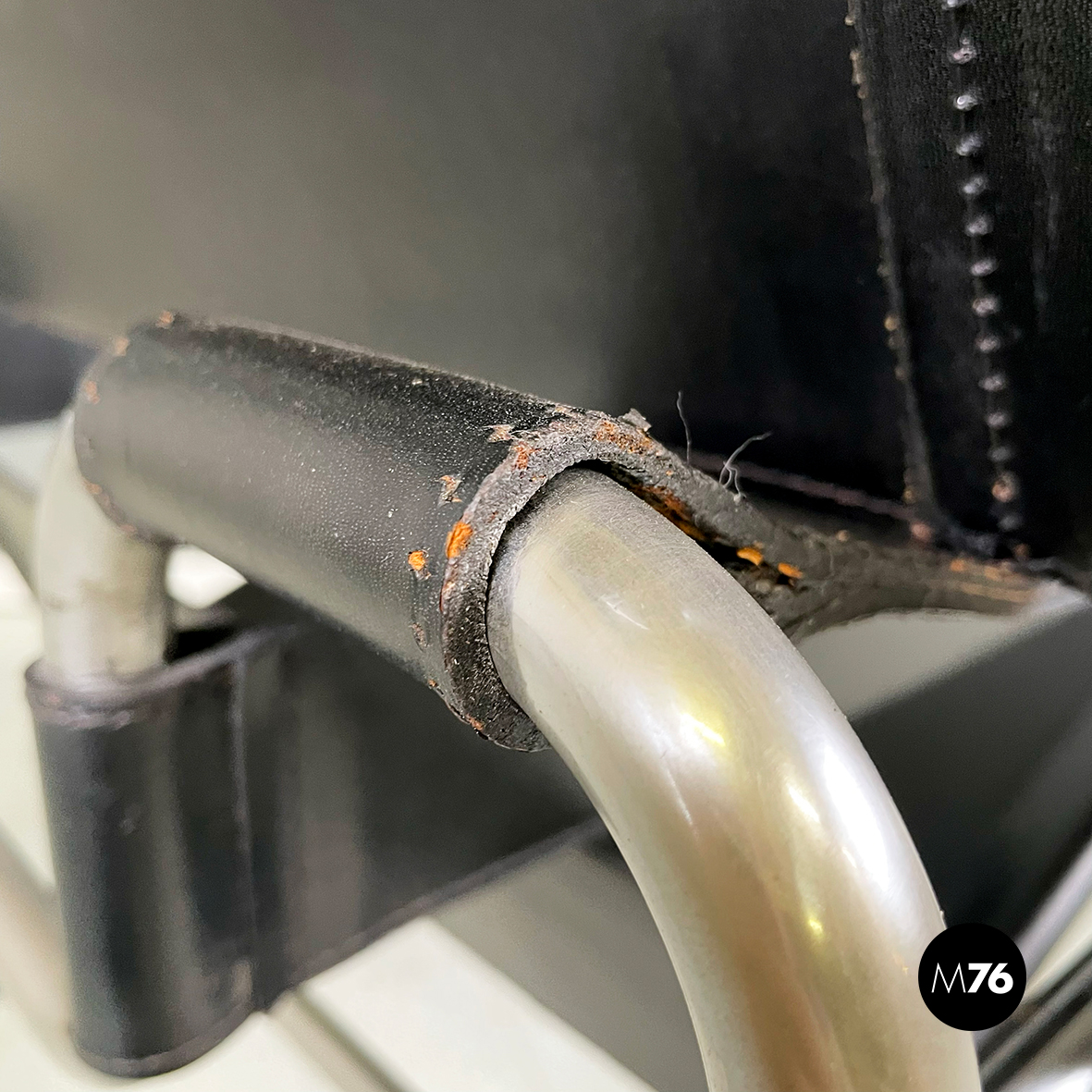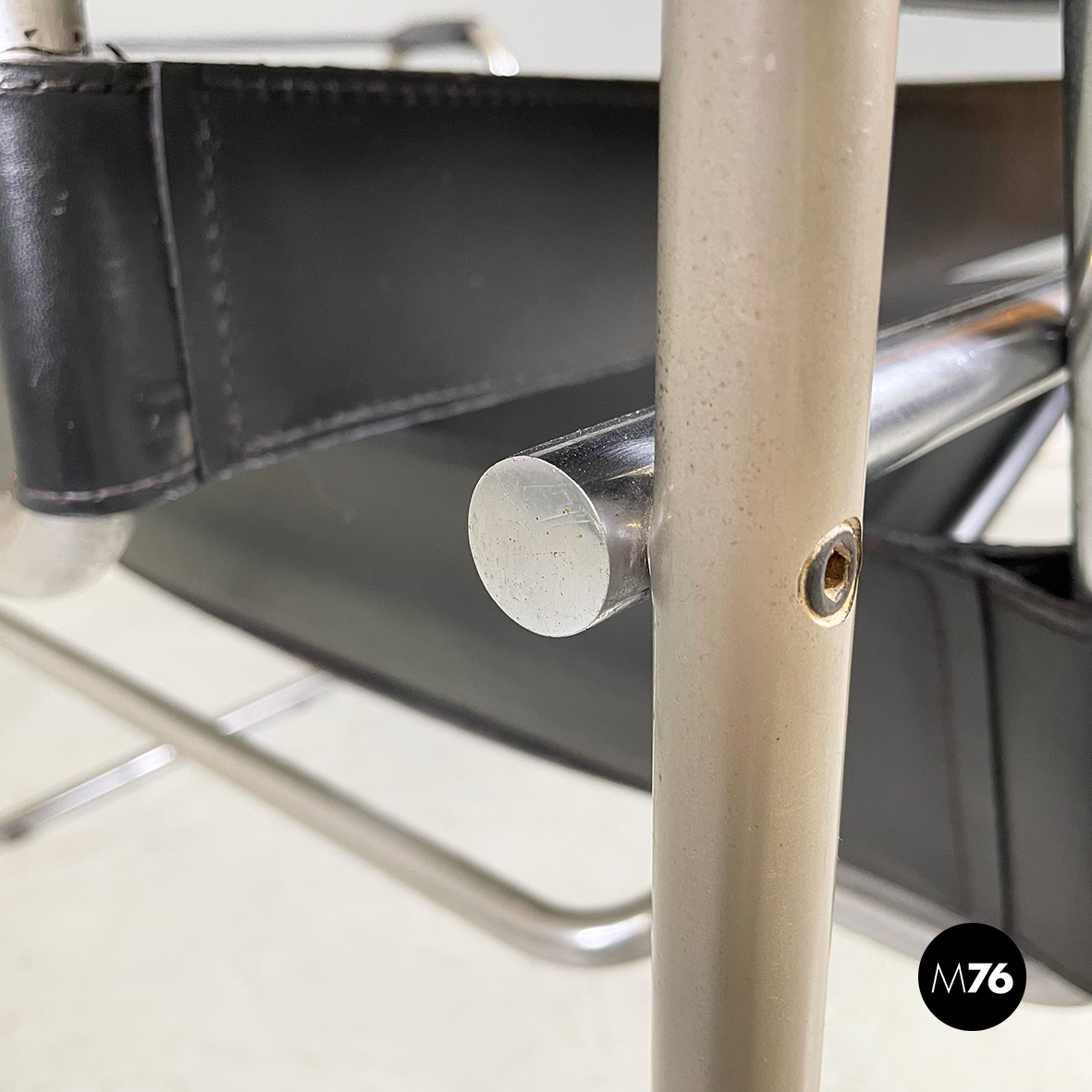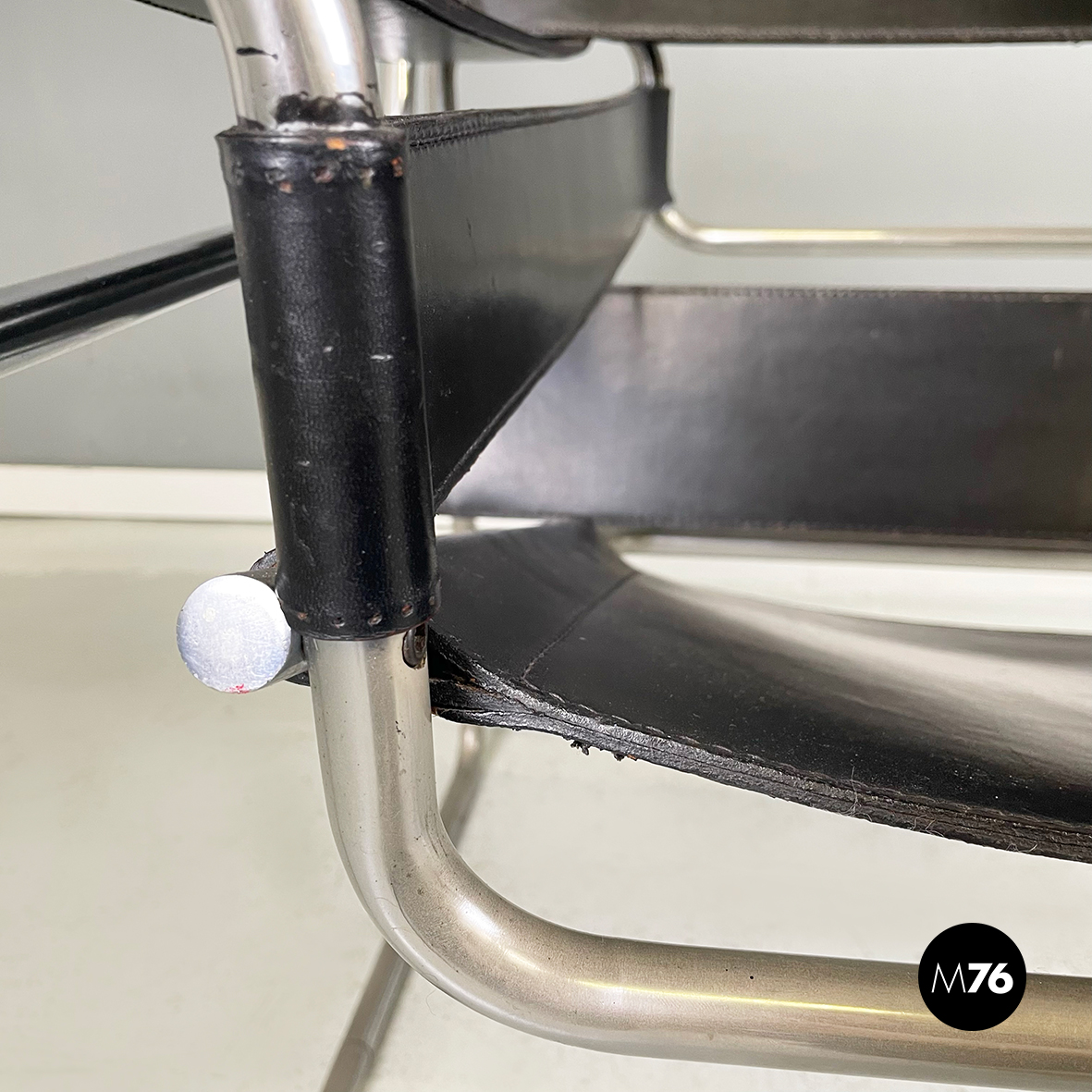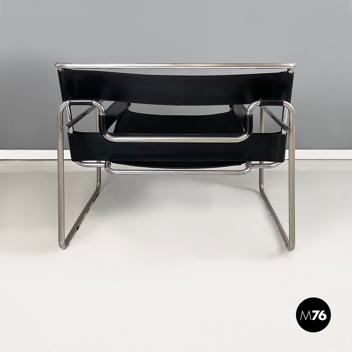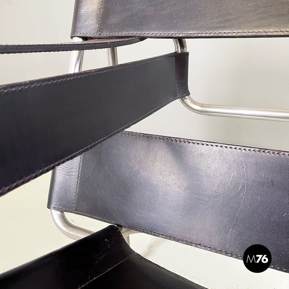 Poltrona modello Wassily o B3, con struttura in tubolare di acciaio cromato. La seduta, i braccioli e lo schienale sono composti da fasce interamente in pelle di colore nero, con cuciture a vista.
