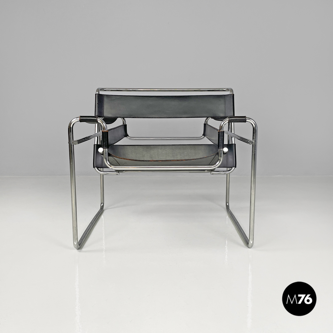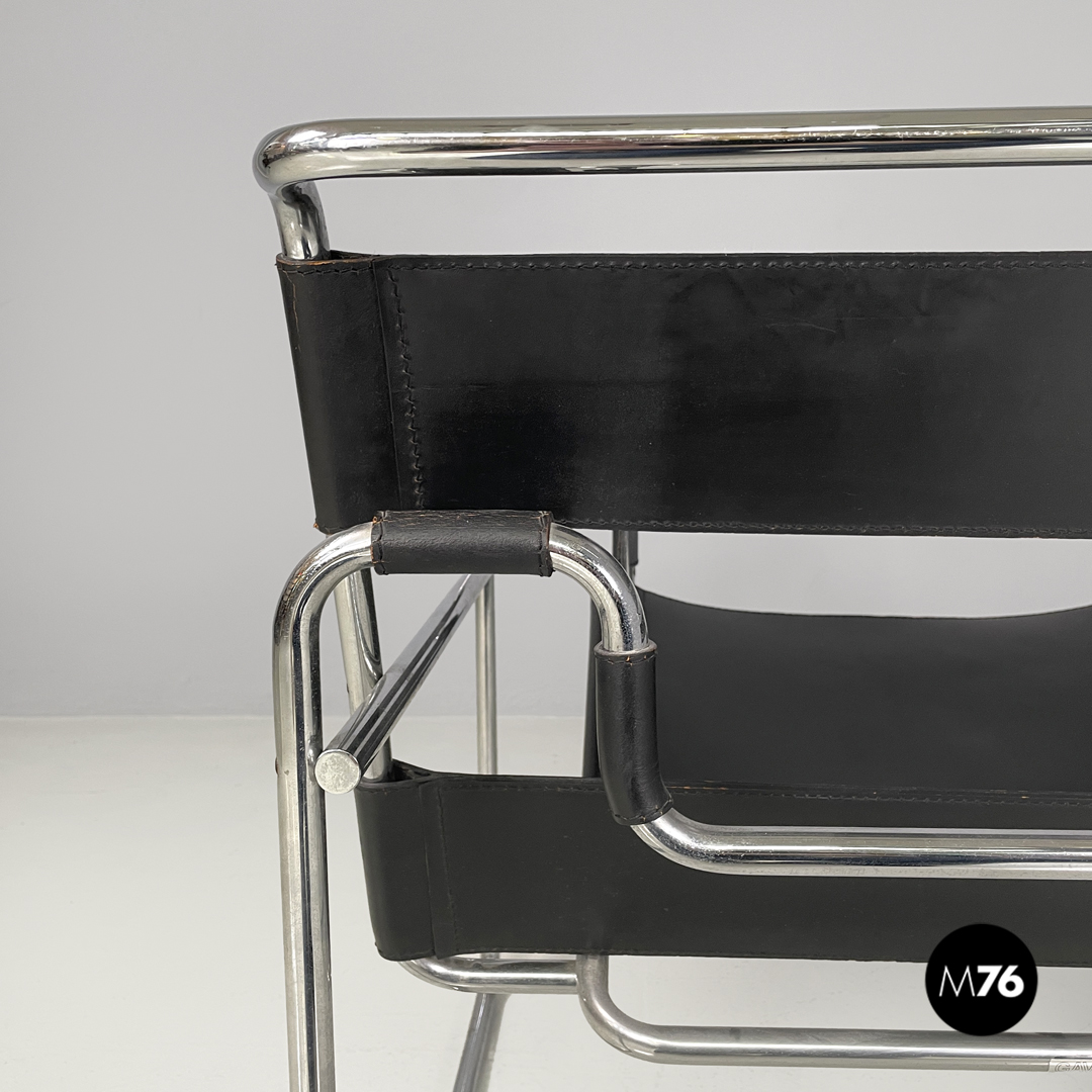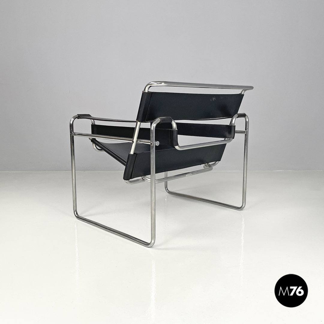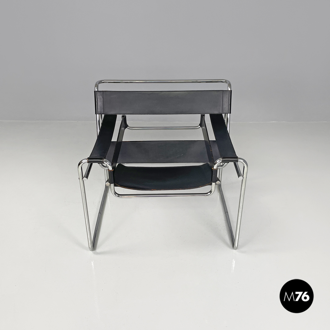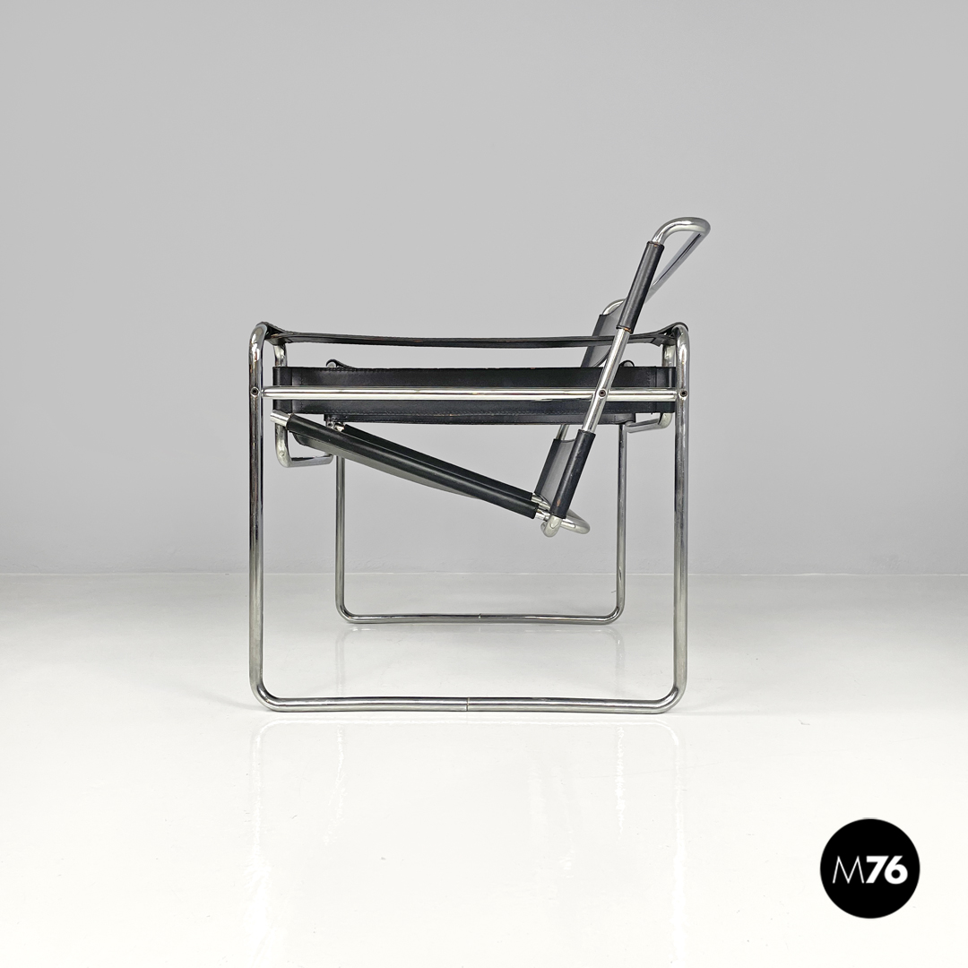 Poltrona modello Wassily o B3, con struttura in tubolare di acciaio cromato. La seduta, i braccioli e lo schienale sono composti da fasce interamente in pelle di colore nero con cuciture a vista.
