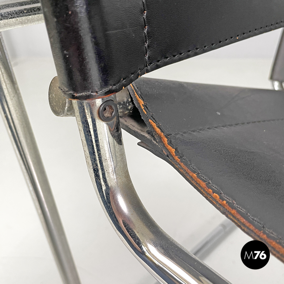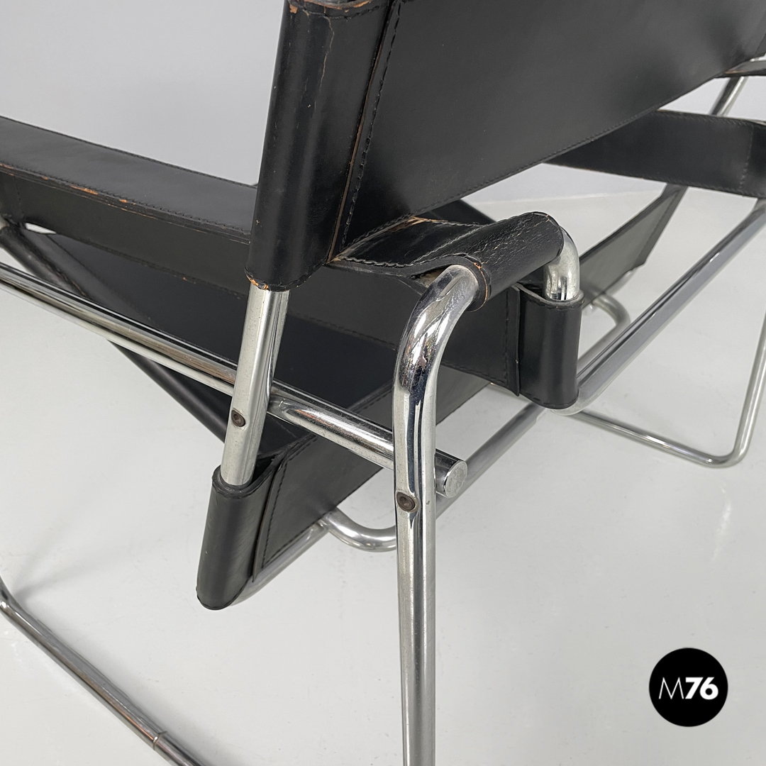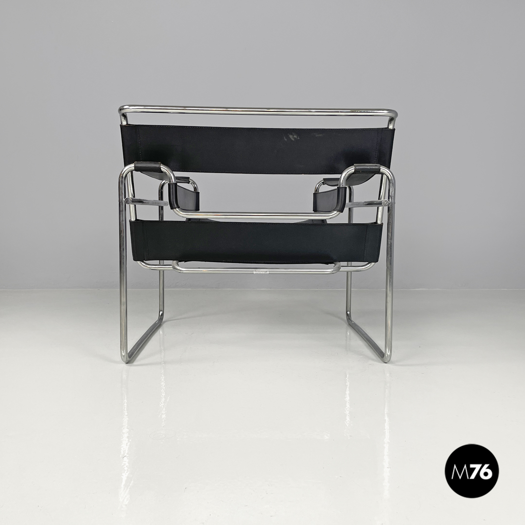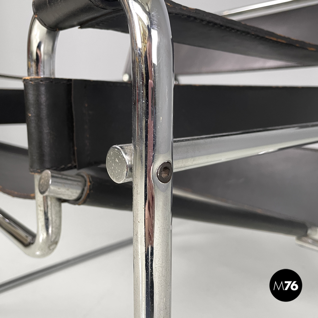 Poltrona modello Wassily o B3, con struttura in tubolare di acciaio cromato. La seduta, i braccioli e lo schienale sono composti da fasce interamente in pelle di colore nero con cuciture a vista.