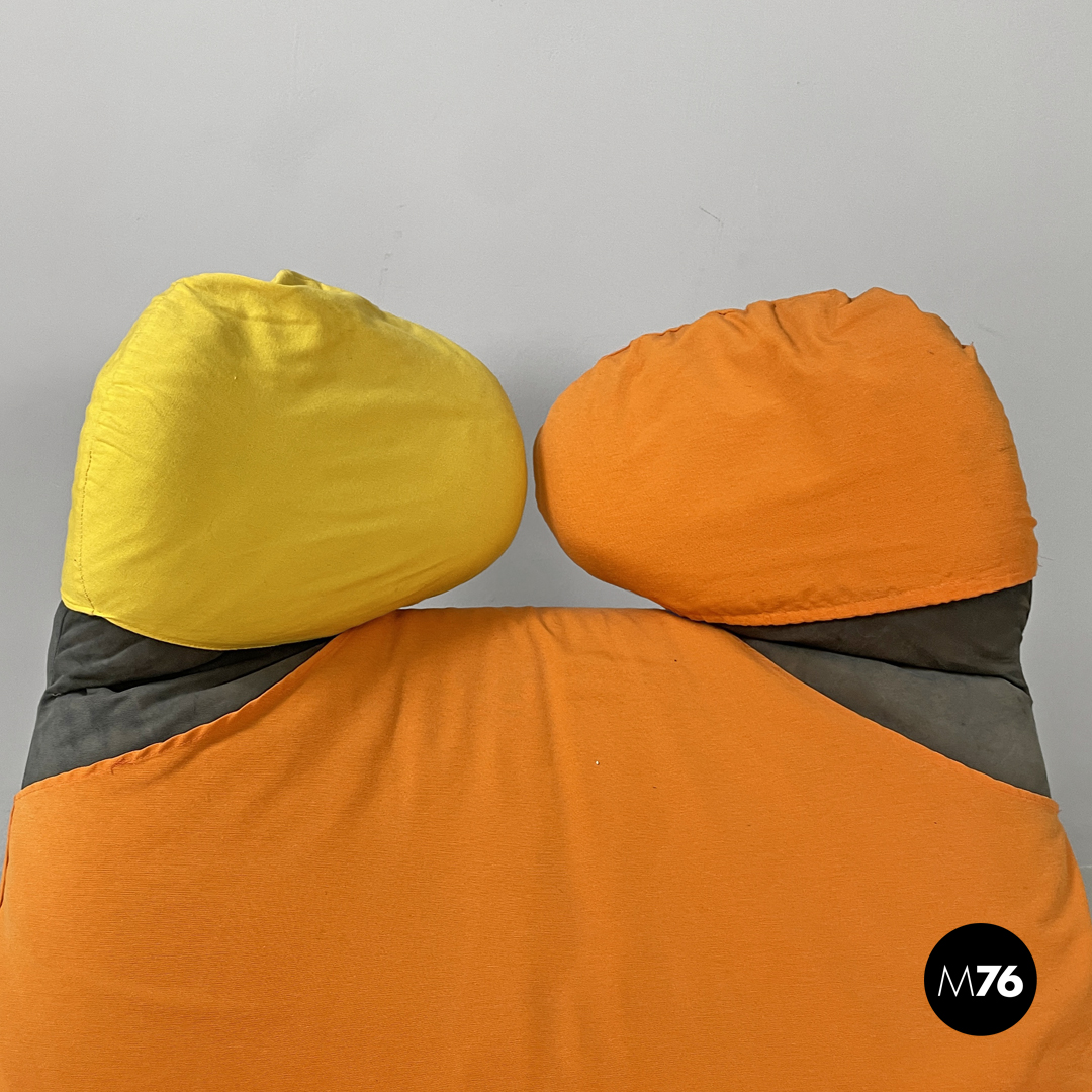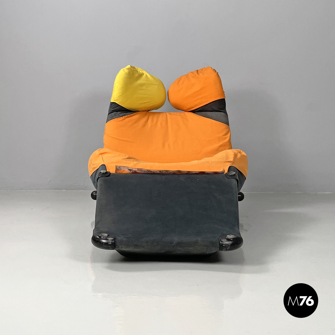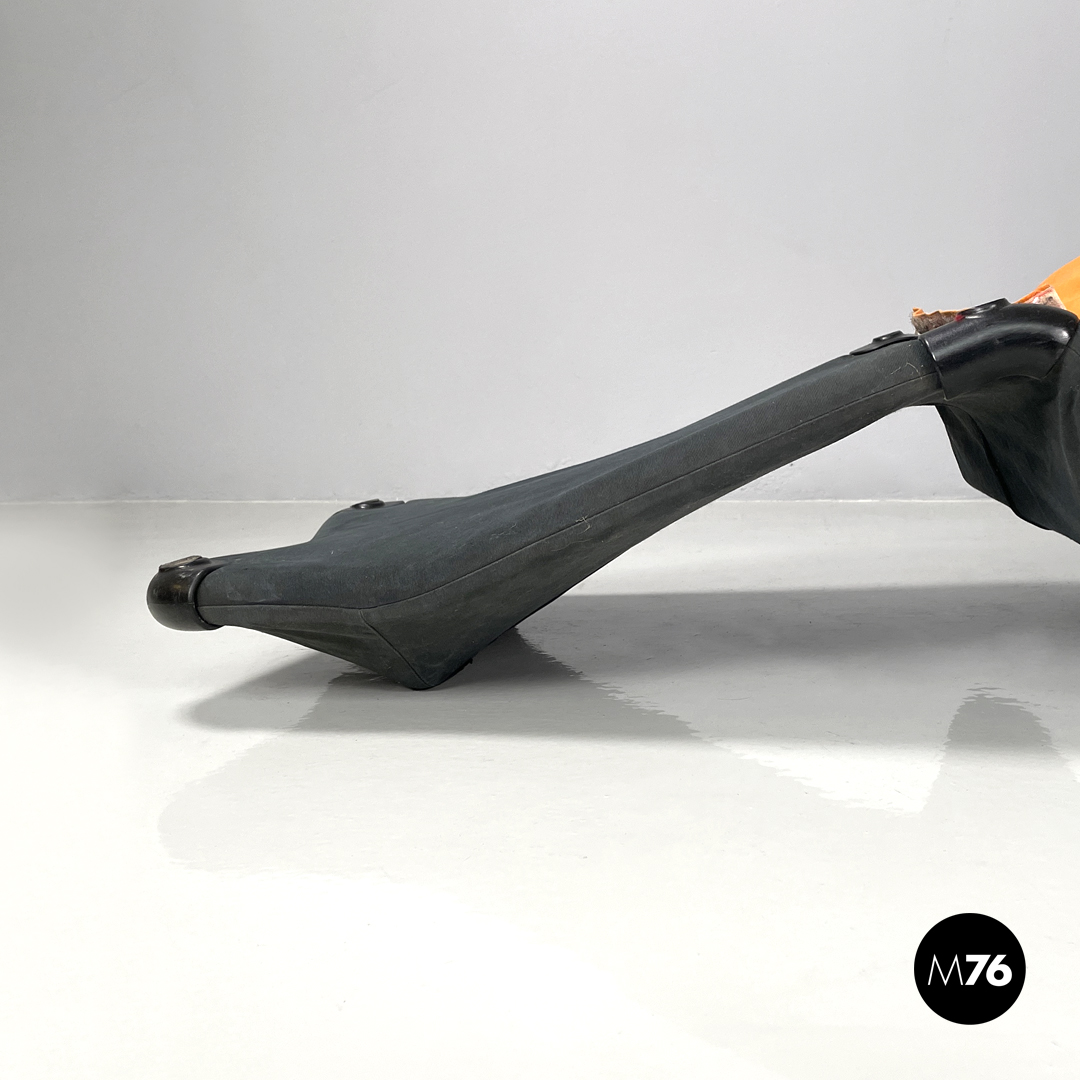 Poltrona o chaise longue modello Wink reclinabile e allungabile. La struttura segue delle linee morbide, curve ed accoglienti, lo schienale termina con due elementi tondeggianti reclinabili. Può essere trasformata da poltrona a chaise longue “estraendo” da sotto la seduta la parte allungata per poggiare i piedi. Il rivestimento in tessuto è di colore nero con parti in tessuto arancione e giallo, l’appoggio a terra è dato da piedini in plastica nera.