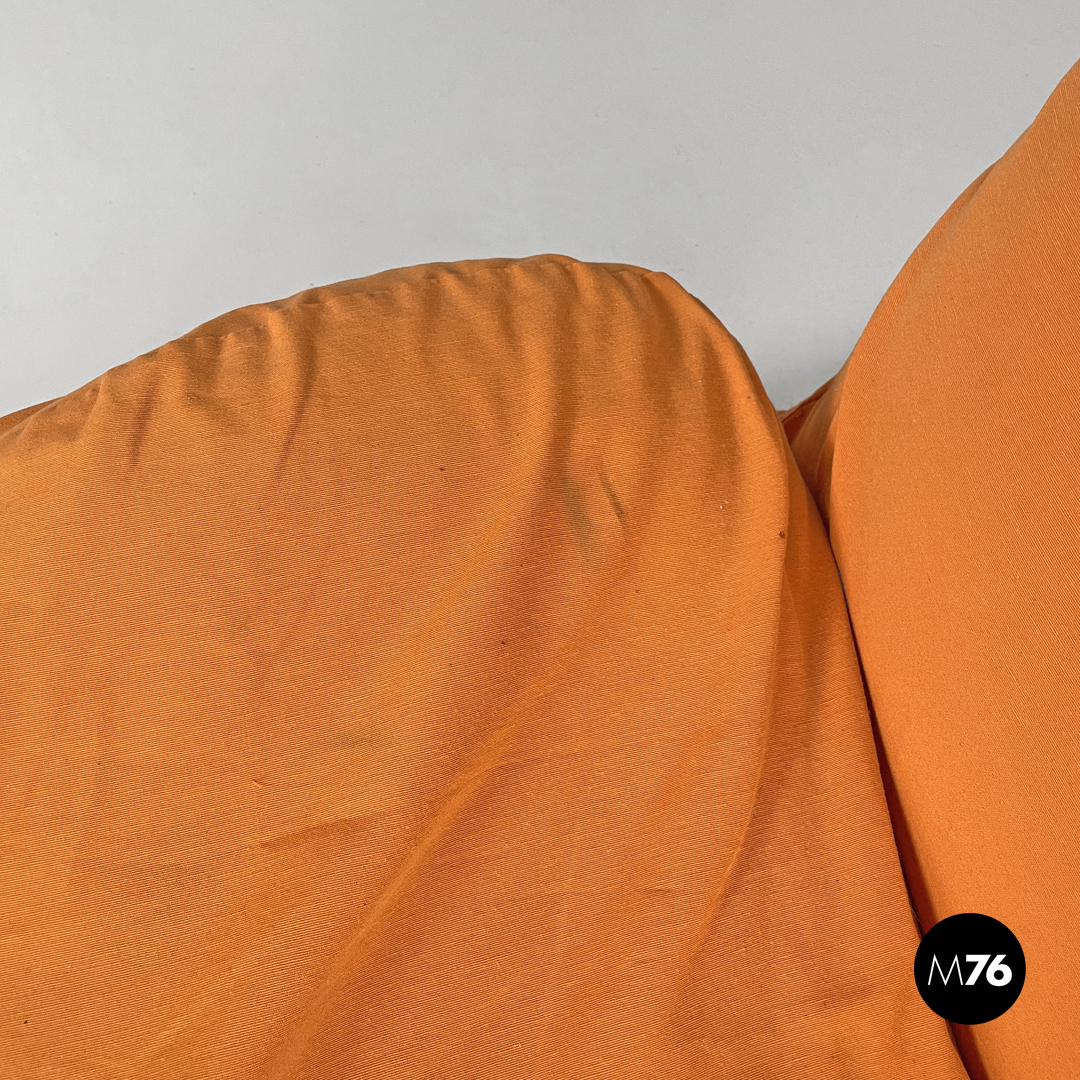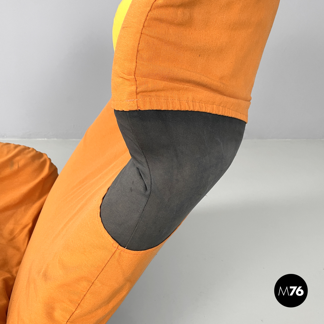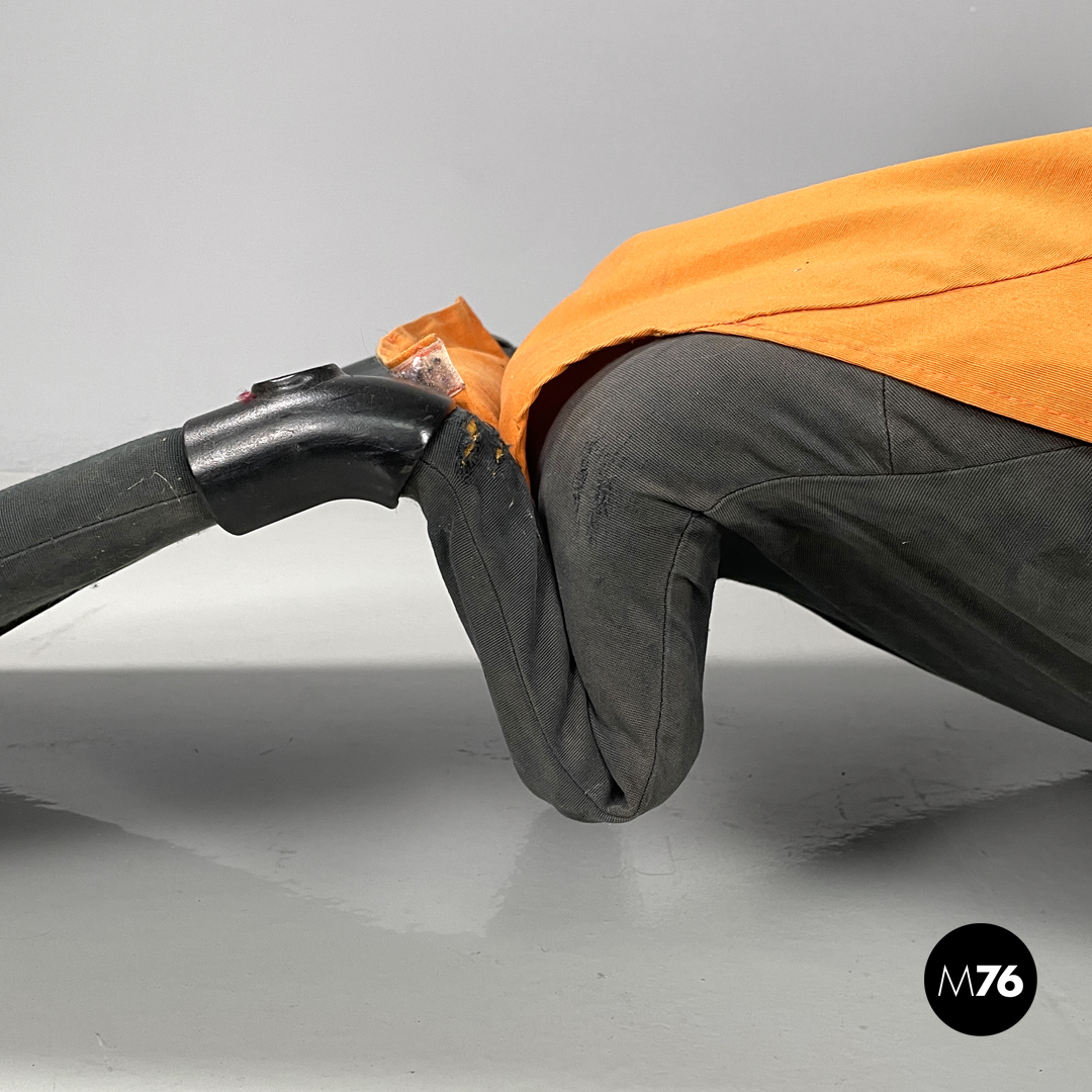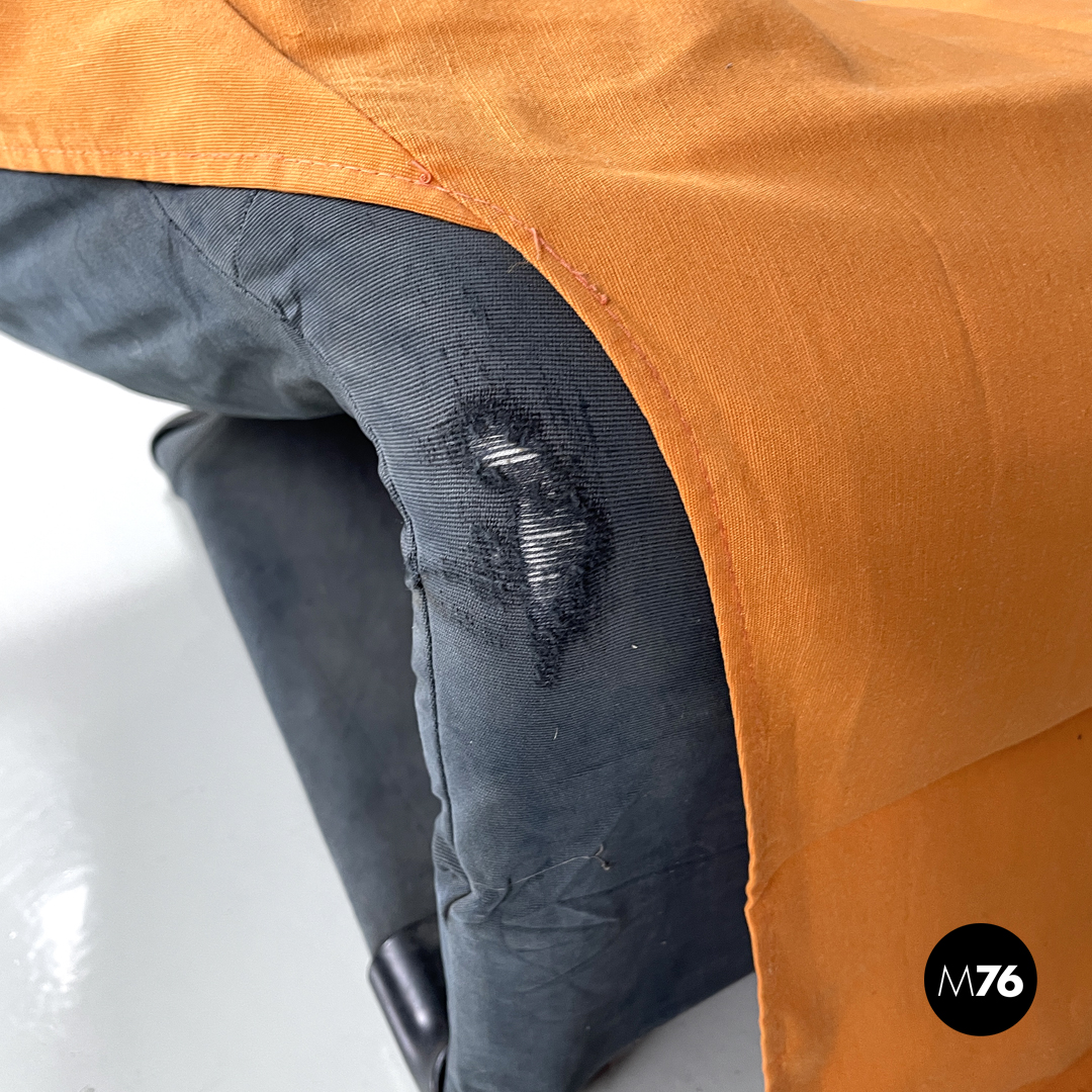 Poltrona o chaise longue modello Wink reclinabile e allungabile. La struttura segue delle linee morbide, curve ed accoglienti, lo schienale termina con due elementi tondeggianti reclinabili. Può essere trasformata da poltrona a chaise longue “estraendo” da sotto la seduta la parte allungata per poggiare i piedi. Il rivestimento in tessuto è di colore nero con parti in tessuto arancione e giallo, l’appoggio a terra è dato da piedini in plastica nera.