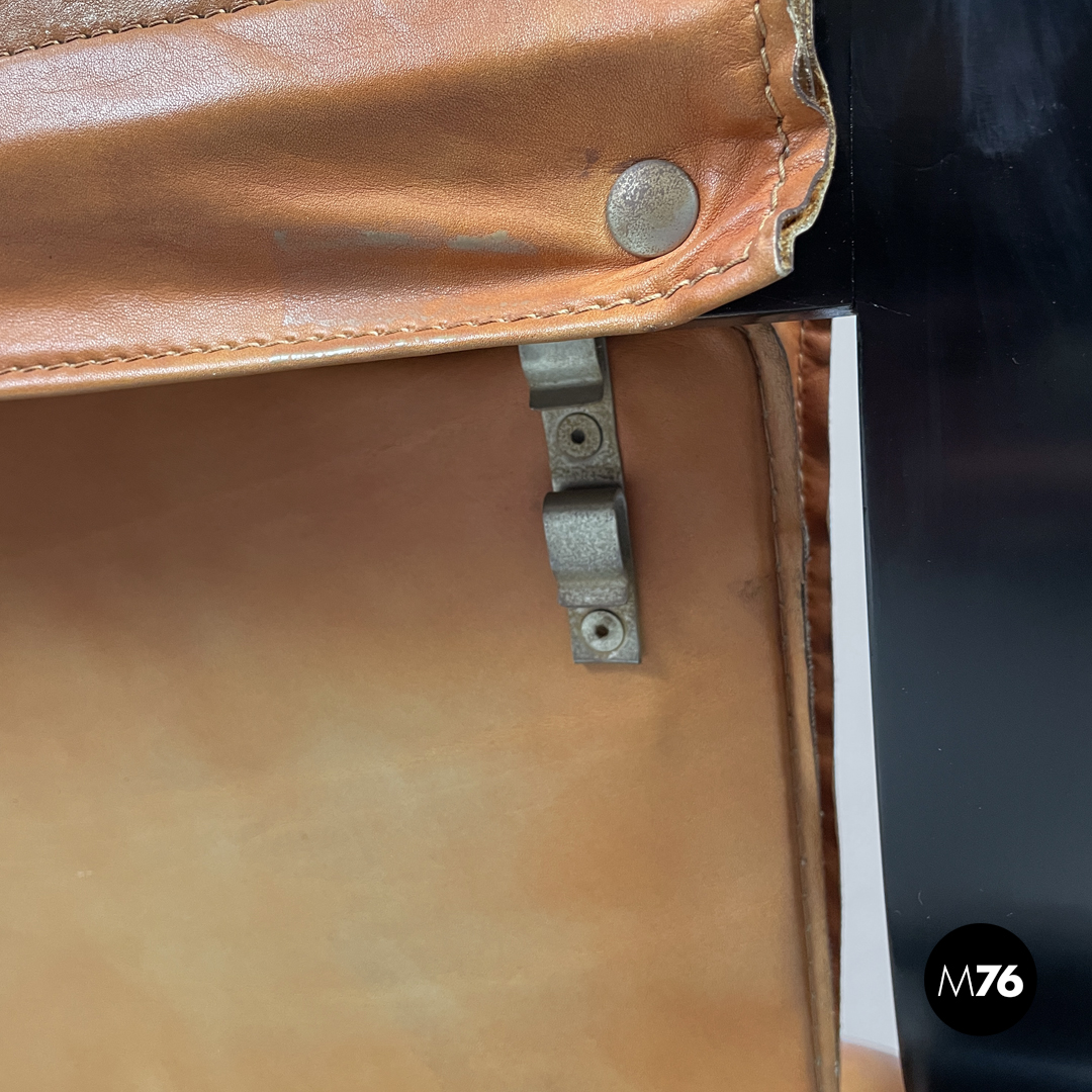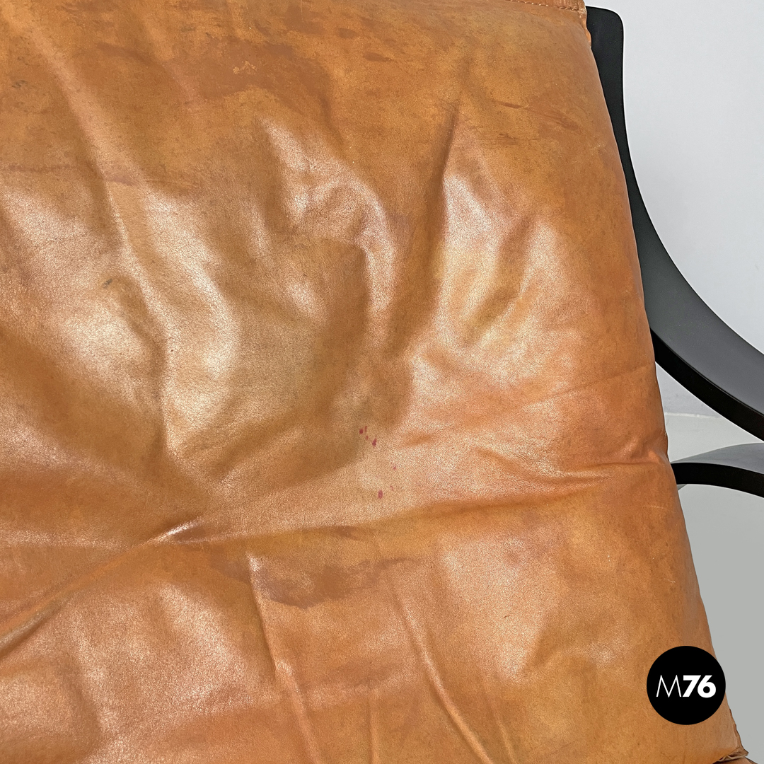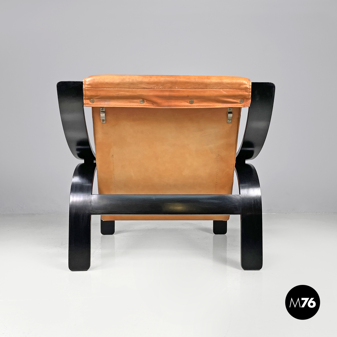 Poltrona modello Woodline in pelle marrone. La struttura è in legno laccato nero, le gambe, lo schienale e i braccioli seguono linee curve e morbide. La seduta e lo schienale presentano dei ganci in metallo che permettono di utilizzare la poltrona in due modalità di inclinazione.