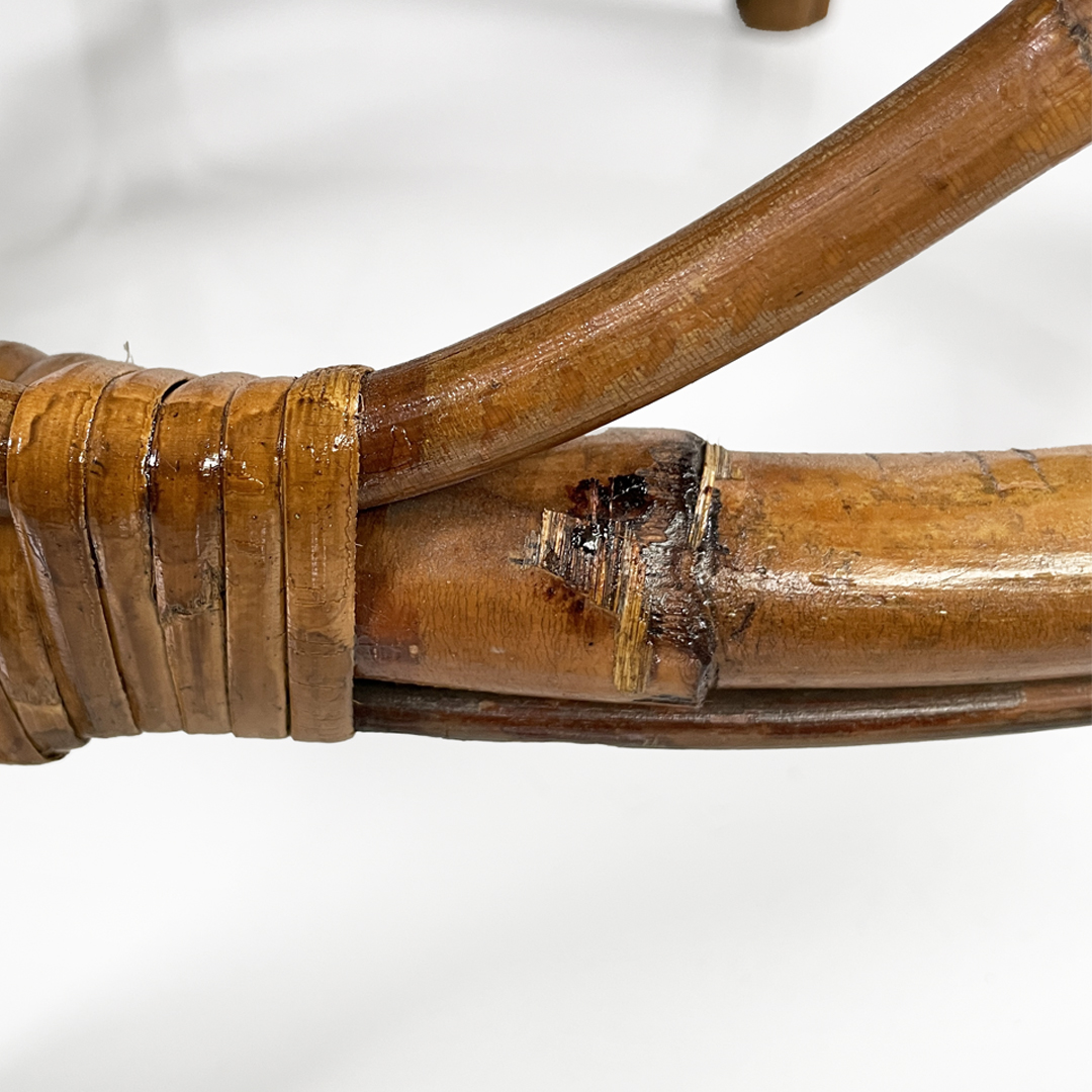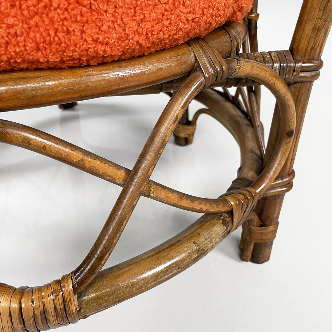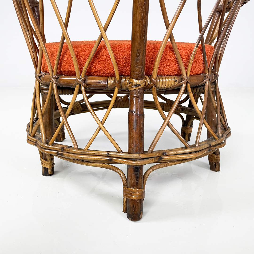 Coppia di poltrone a pozzetto interamente in rattan. Lo schienale è composto da decorazioni tondeggianti, la seduta è tonda, con quattro gambe a sezione tonda.