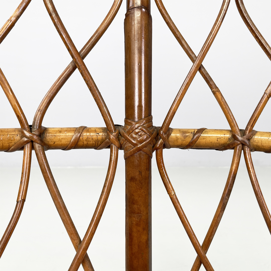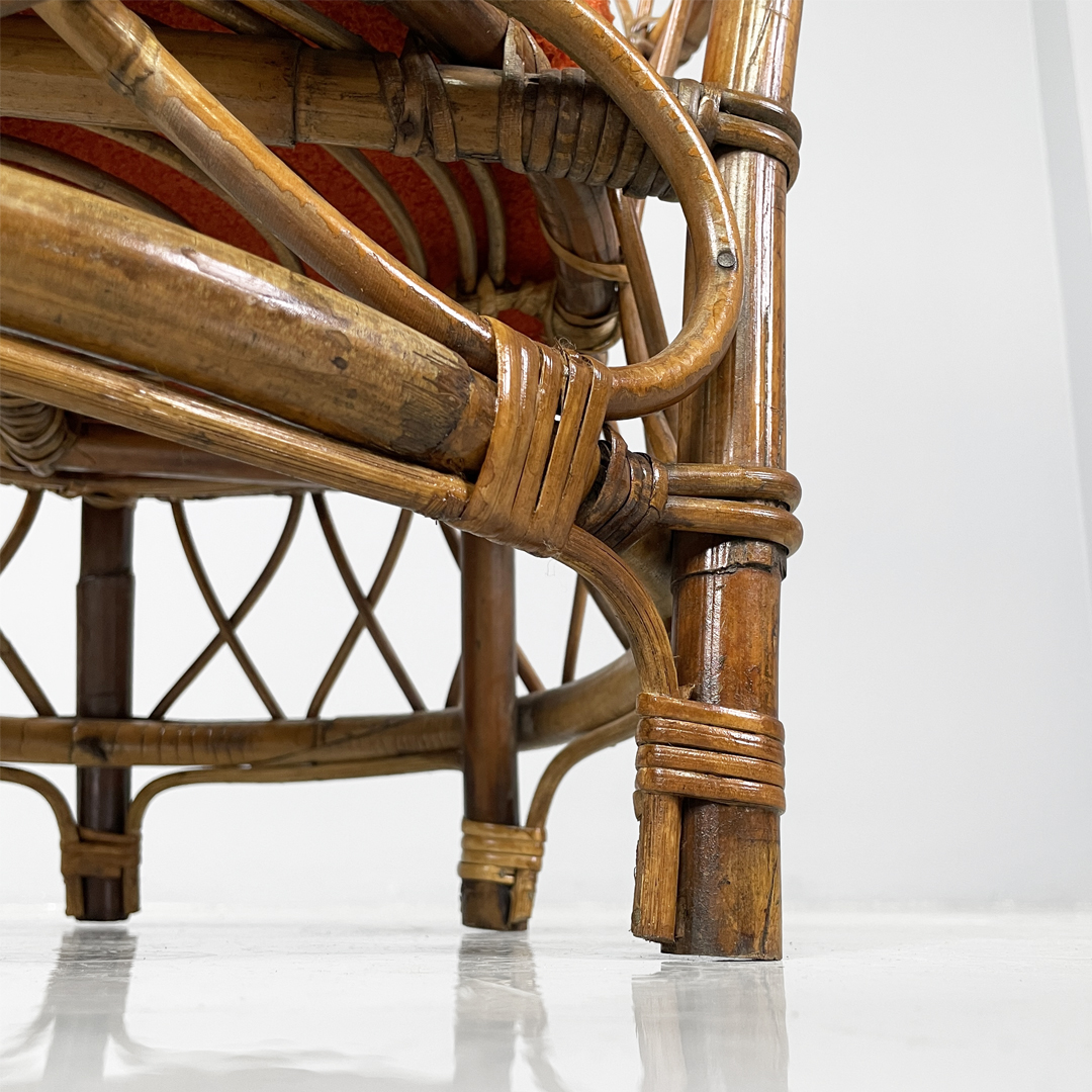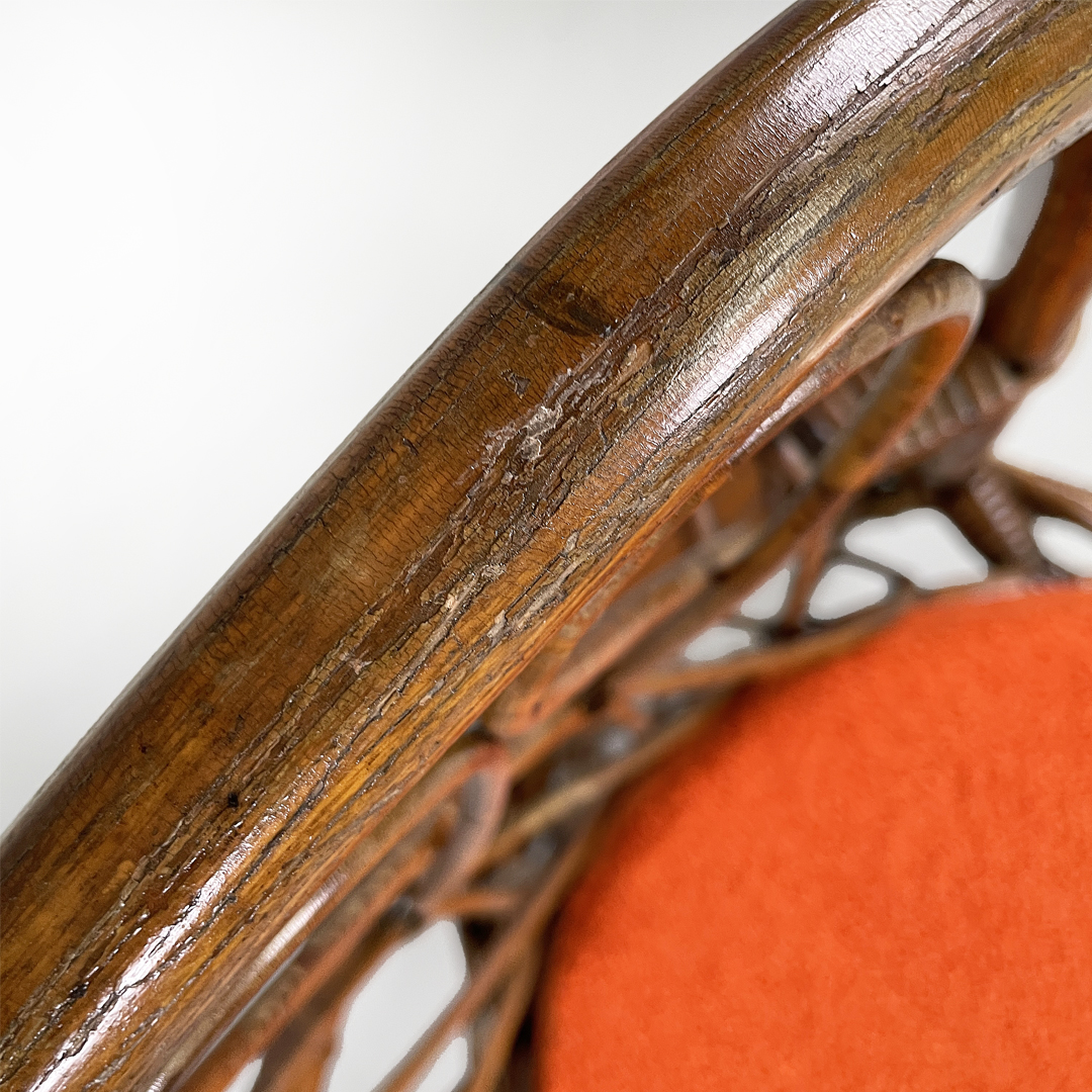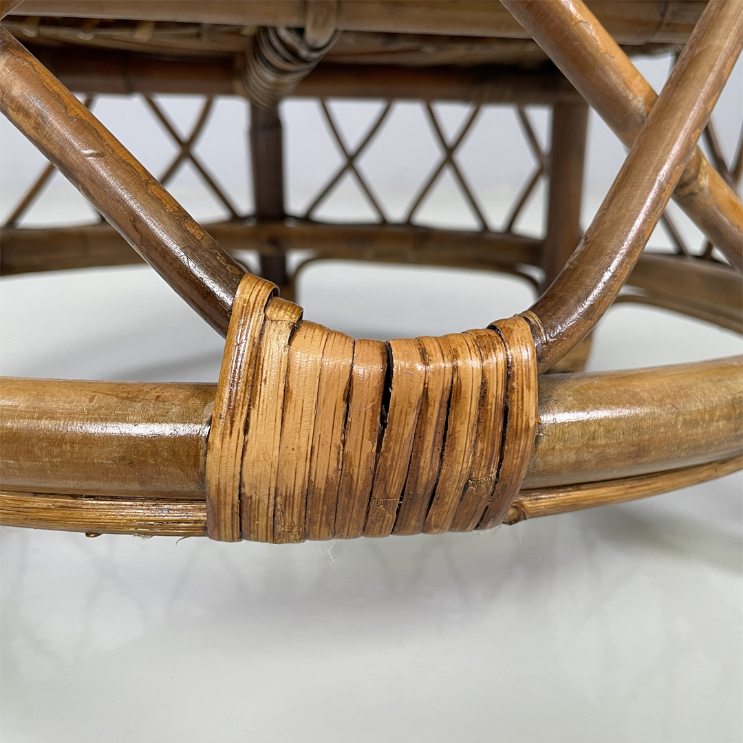 Coppia di poltrone a pozzetto interamente in rattan. Lo schienale è composto da decorazioni tondeggianti, la seduta è tonda, con quattro gambe a sezione tonda.