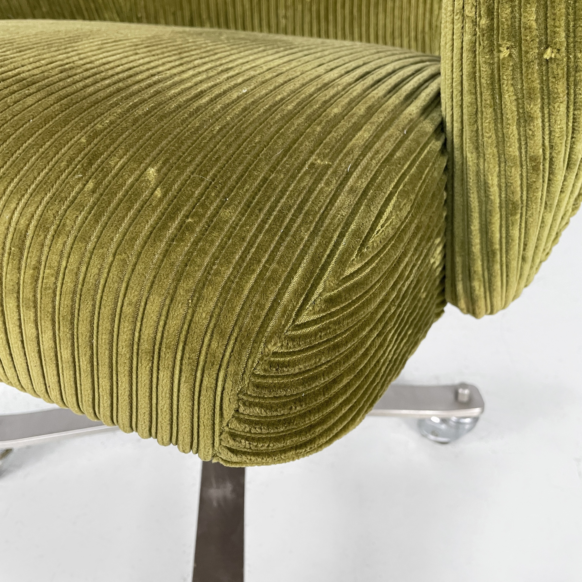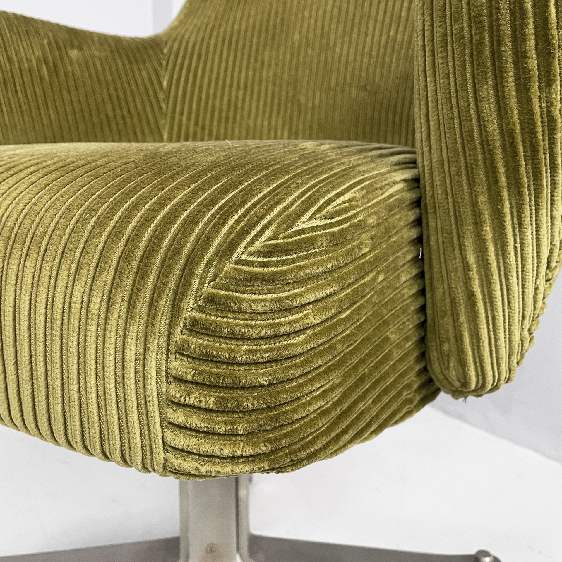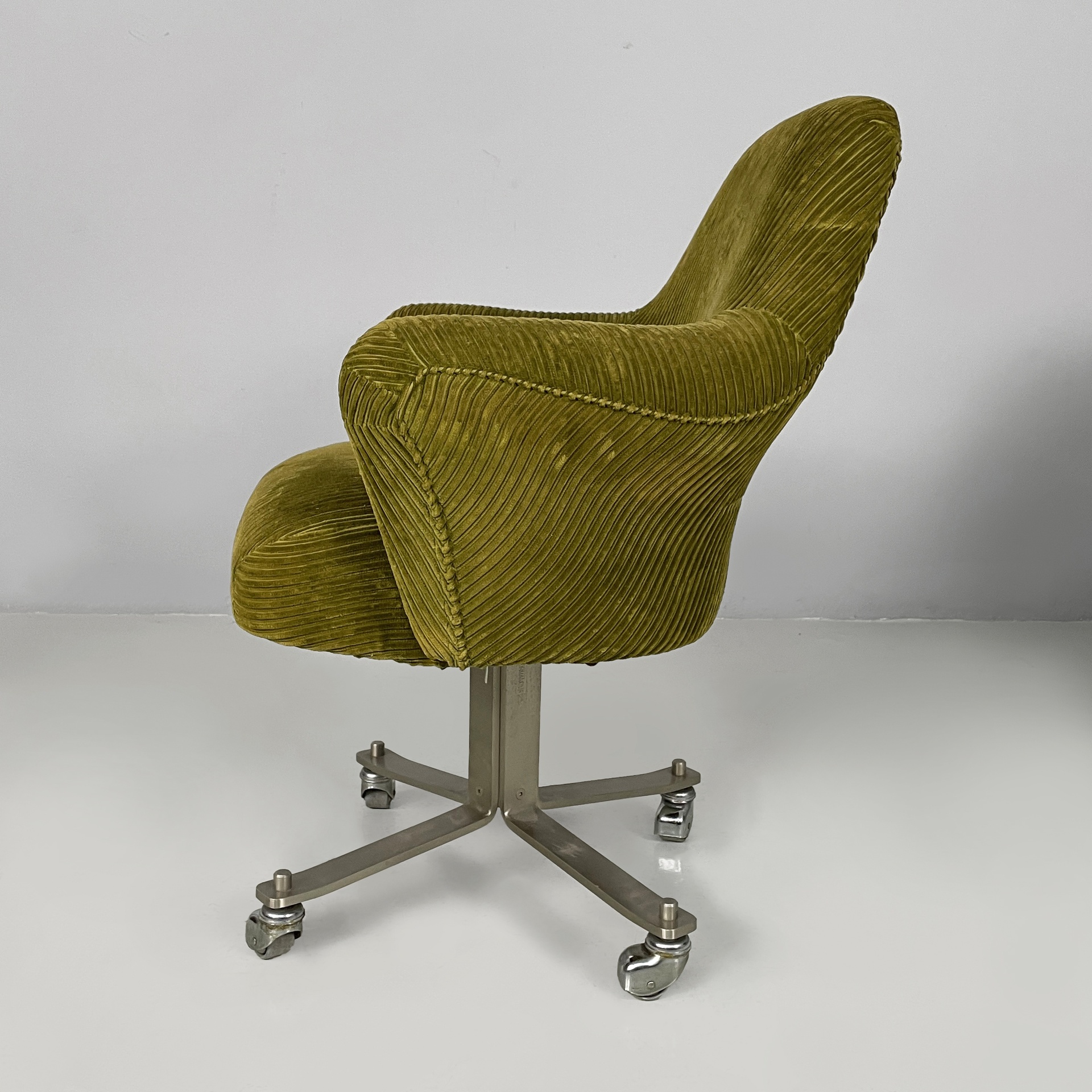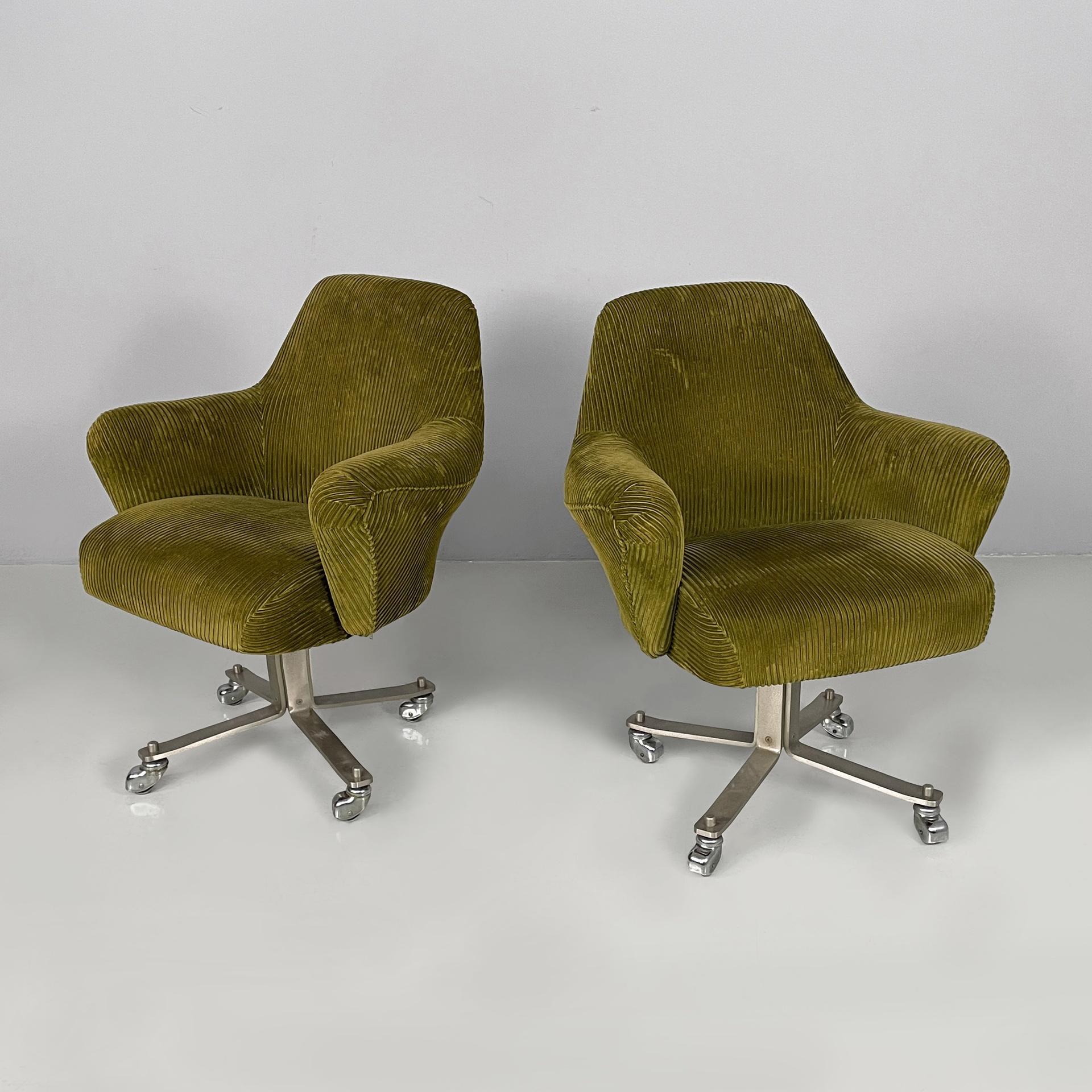 Coppia di poltrone o sedie da ufficio con seduta e schienale tondeggianti, imbottiti e rivestiti in velluto verde a coste. I braccioli sagomati sono anche essi imbottiti e rivestiti in velluto verde a coste. La zampa a quattro razze è in alluminio con ruote.