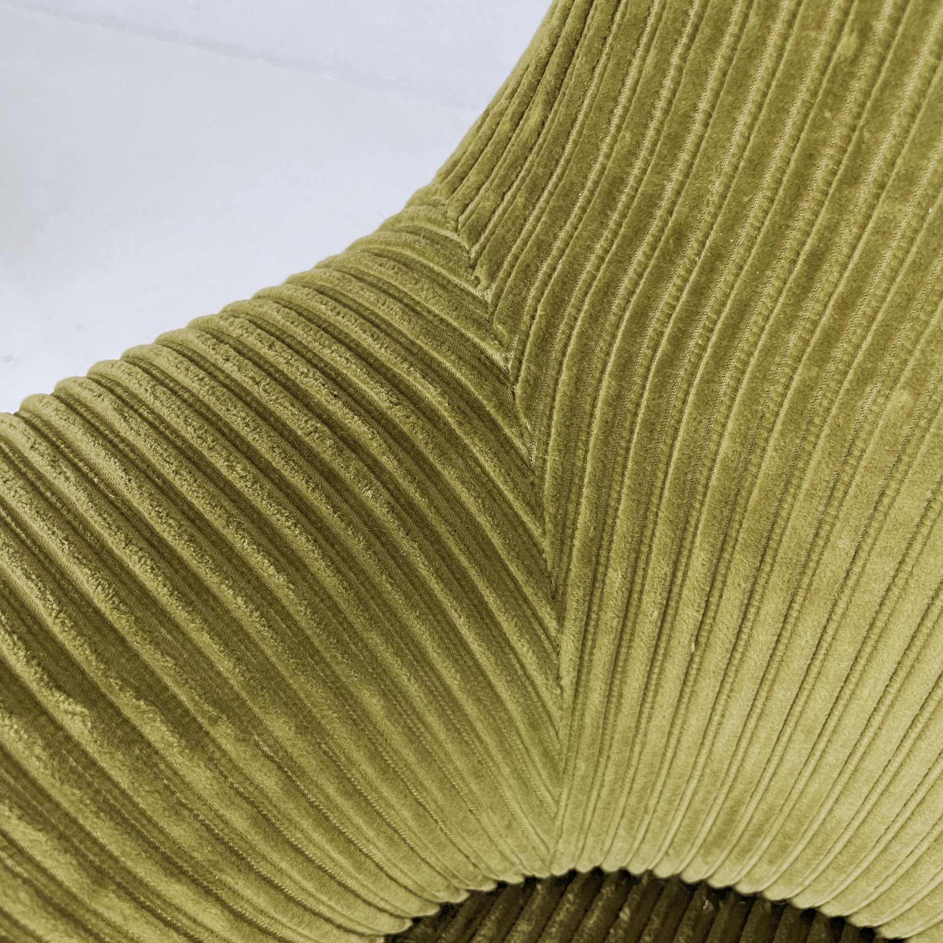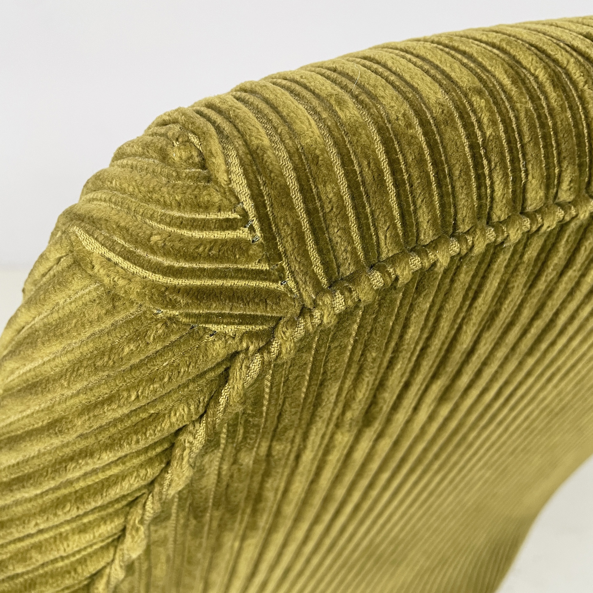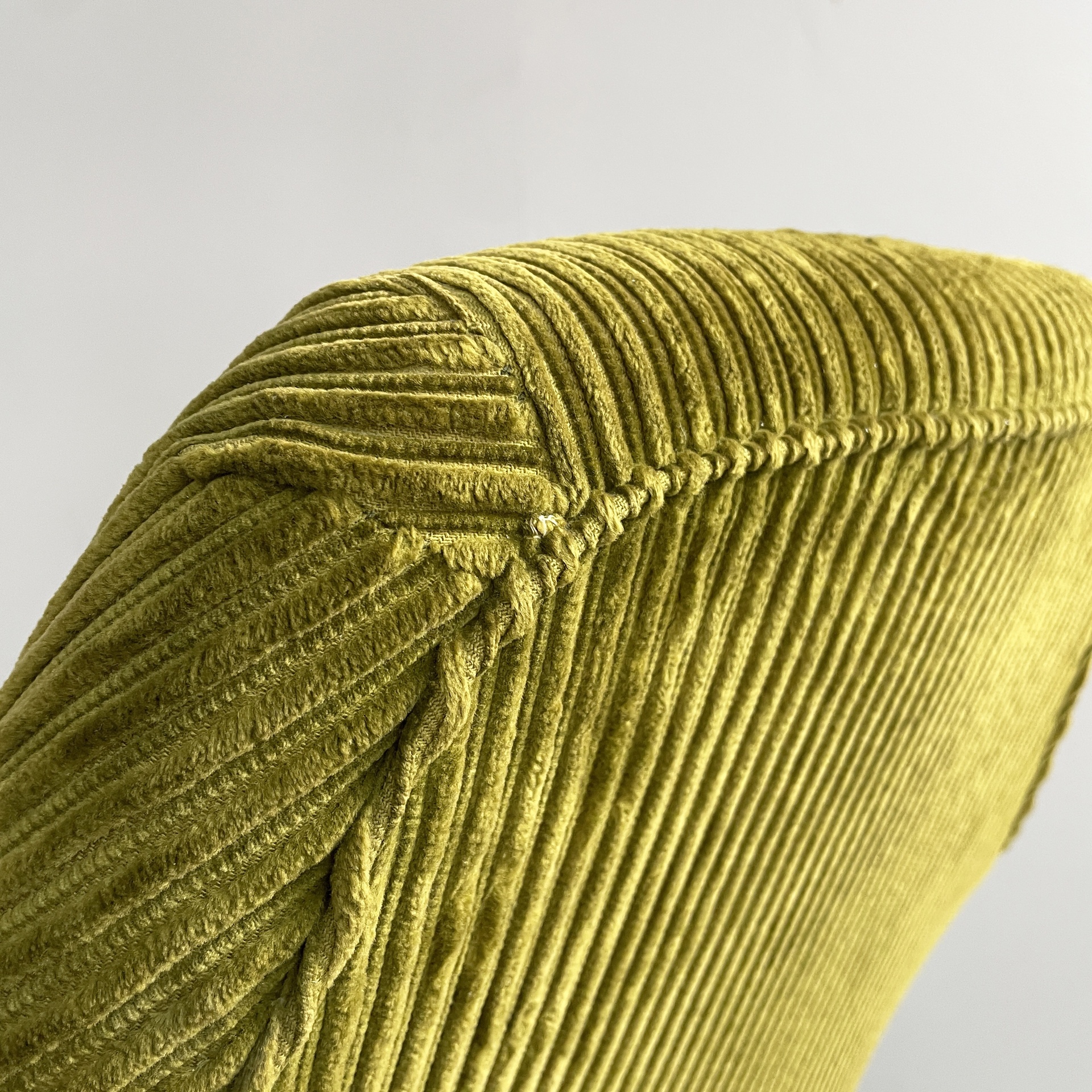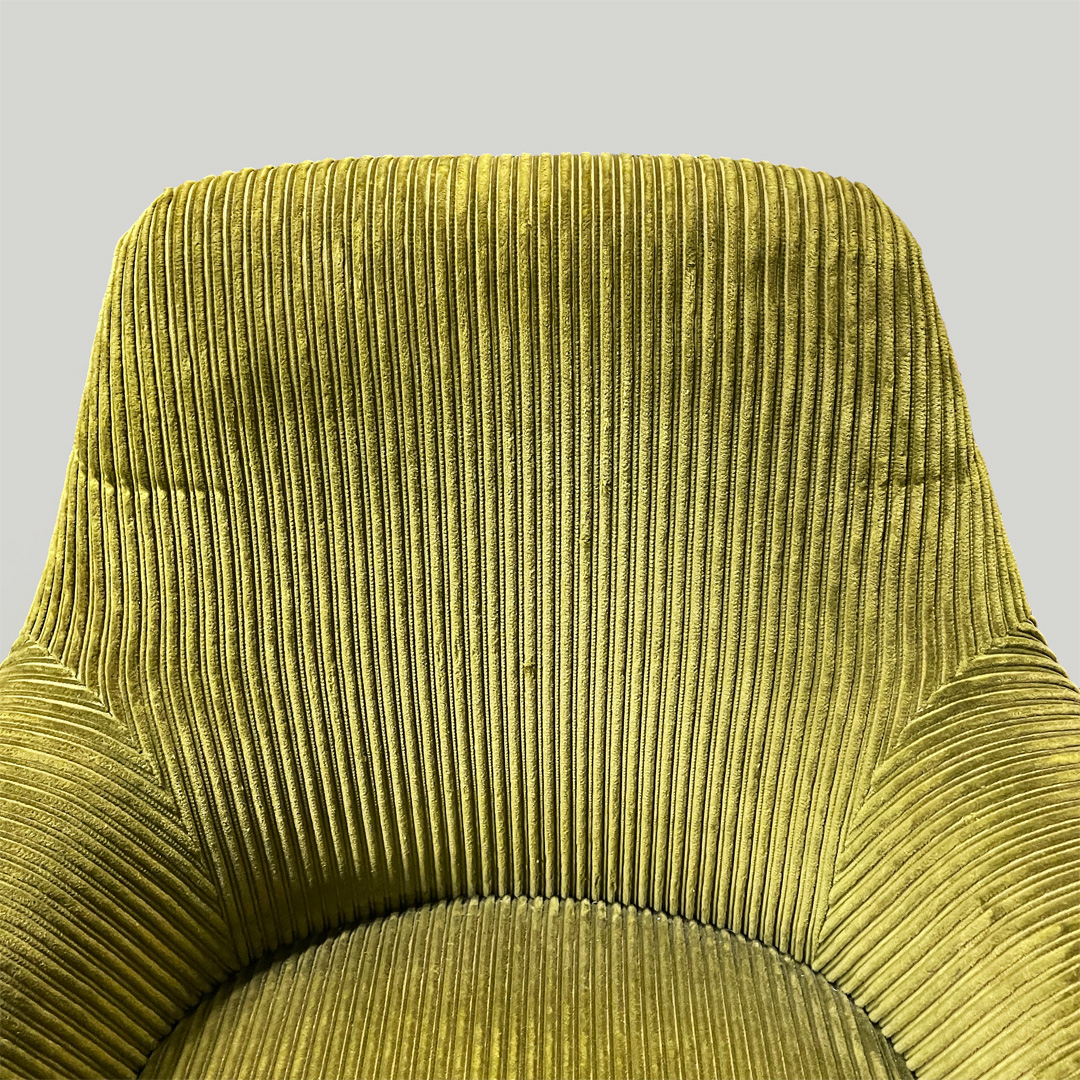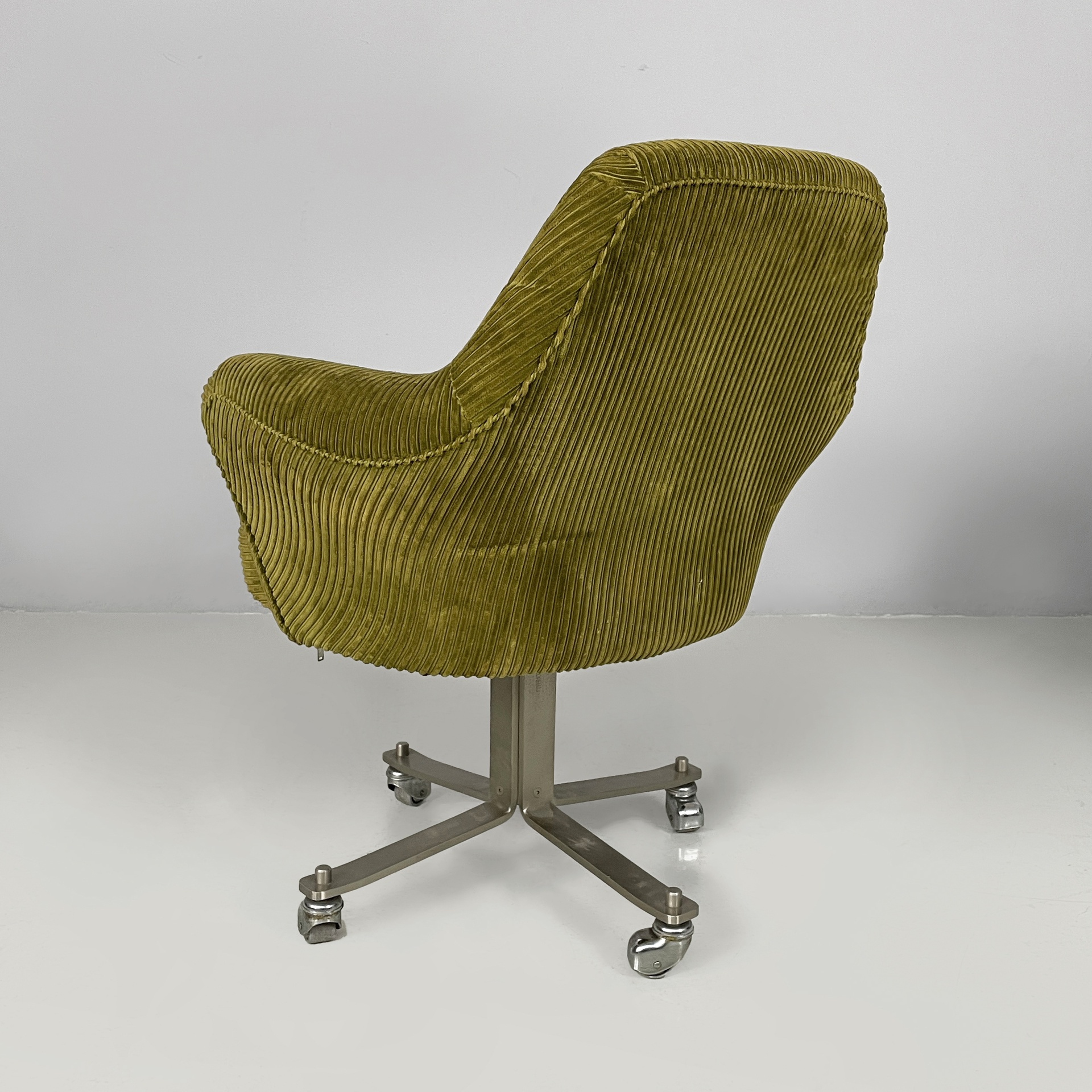 Coppia di poltrone o sedie da ufficio con seduta e schienale tondeggianti, imbottiti e rivestiti in velluto verde a coste. I braccioli sagomati sono anche essi imbottiti e rivestiti in velluto verde a coste. La zampa a quattro razze è in alluminio con ruote.