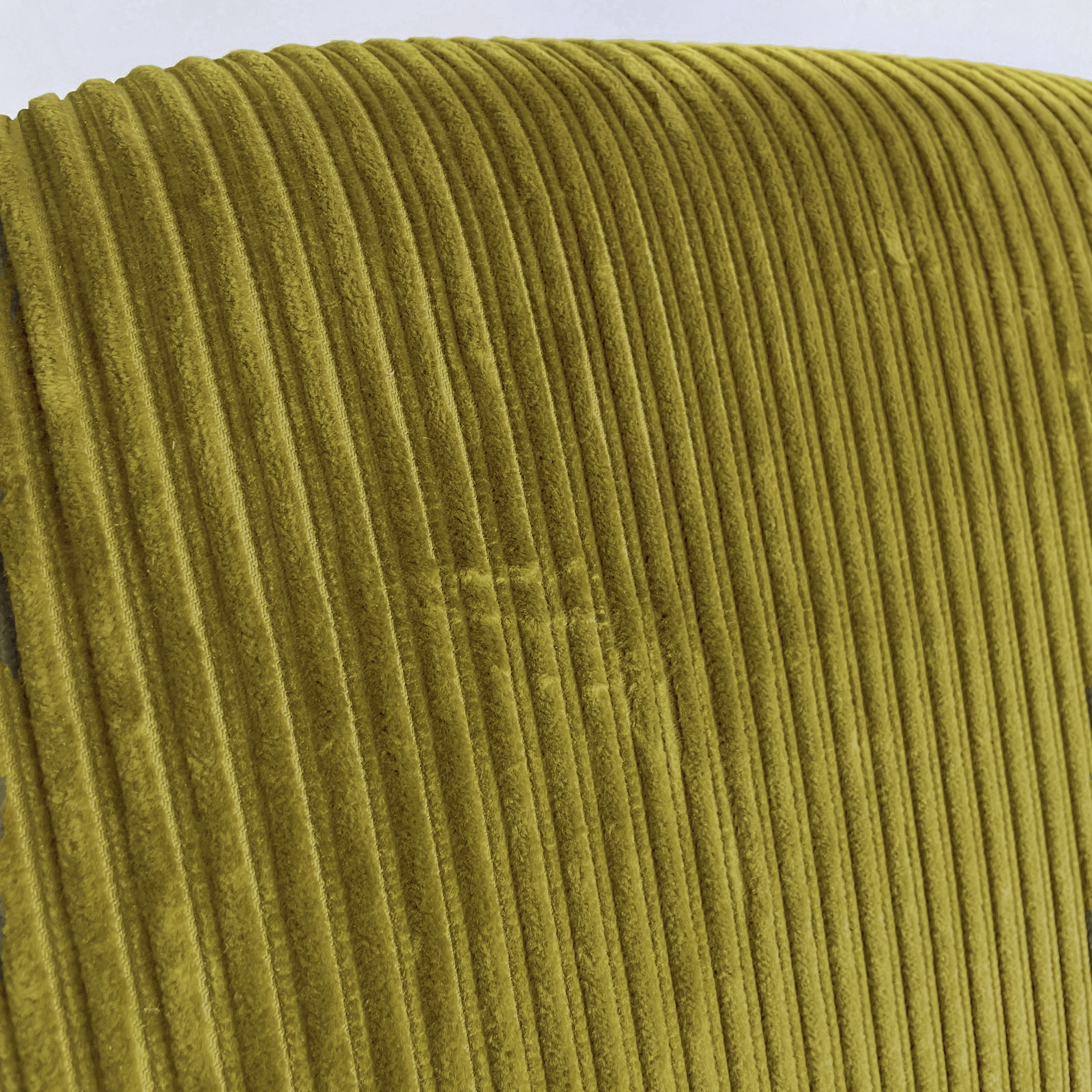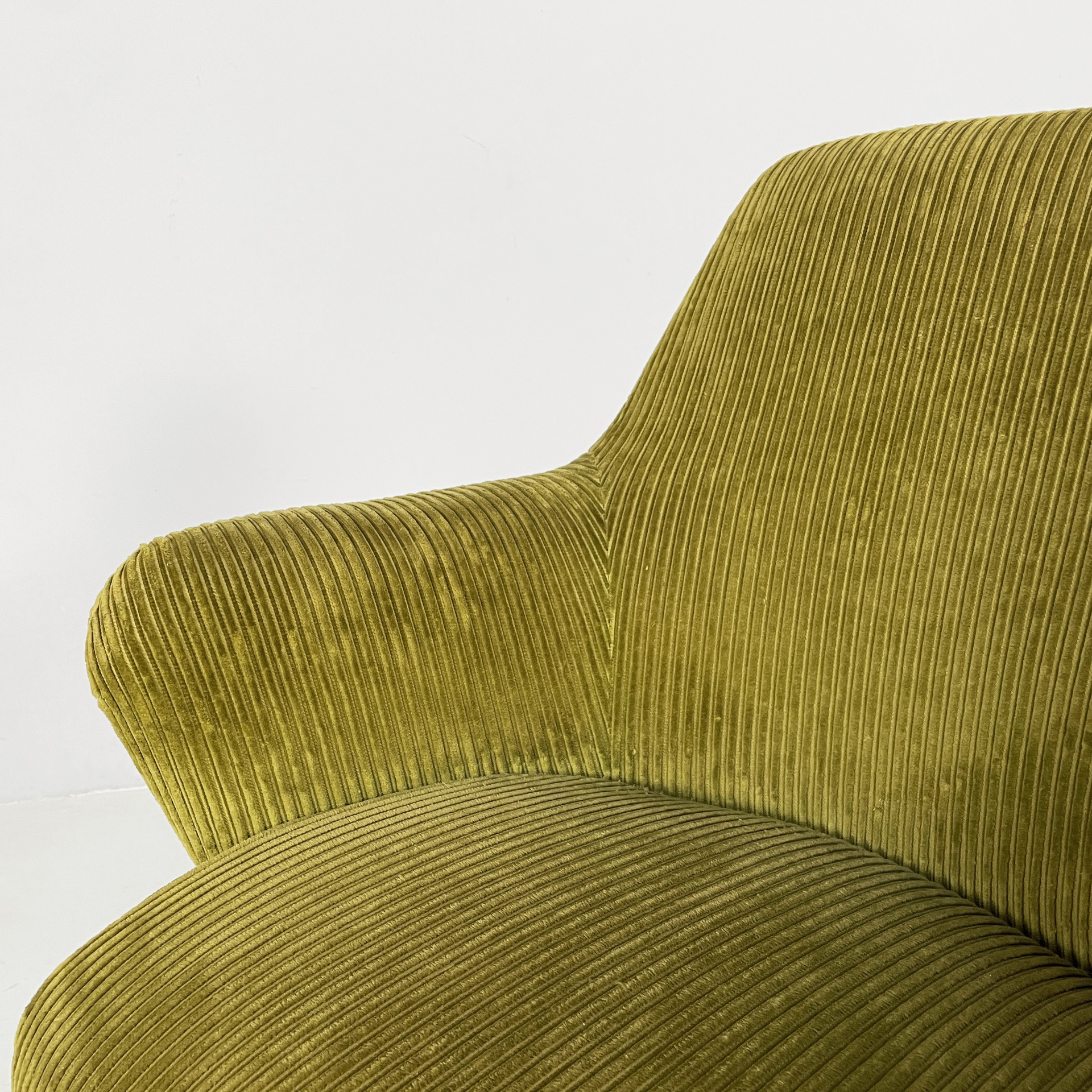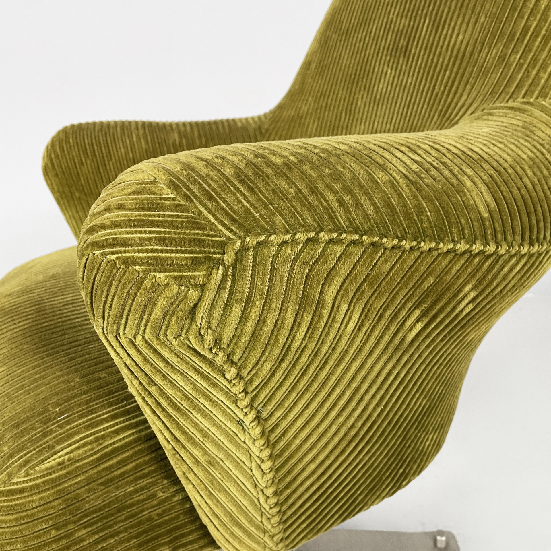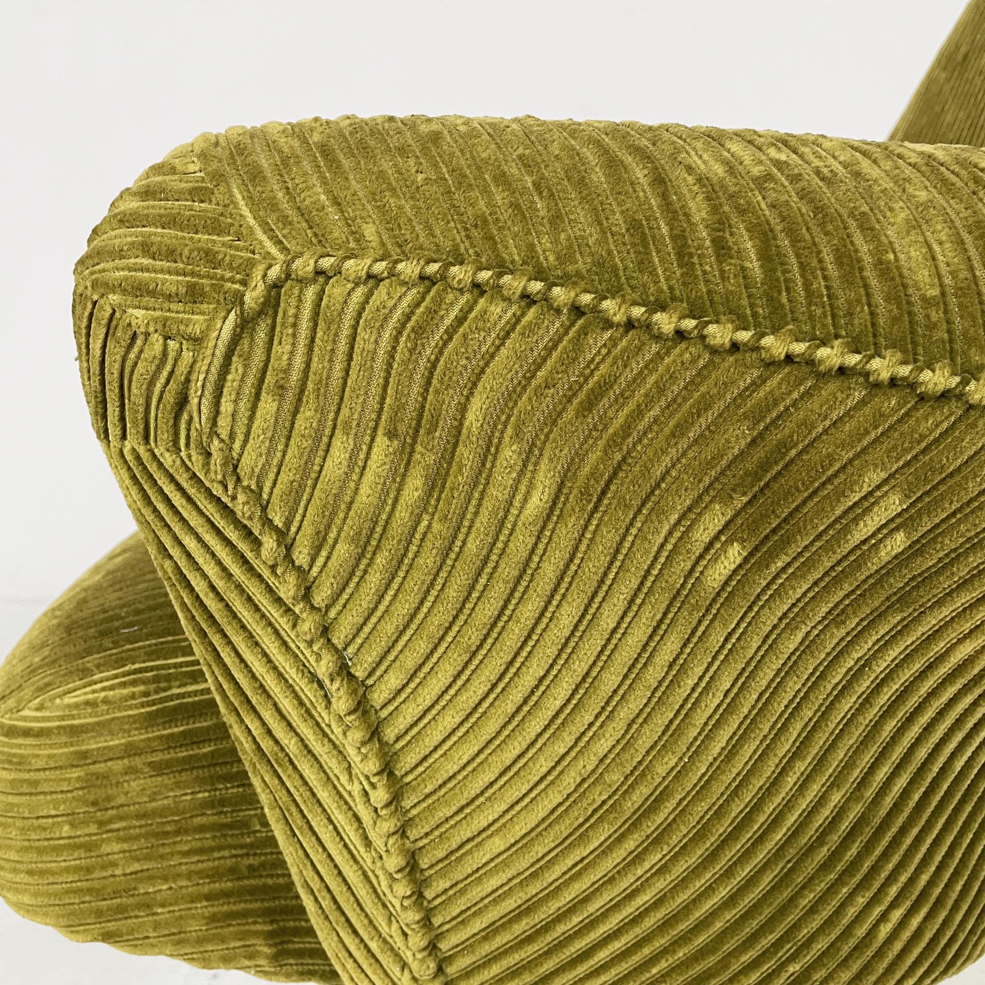 Coppia di poltrone o sedie da ufficio con seduta e schienale tondeggianti, imbottiti e rivestiti in velluto verde a coste. I braccioli sagomati sono anche essi imbottiti e rivestiti in velluto verde a coste. La zampa a quattro razze è in alluminio con ruote.